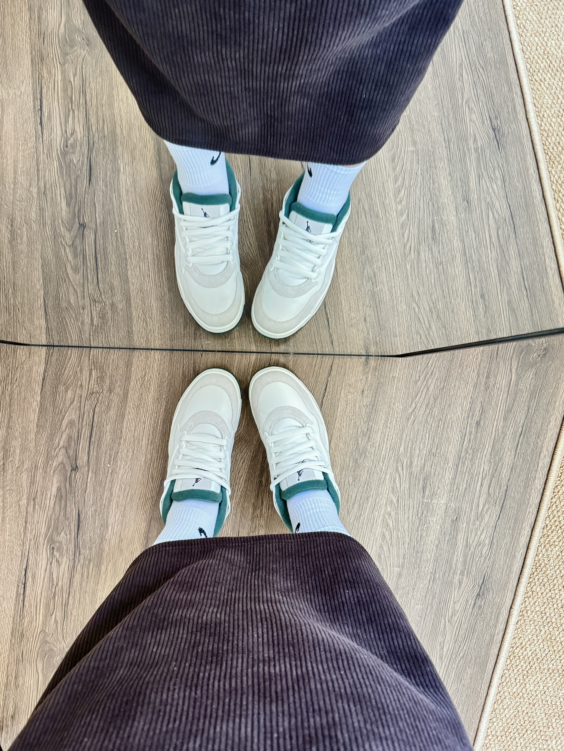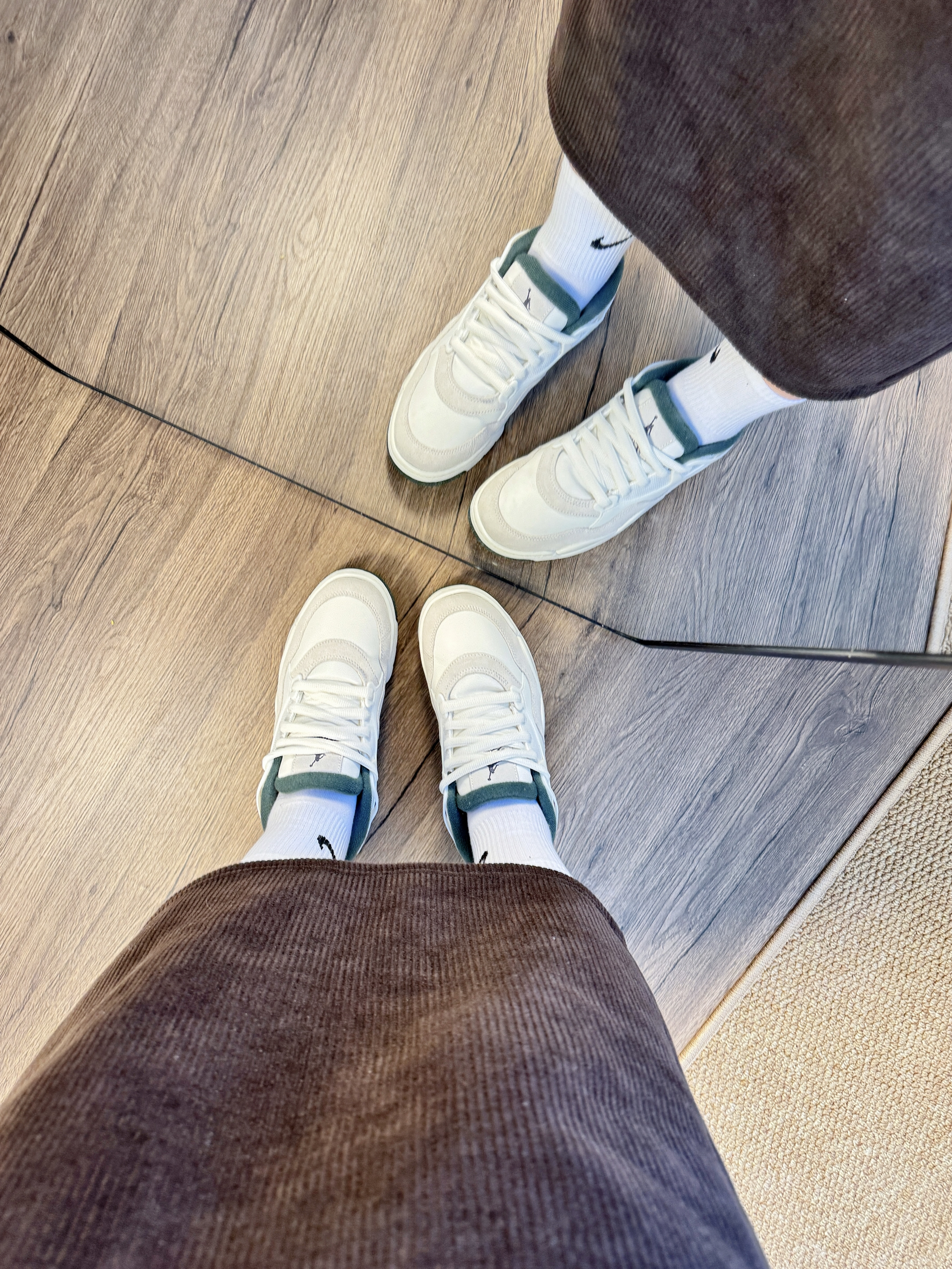 终于找到了我滴本命板鞋! 米色和复古绿色搭配的刚刚好~ 文艺又很有调性 简单搭配一下就很高级 它这个气垫对爱逛街的我太爱了 长时间走路也不很累 真的很想把它焊在脚上😭
