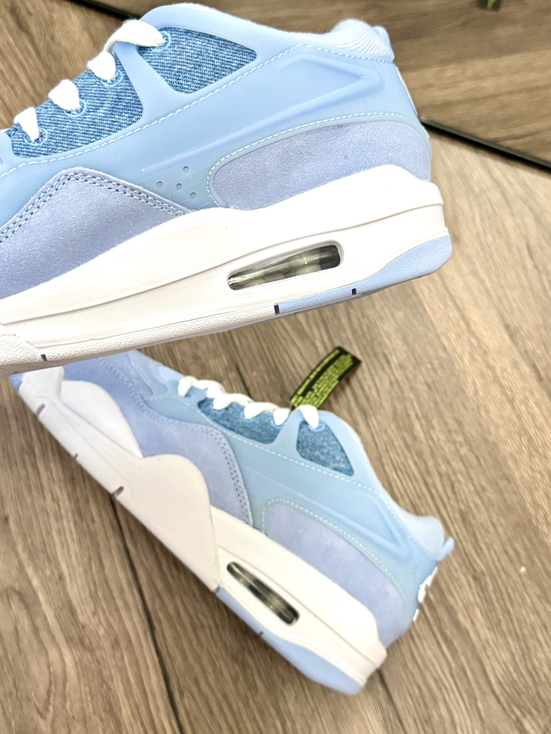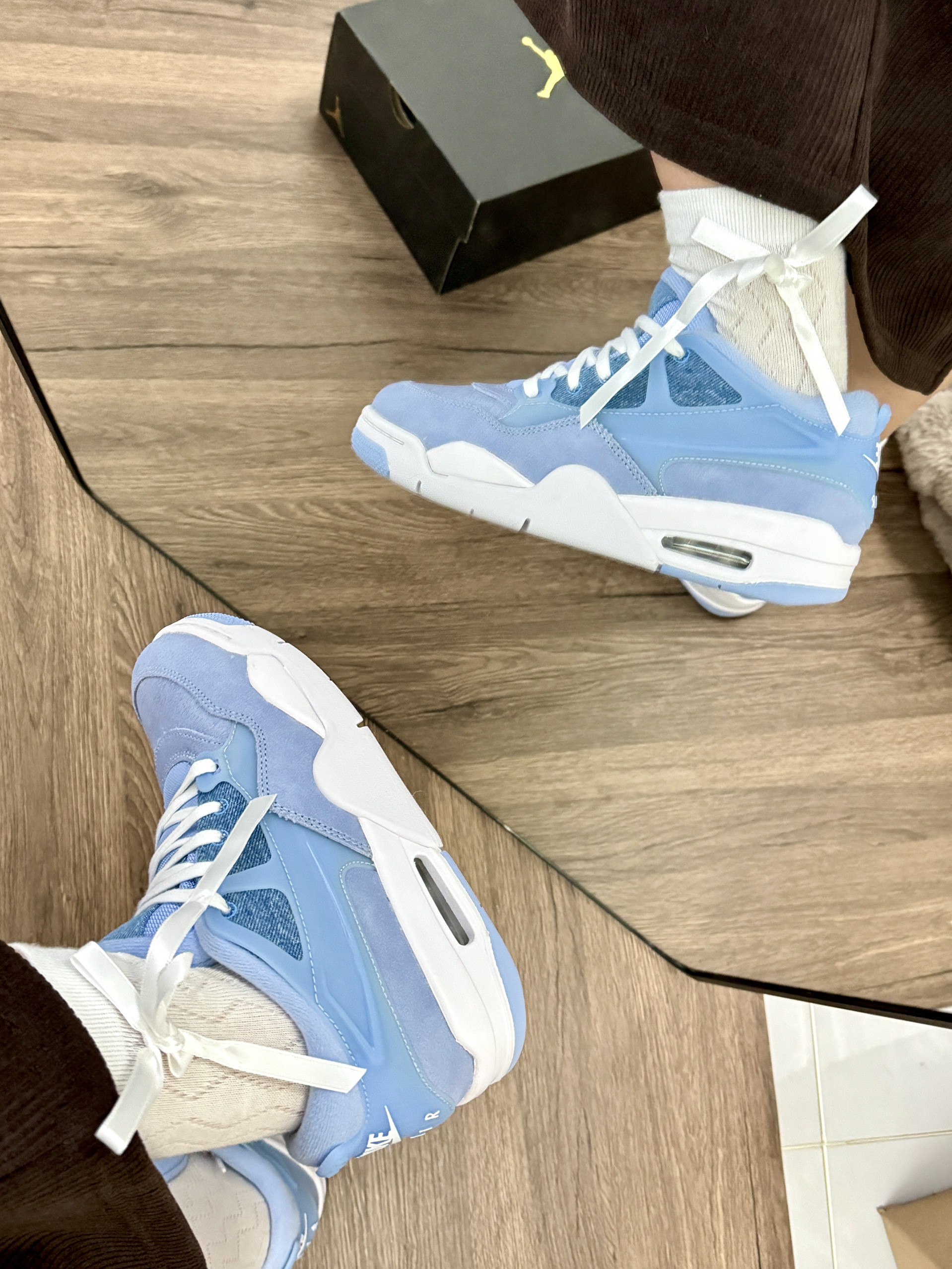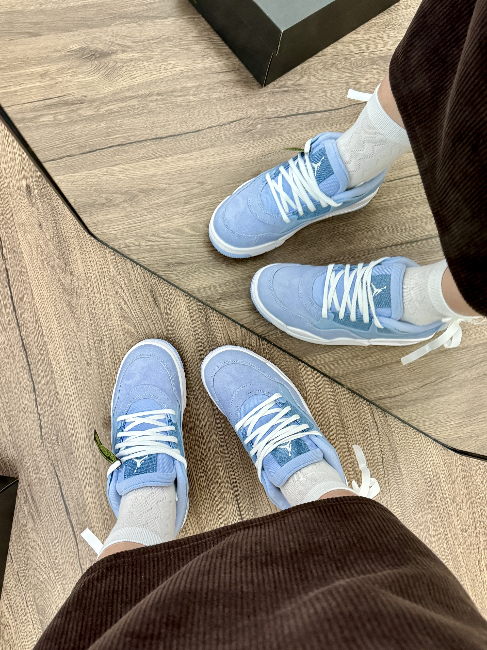 这双鞋我穿了很久 真的好爱aj这双鞋子啊! 整体角的包裹感很好 而且还显得我的脚比较小 牛仔拼接就显得比较的特别有设计感 整体蓝色系看着很舒服 日常出门也比较好搭配衣服