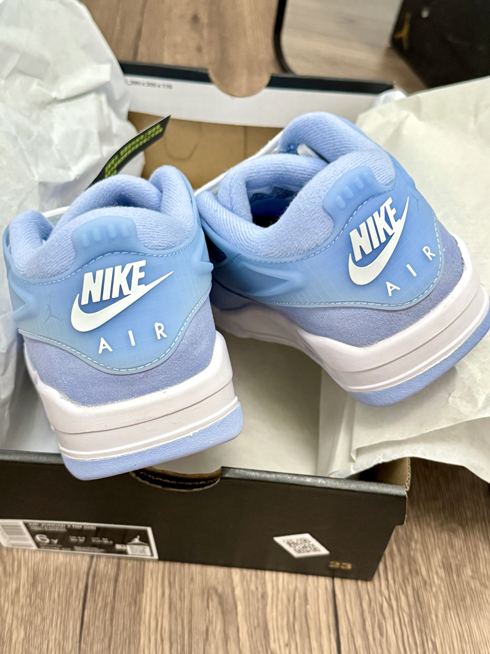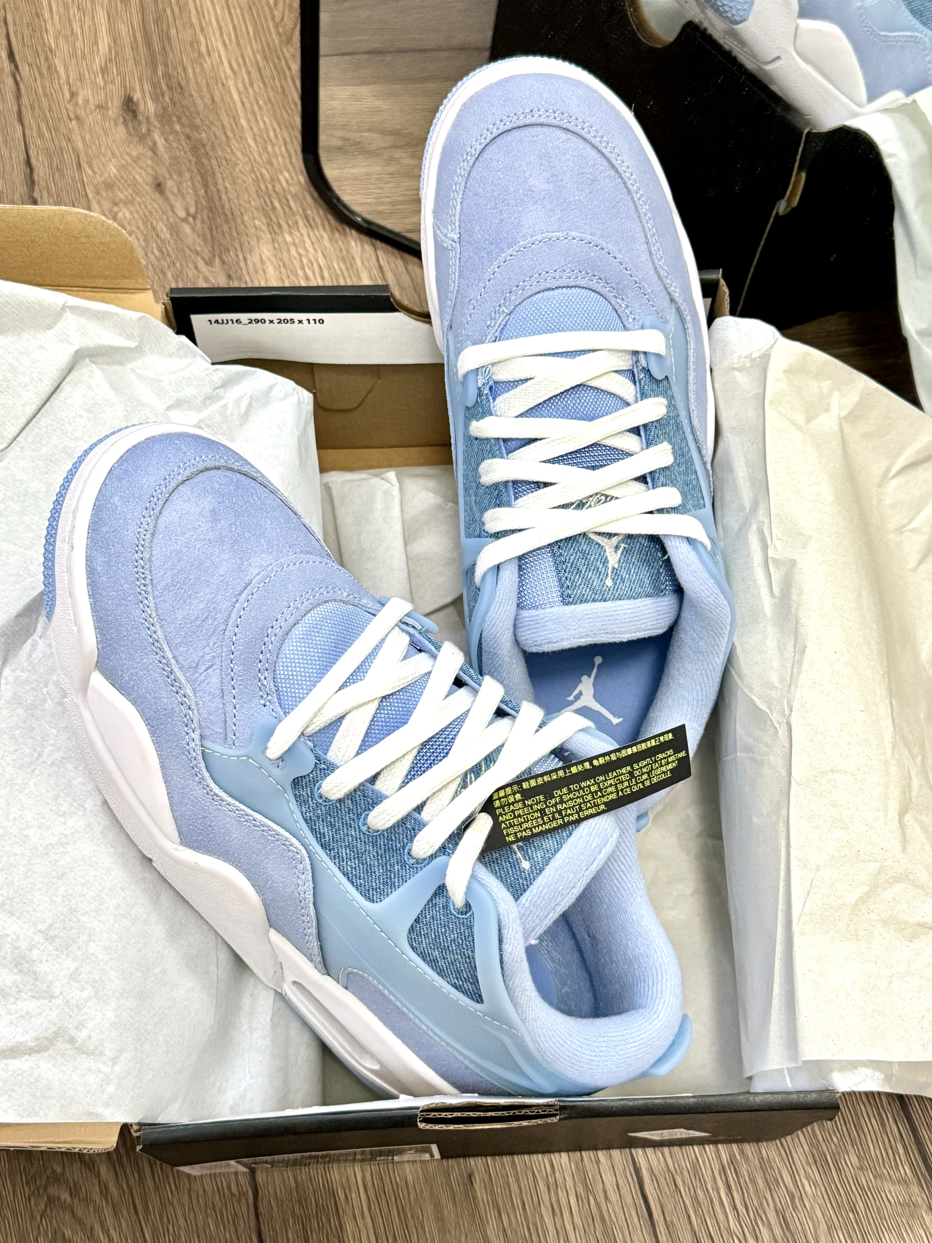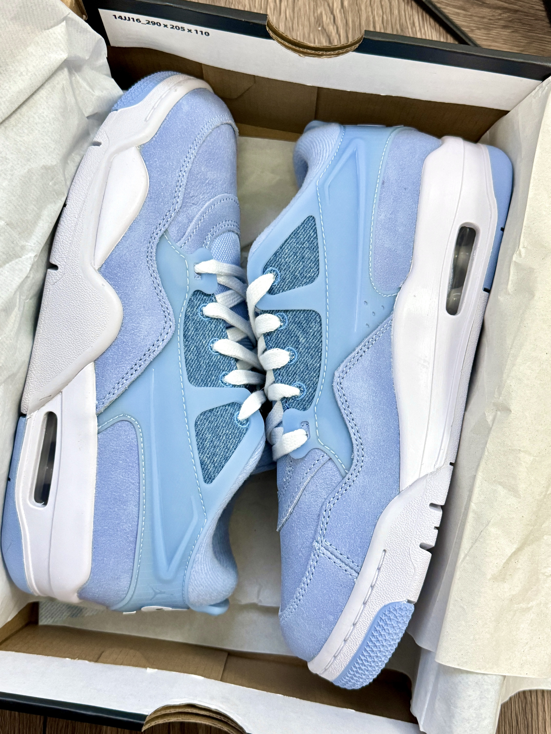 这双鞋我穿了很久 真的好爱aj这双鞋子啊! 整体角的包裹感很好 而且还显得我的脚比较小 牛仔拼接就显得比较的特别有设计感 整体蓝色系看着很舒服 日常出门也比较好搭配衣服