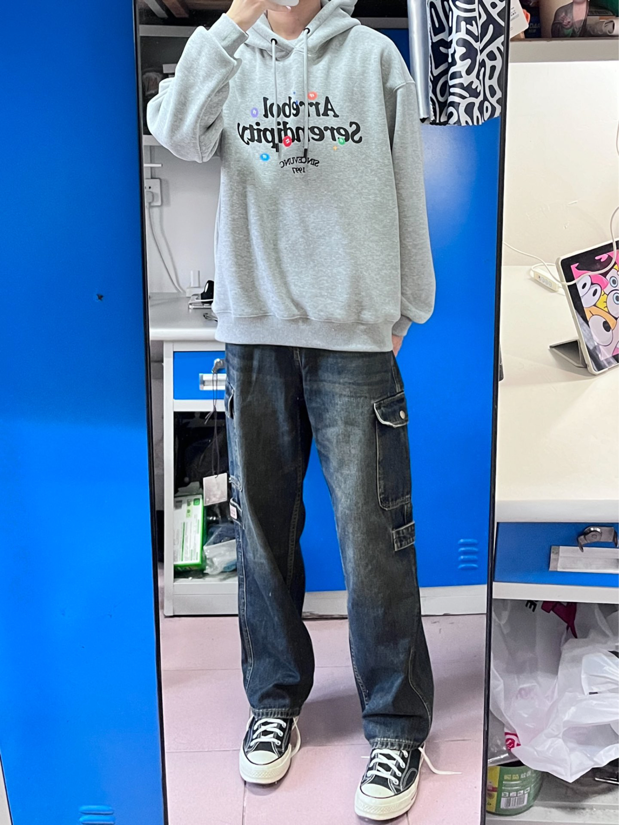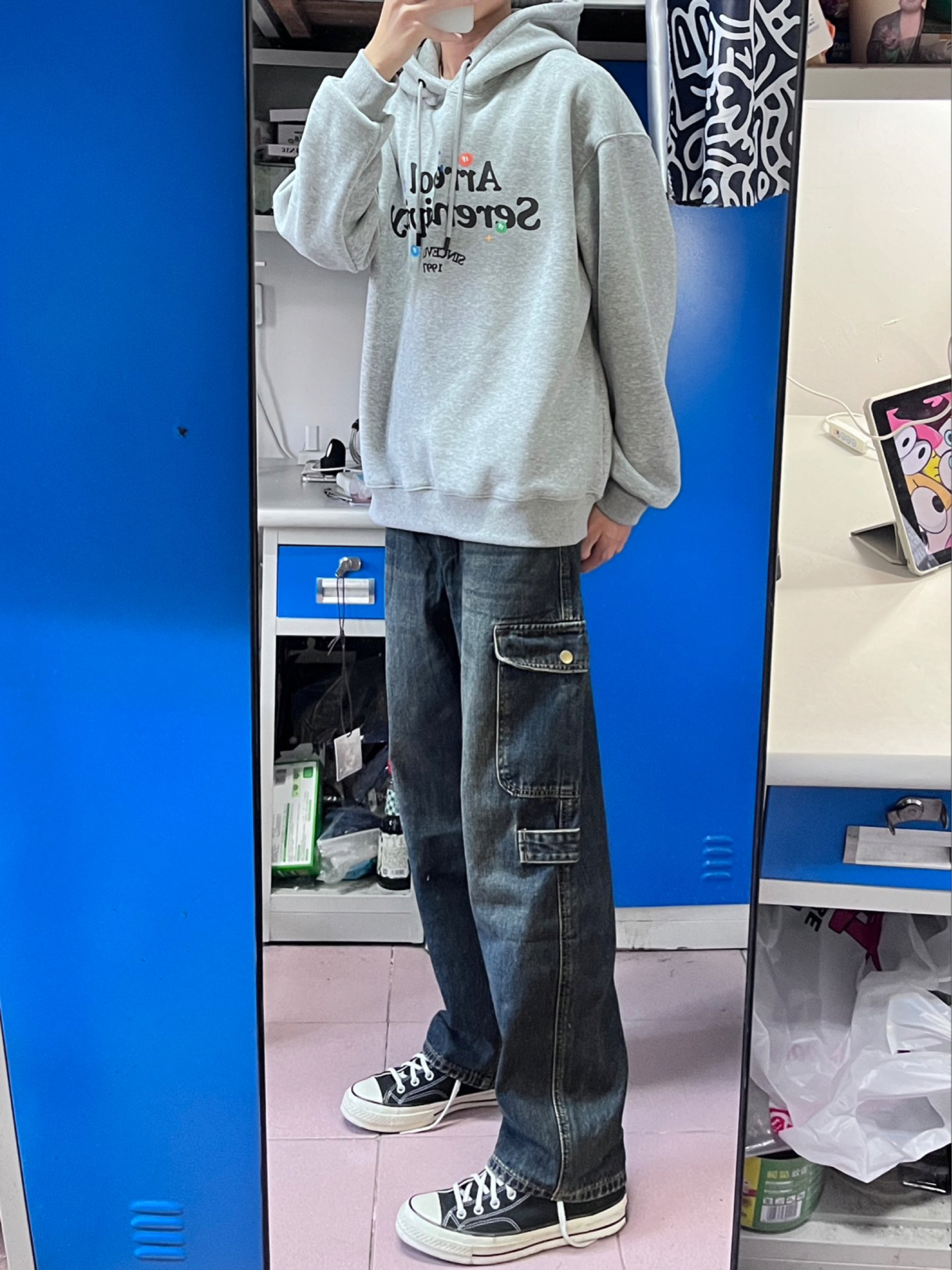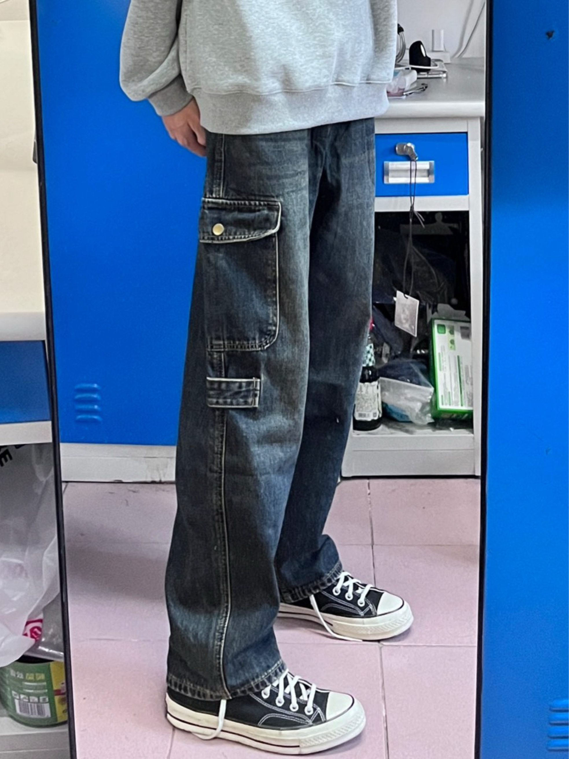 年度穿搭单品之工装牛仔裤🙋 宽松直筒的牛仔裤上身效果就是好 搭配工装风格的口袋,整体很有设计感 搭配连帽卫衣和帆布鞋上身松弛感拉满