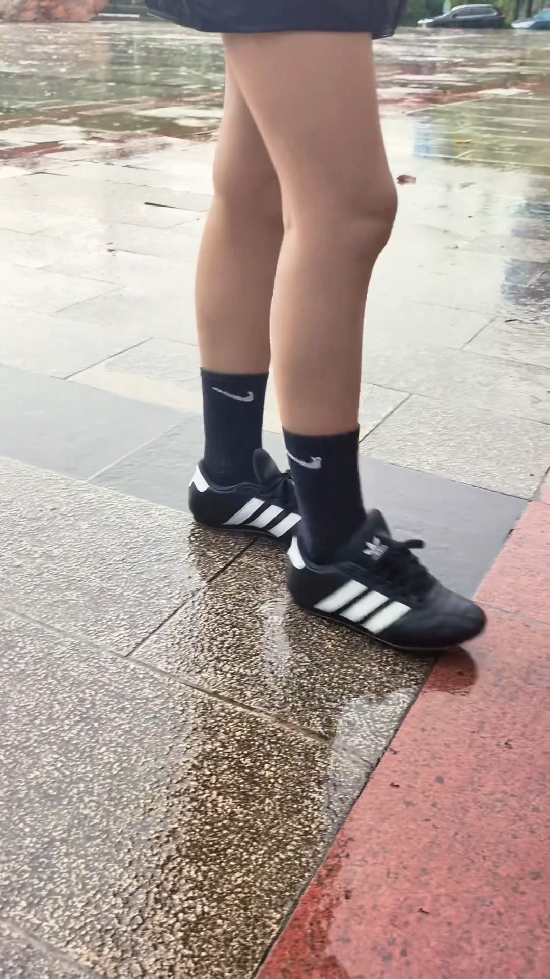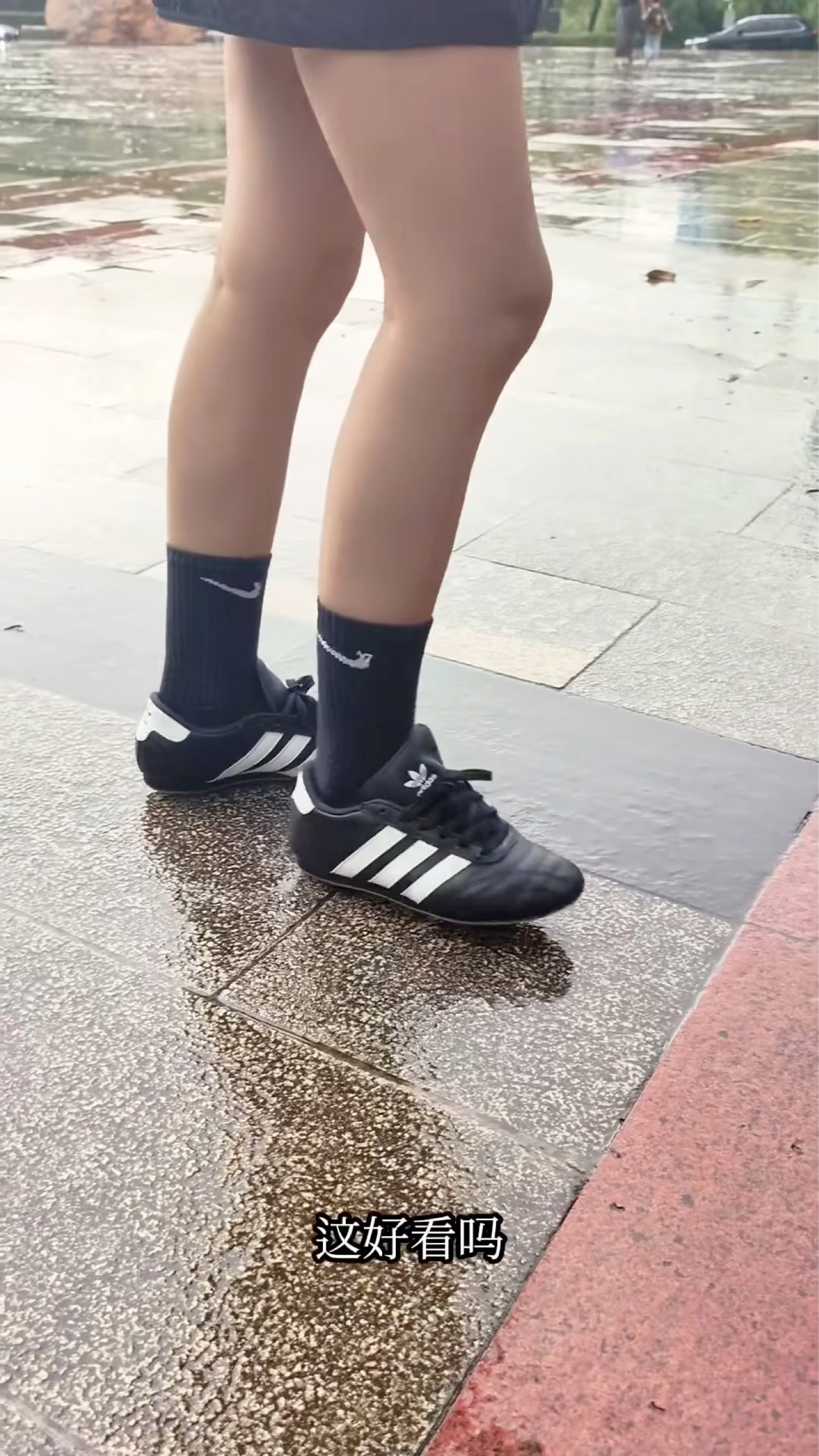 黑皮配白三道杠的经典撞色,鞋型是偏修长的足球鞋轮廓,和普通板鞋比更有辨识度,搭配束脚裤、阔腿裤都能穿出小众潮感。