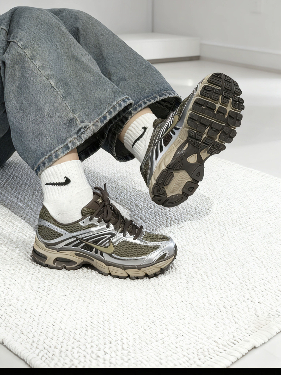 这双鞋的鞋面是几种材料拼起来的,看着层次感挺强的,像机甲那种块面感。配色是左右脚不太一样的“阴阳”设计,搭在一起确实挺特别的。 鞋帮包裹得挺贴脚踝,跑起来感觉蹬地有力。鞋底防滑纹路深,急停转身都很稳。