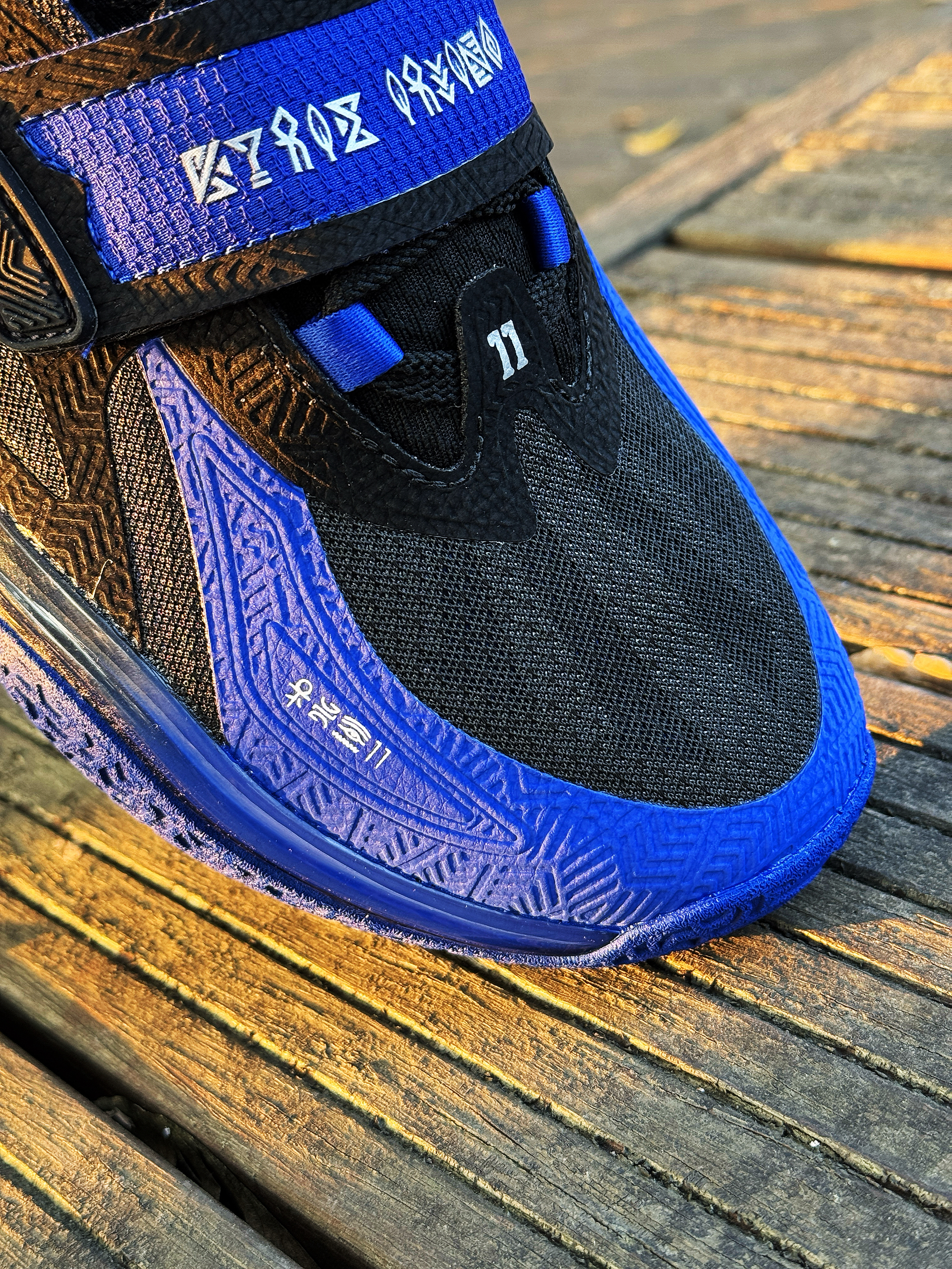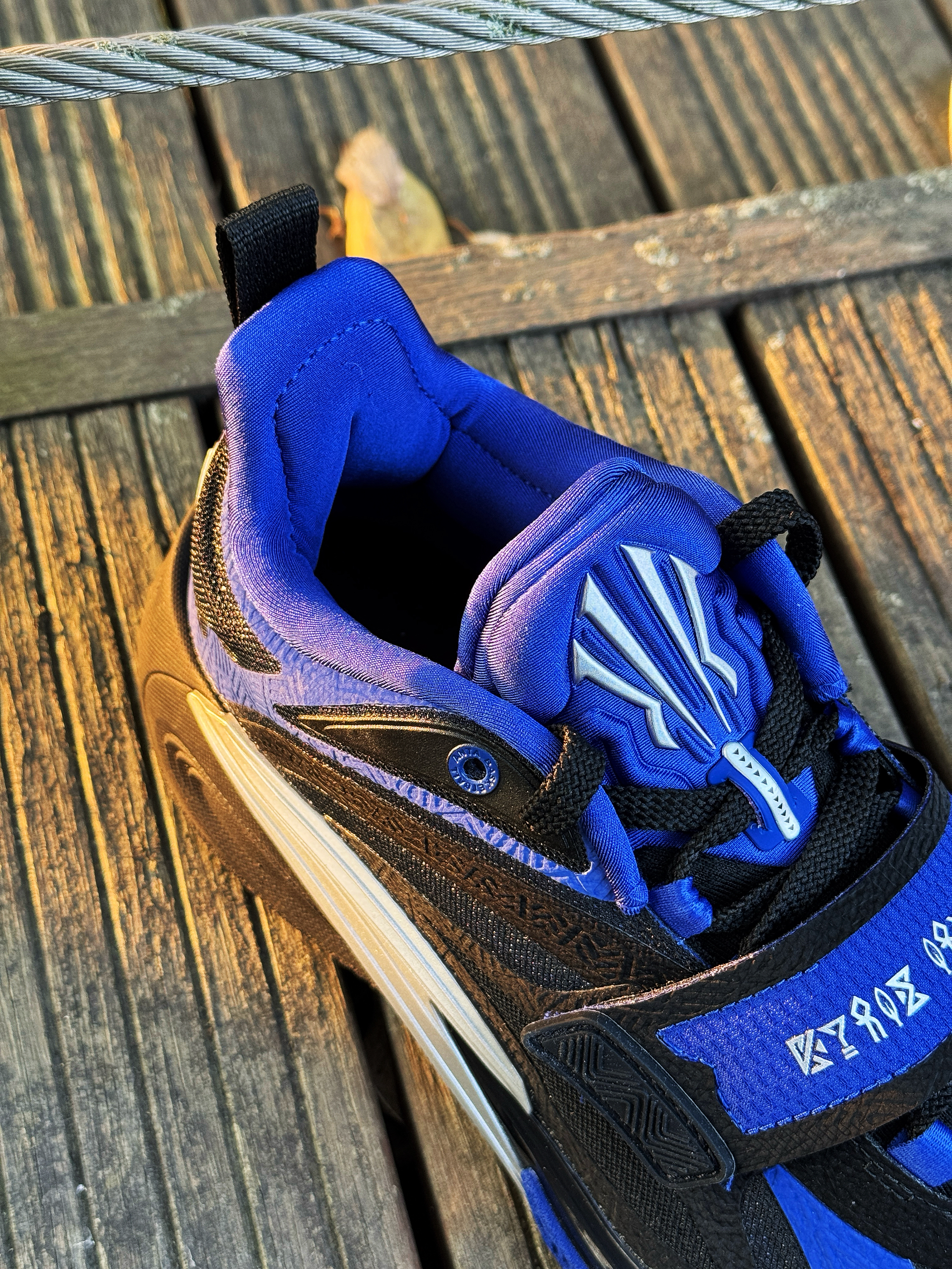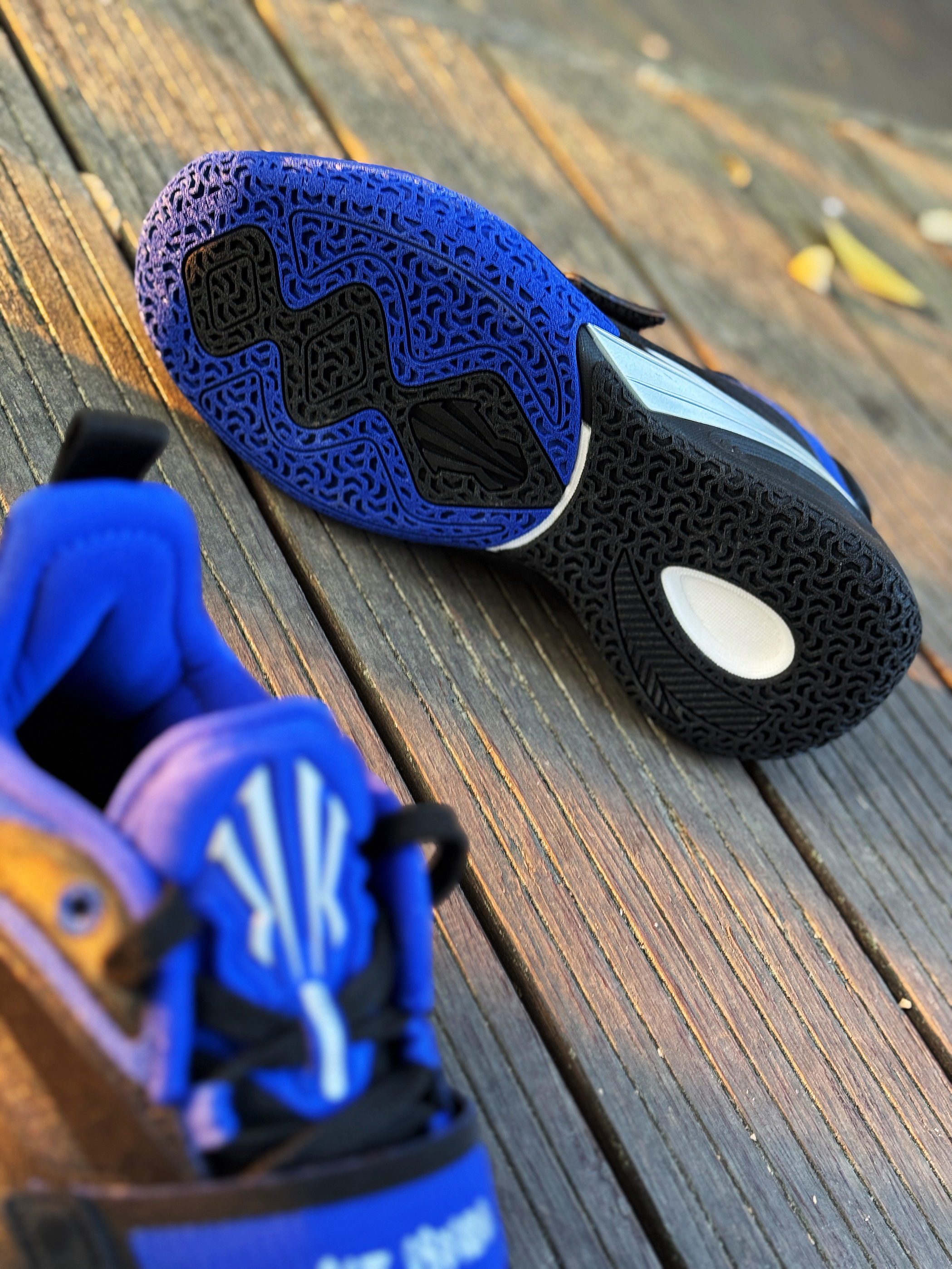 现在入手KAI 1性价比还不错的!同样也是大货配色 黑蓝的搭配懂得都懂了! 以欧文母校杜克大学为灵感设计 鞋侧面的银色Logo还是很炸眼的 鞋身细节多 颜值不算特别帅吧 但平时打球还是耐脏的类型!加上现在3开的价格 学生党、欧文球迷买来打球穿还是很有性价比的!尺码正常!