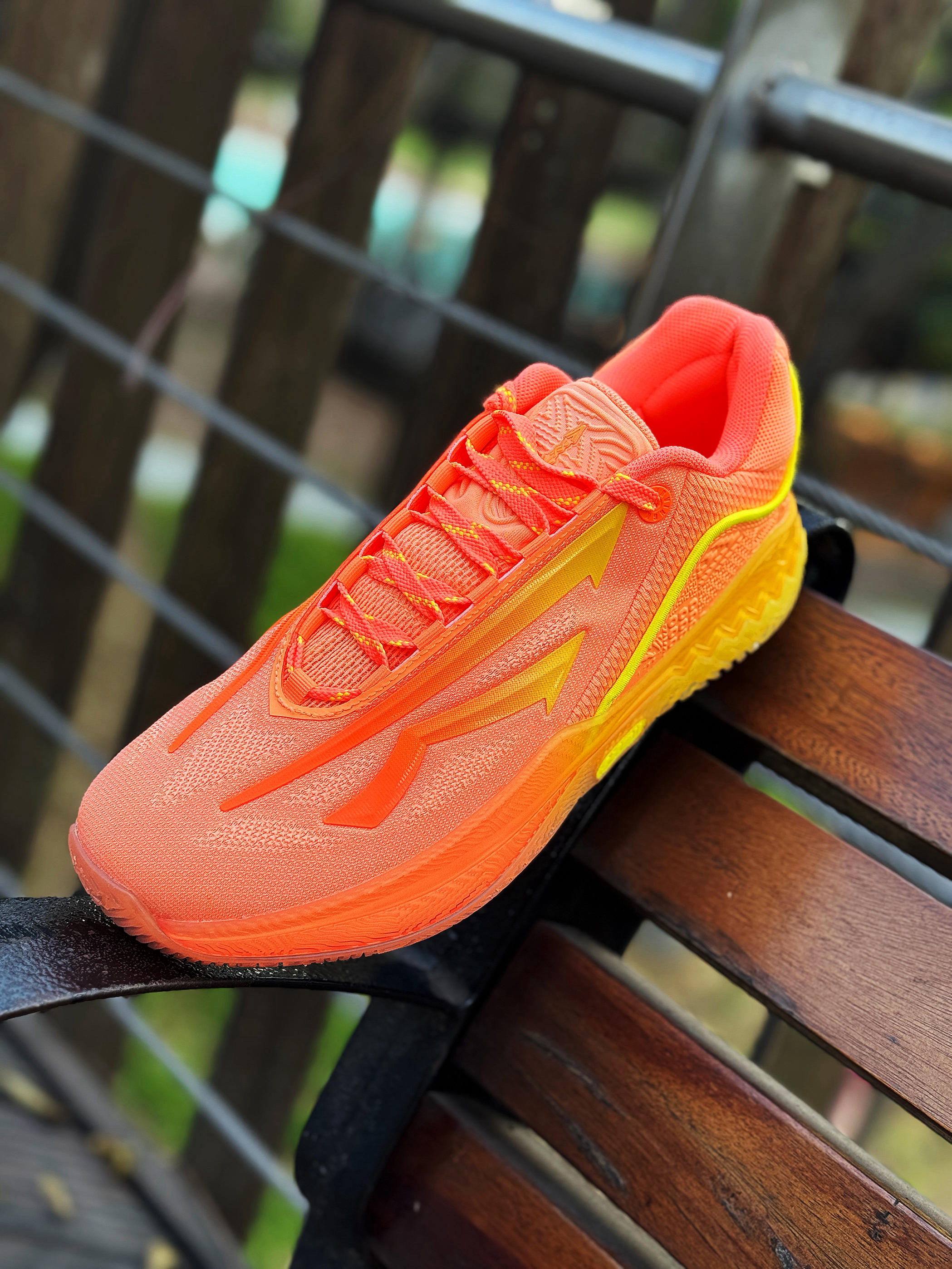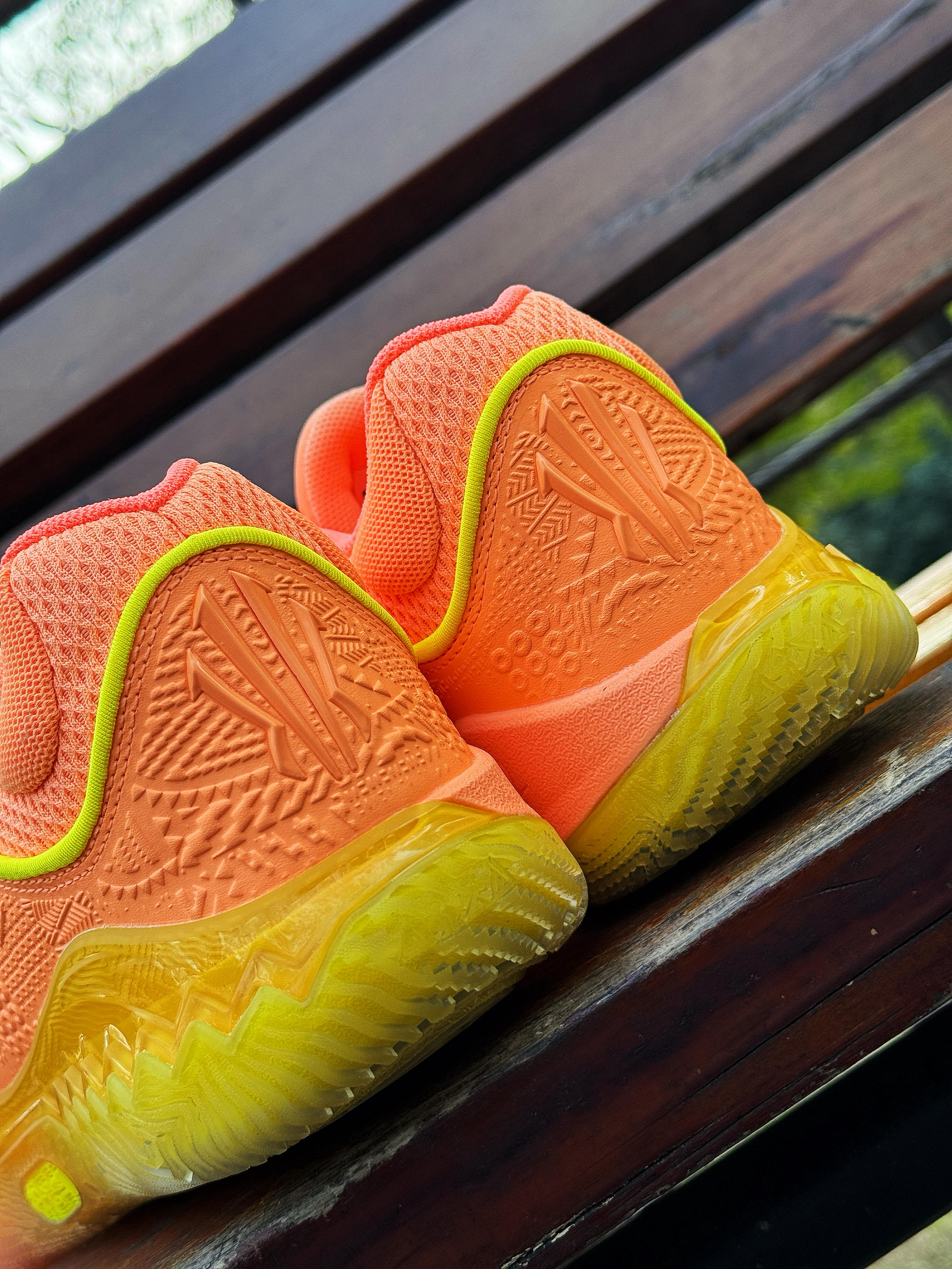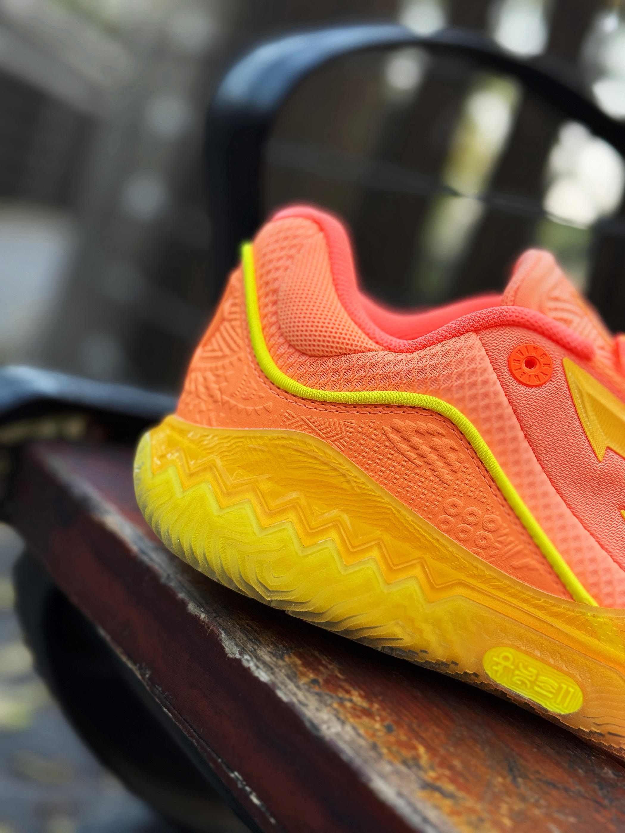先驱二代从性能颜值来说 都是不输正代的鞋款!最近发售的这双曜日配色也非常经典 之前在狂潮5 Pro和欧文一代都有出现过! 橙色与黄色搭配异常醒目 欧文之盾也尽显辨识度!配置上中底采用A-Shock Pro科技 脚感轻质舒适 重心不高!这次的水晶外底很漂亮 建议室内穿着 鞋子适合喜欢突破的后卫穿着!尺码方面正常选择!
