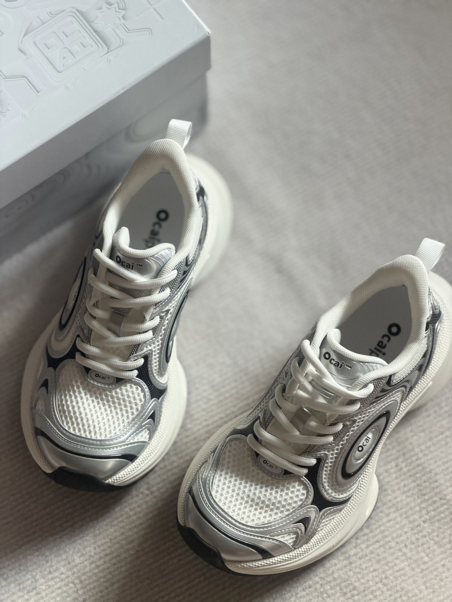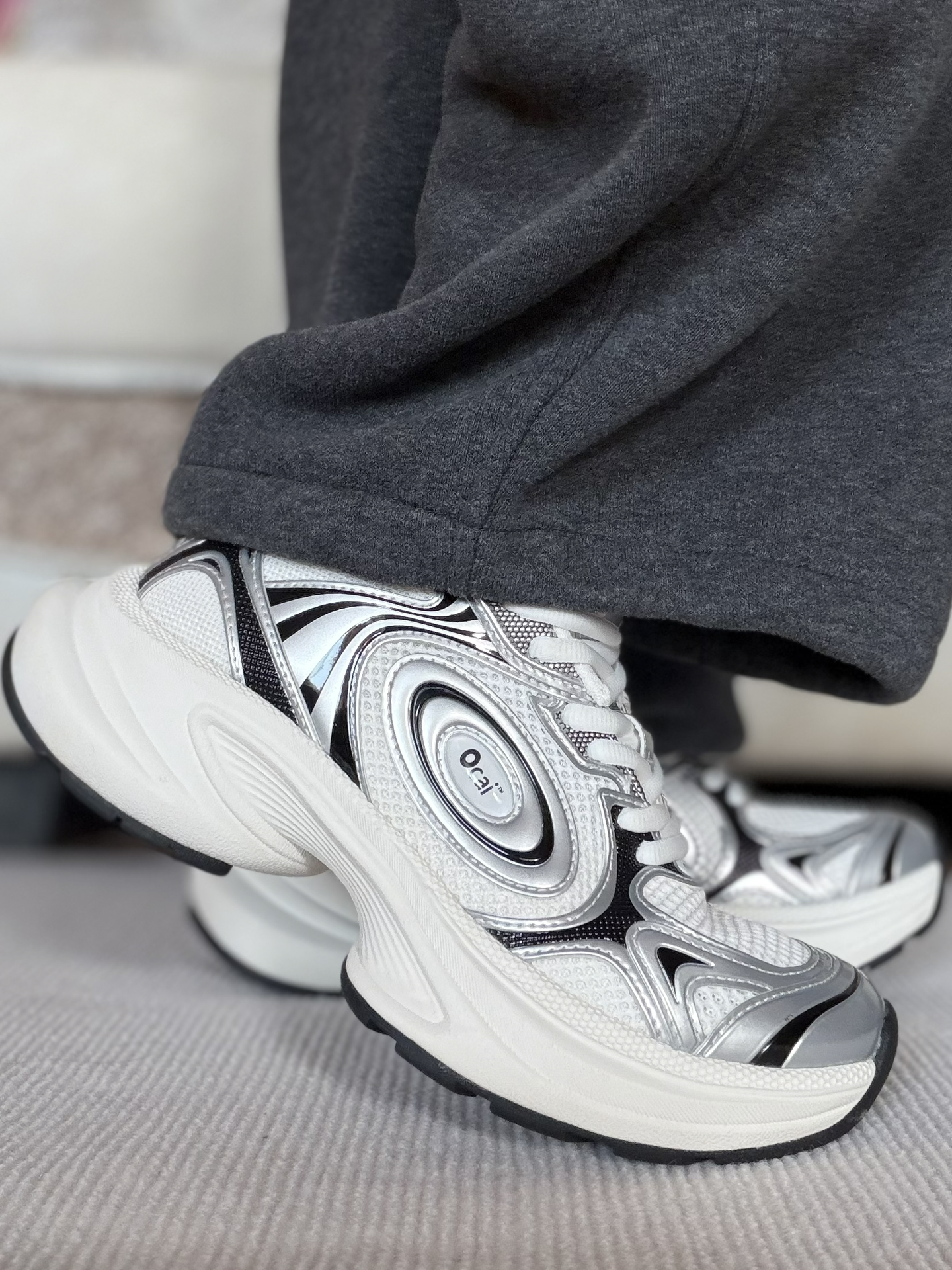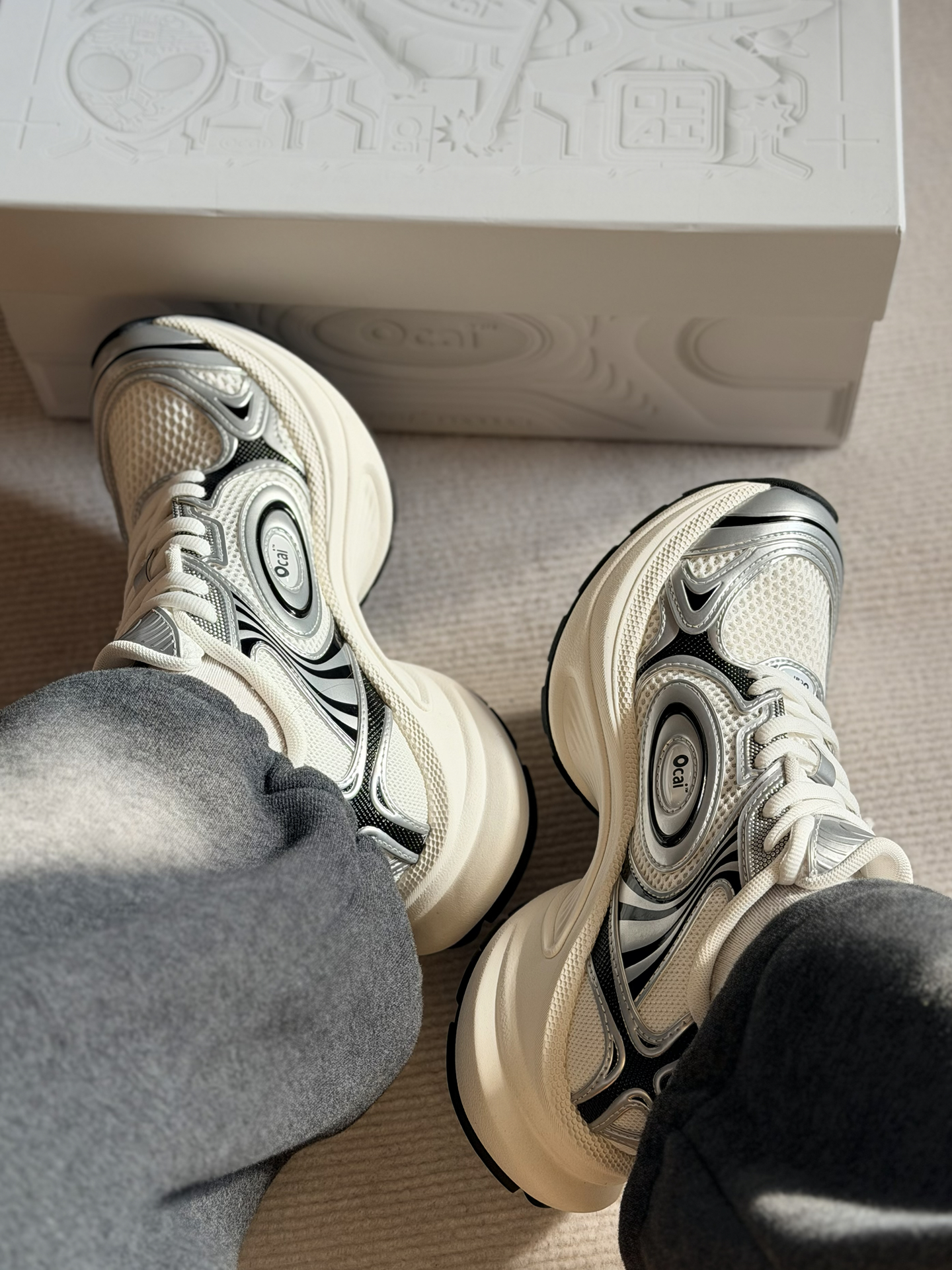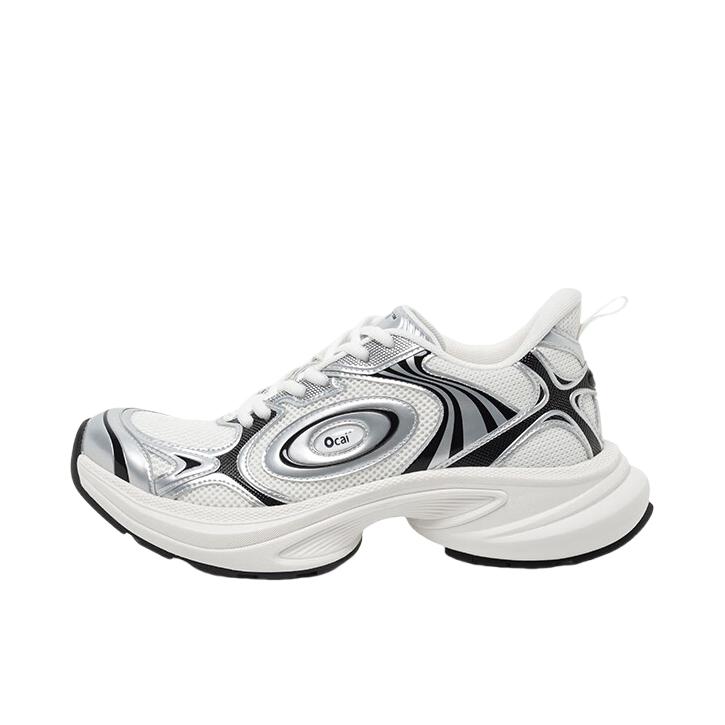 姐妹们 这双Ocai Disk Runtech飞碟老爹鞋 很多明星都在穿着。 它是复古老爹鞋的造型 银白的配色看上去很高级 皮革和织物的鞋面很有层次感 上脚轻便又舒适 还有不错的增高效果 日常搭配阔腿裤 牛仔裤都好看 #ocai #ocai飞碟 #马上换新鞋 #2025年度最顶跑鞋 #韩系入冬穿这双