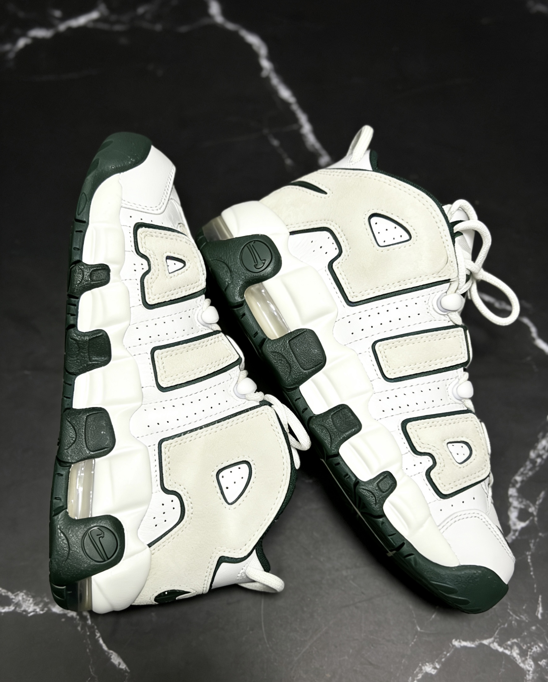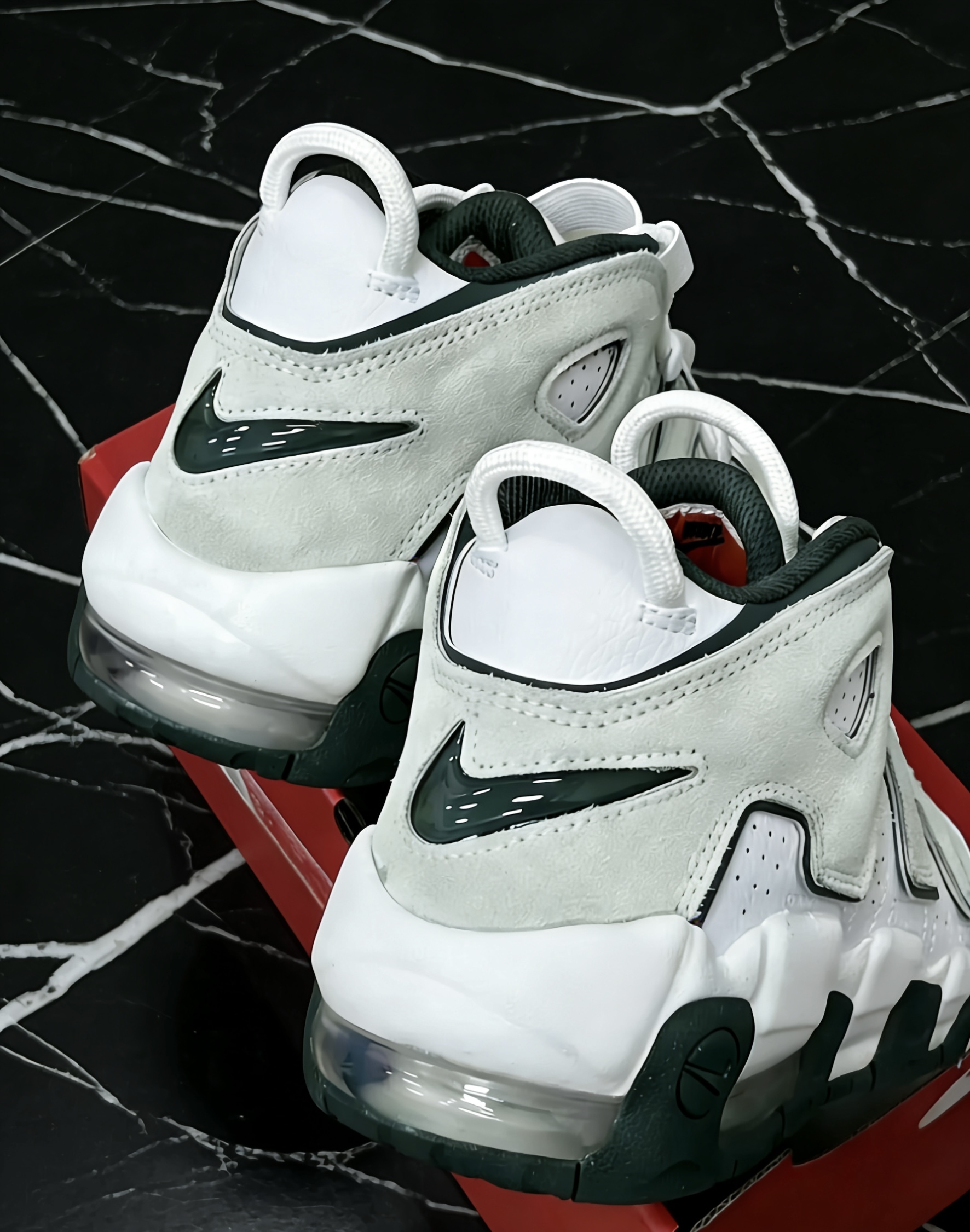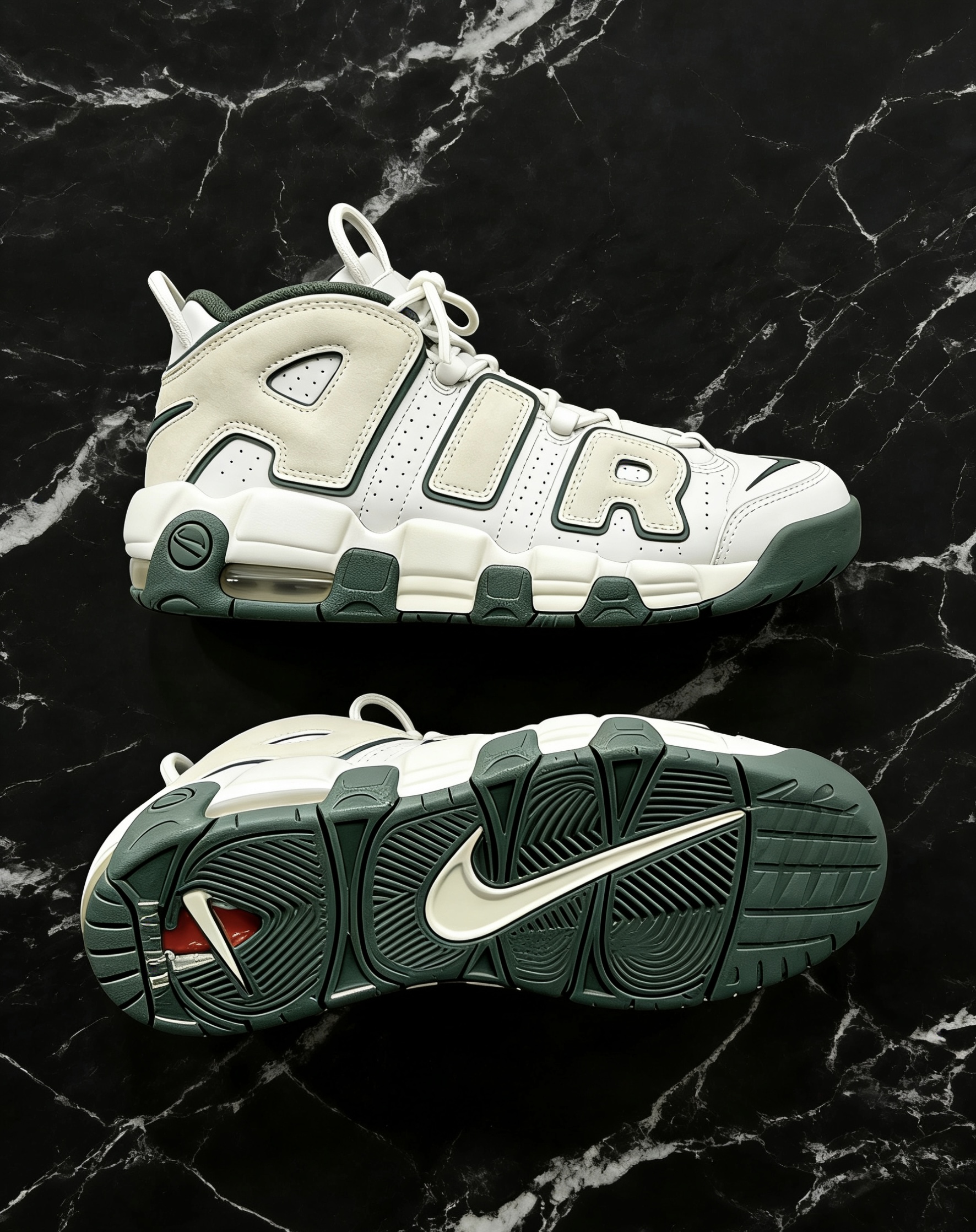 Nike Air More Uptempo的白绿配色真的是把复古氛围感焊在鞋上了!米白麂皮拼接纯白皮质,深森林绿的包边和细节勾勒,质感直接拉满。经典的大AIR骨架搭配气垫,脚感和颜值双在线,搭配工装裤或牛仔都超有腔调,复古球鞋控真的很难拒绝这双! 要不要我再帮你写一个更具潮流感的短文案,适合搭配短视频发布?