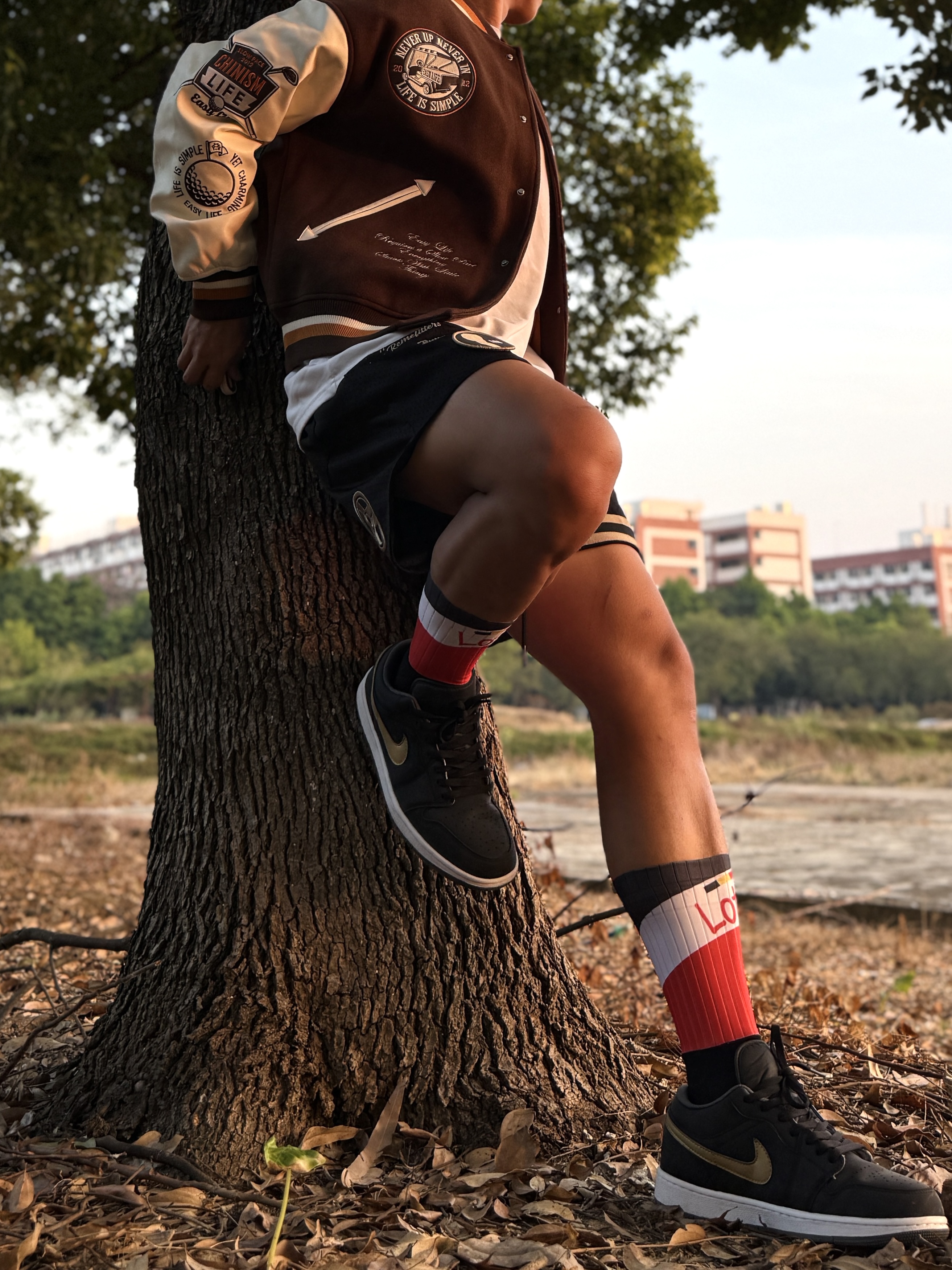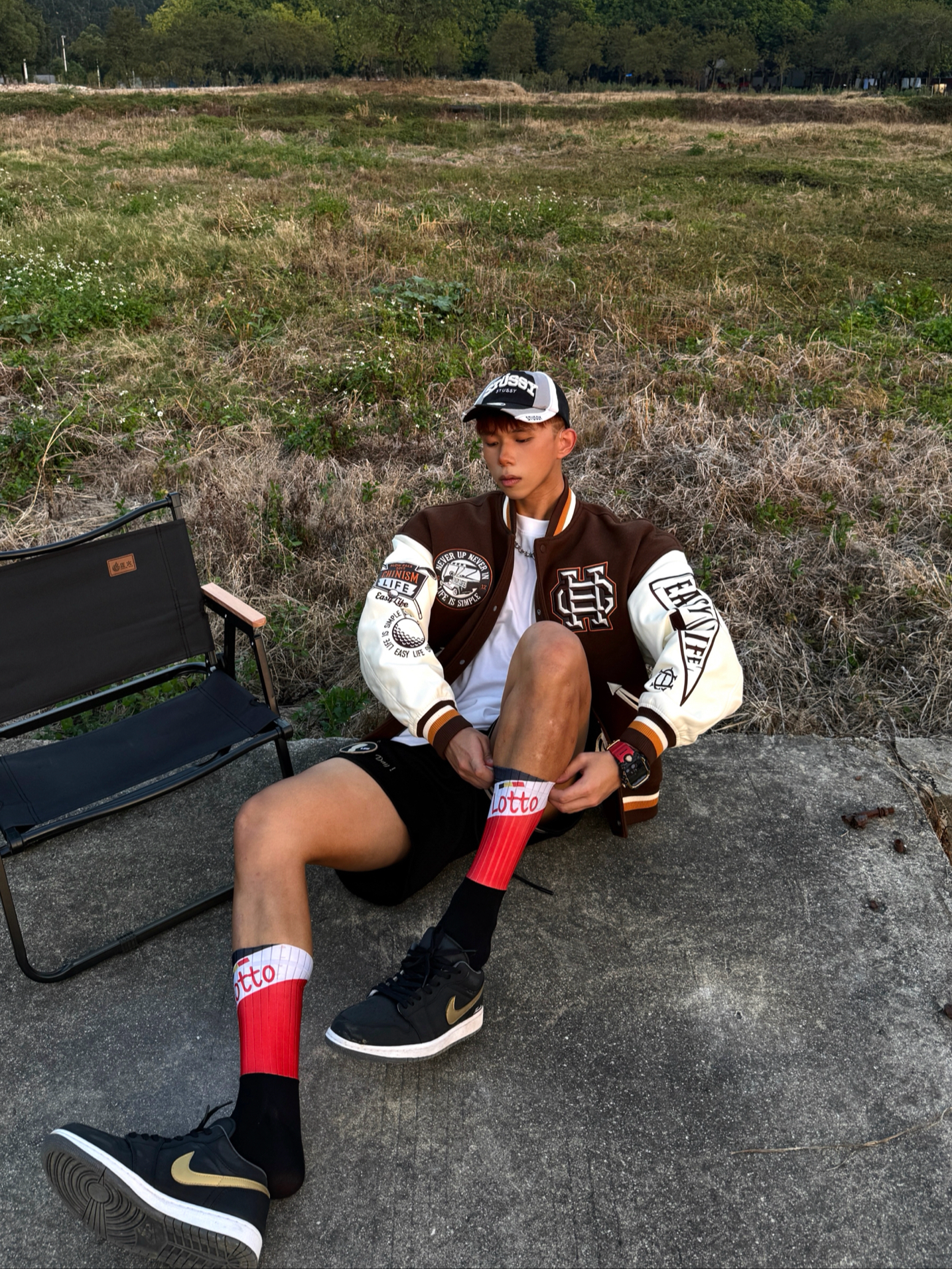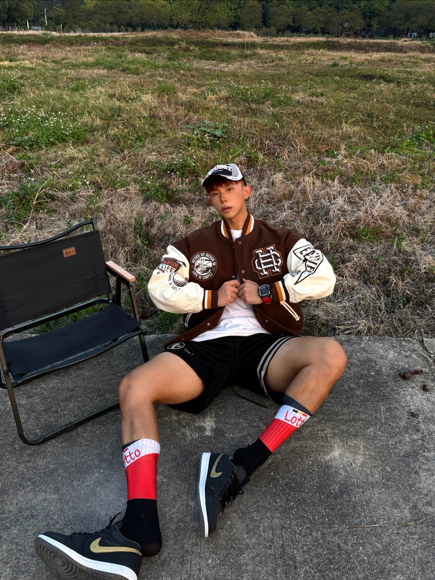 Hey bro‼️这里是小熊的穿搭日记 美式复古棒球夹克➕黑色运动短裤 上宽下短修饰利落身材比例 176的身高也能看起来像180+ 上脚aj1黑金武士👟 哑光黑色皮革的鞋身十分低调却精致 红黑白骑行袜十分吸睛 和黑金鞋身呼应形成复古配色 很喜欢鞋身保留的aj1标志性飞翼logo 运动潮流感真的特别爱🏃🏻♂️ 棒球夹克+运动短裤+骑行袜+aj1的搭配 真的完全不吃建模 随意兼容街头和通勤风格...