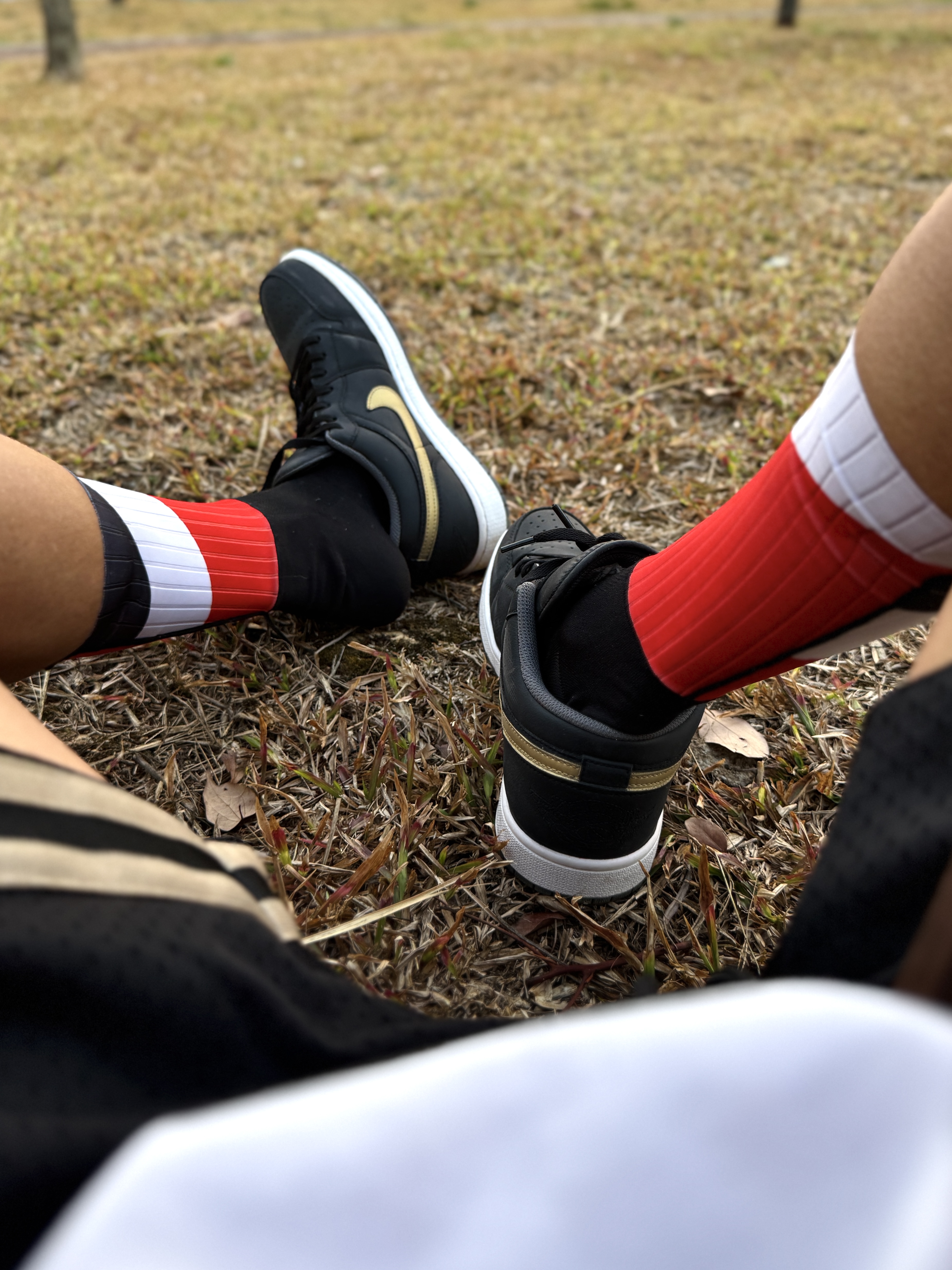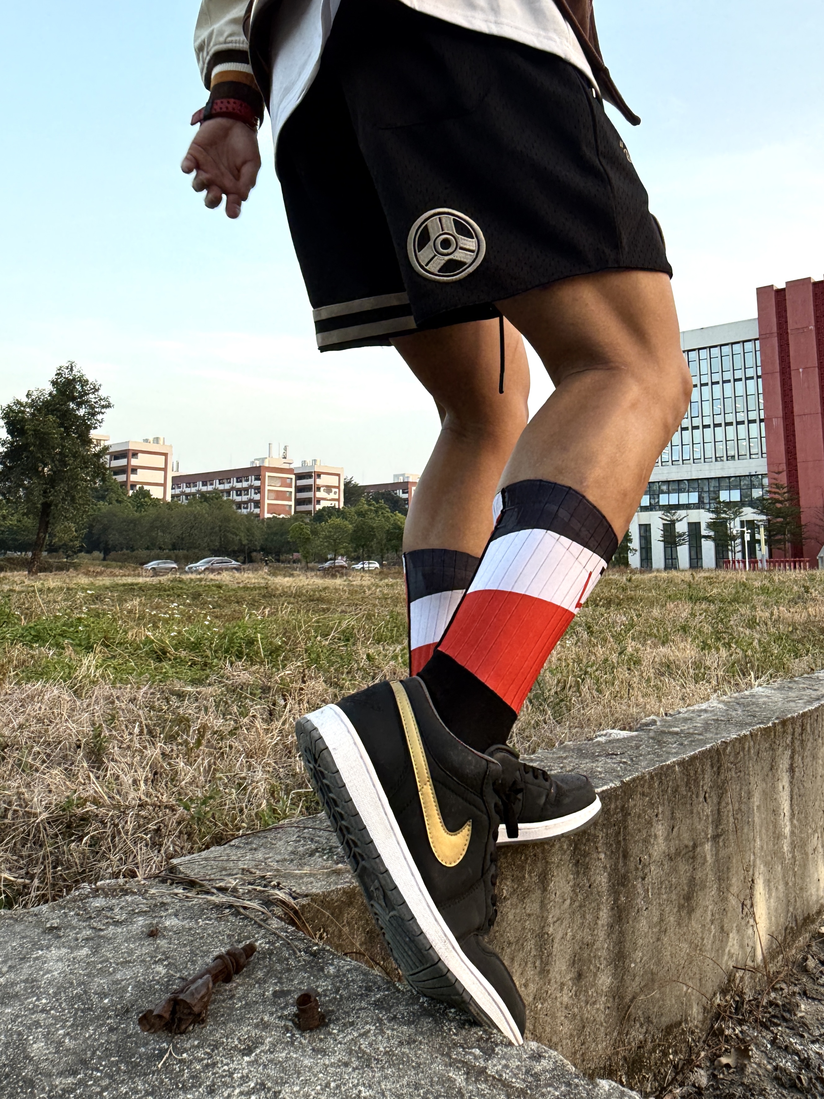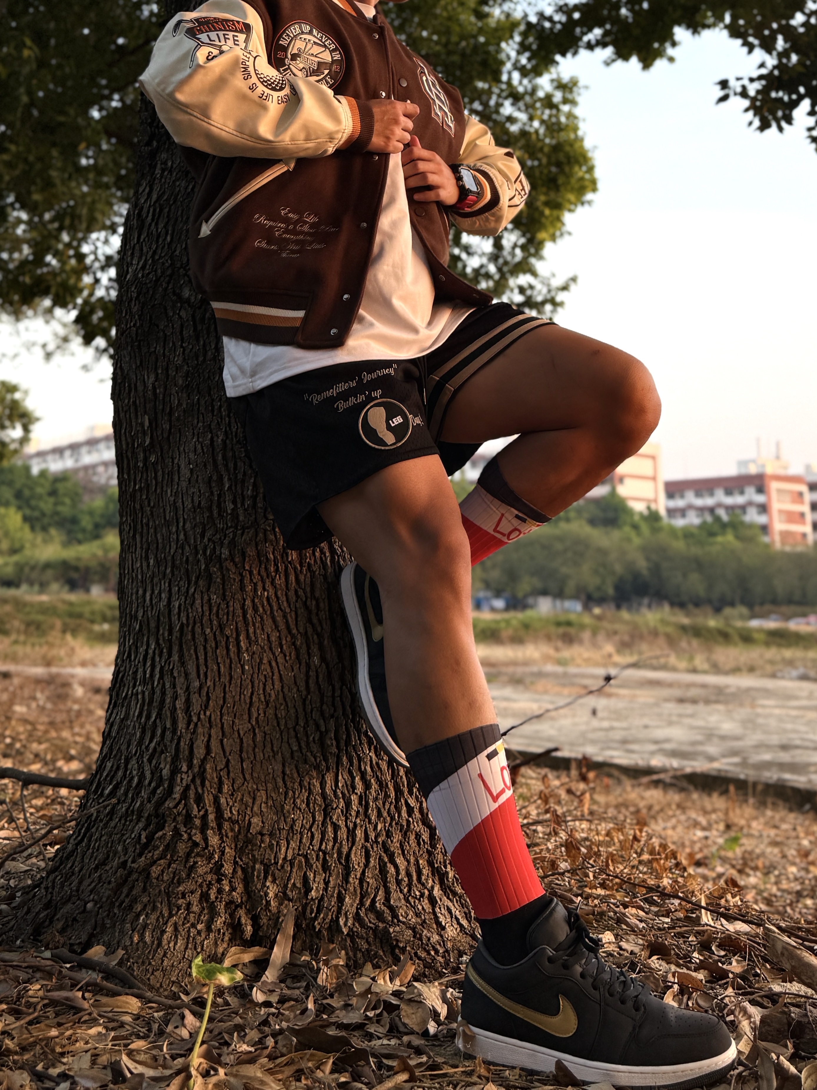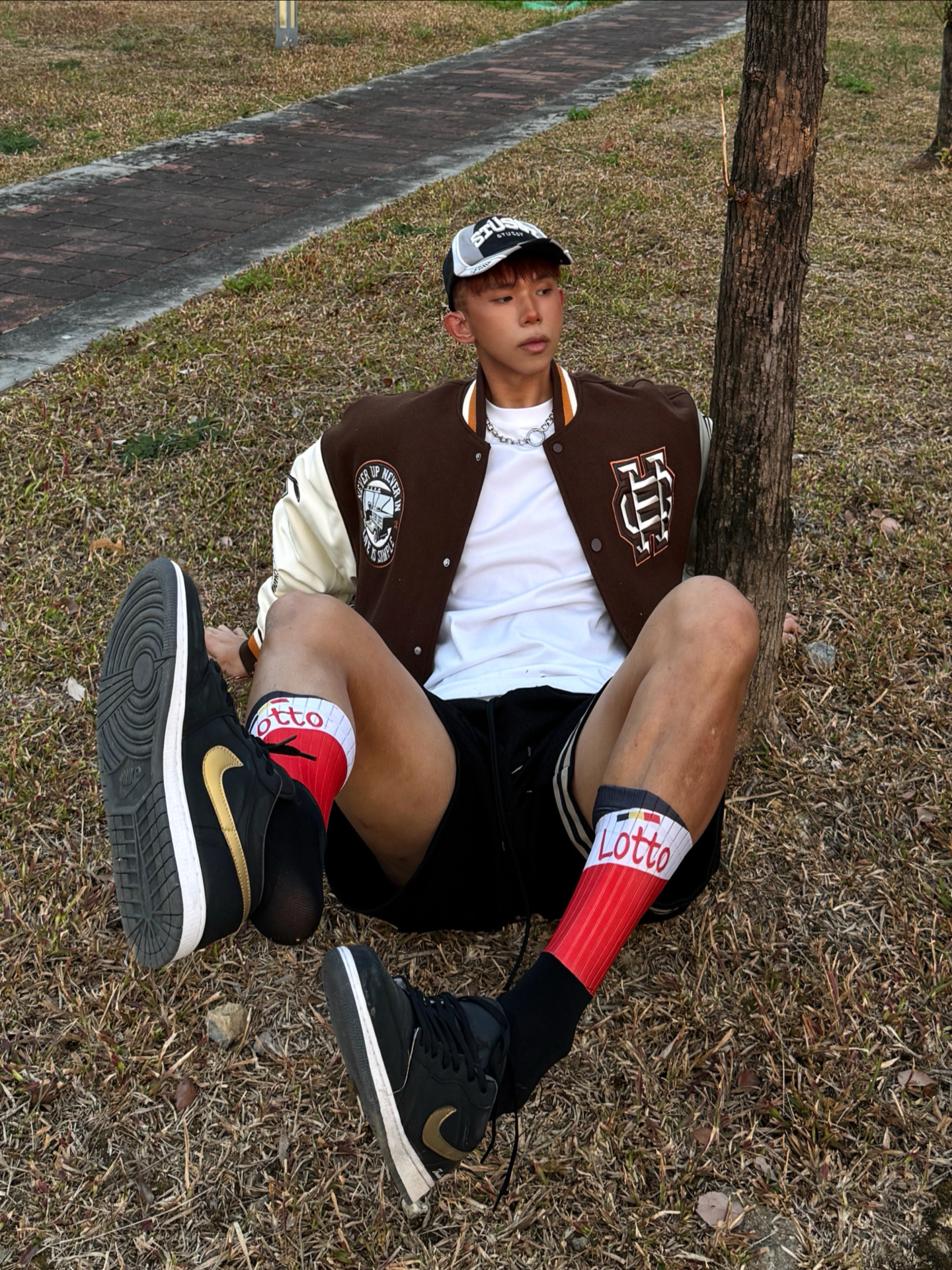 Hey bro‼️这里是小熊的穿搭日记 美式复古棒球夹克➕黑色运动短裤 上宽下短修饰利落身材比例 176的身高也能看起来像180+ 上脚aj1黑金武士👟 哑光黑色皮革的鞋身十分低调却精致 红黑白骑行袜十分吸睛 和黑金鞋身呼应形成复古配色 很喜欢鞋身保留的aj1标志性飞翼logo 运动潮流感真的特别爱🏃🏻♂️ 棒球夹克+运动短裤+骑行袜+aj1的搭配 真的完全不吃建模 随意兼容街头和通勤风格...