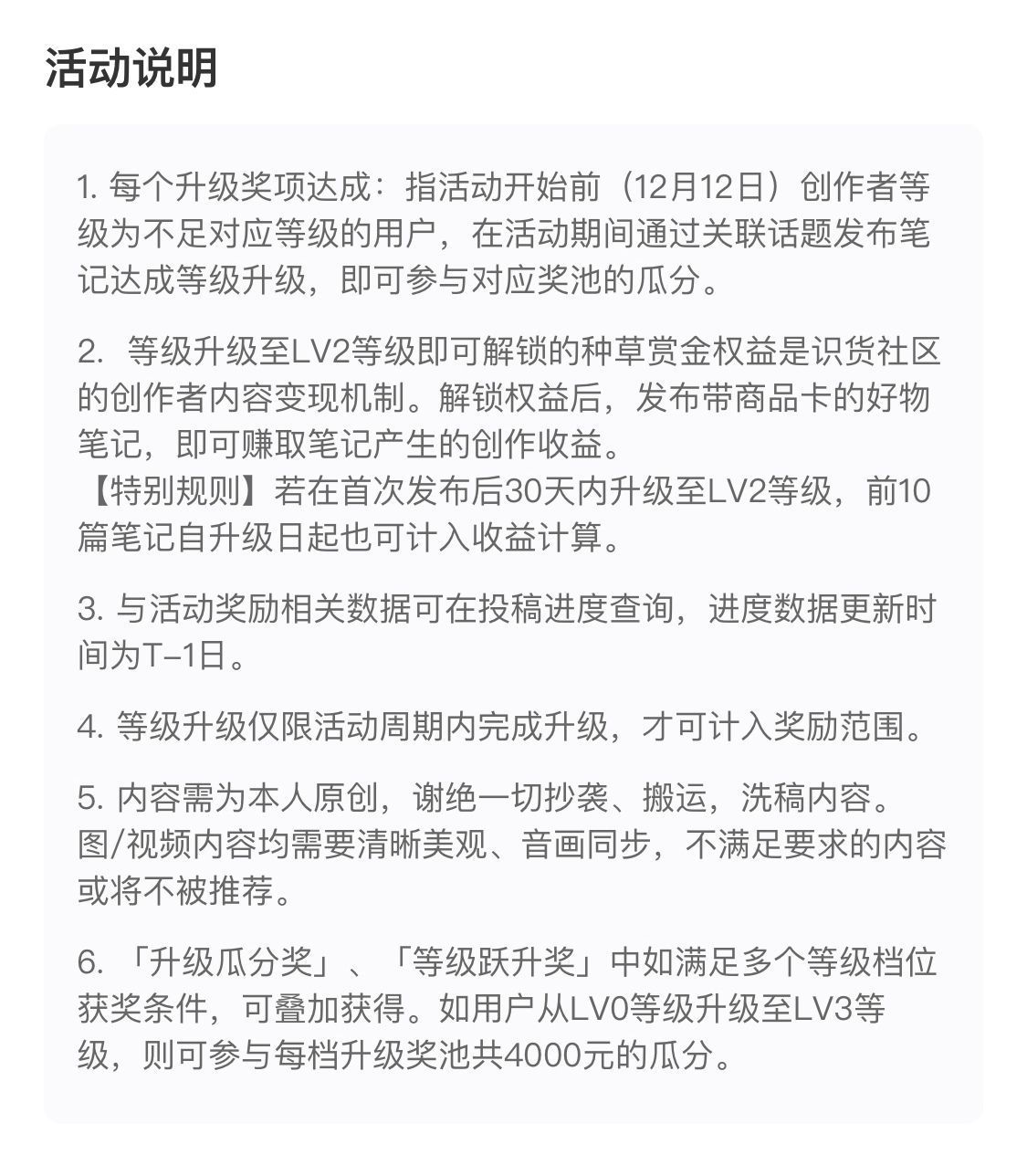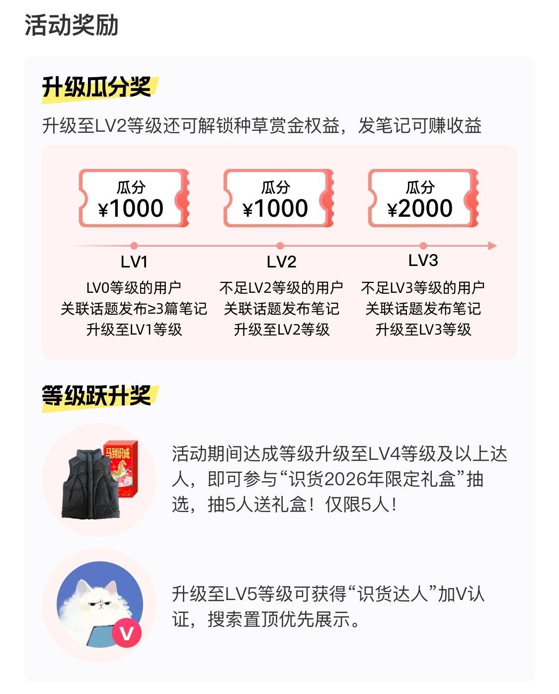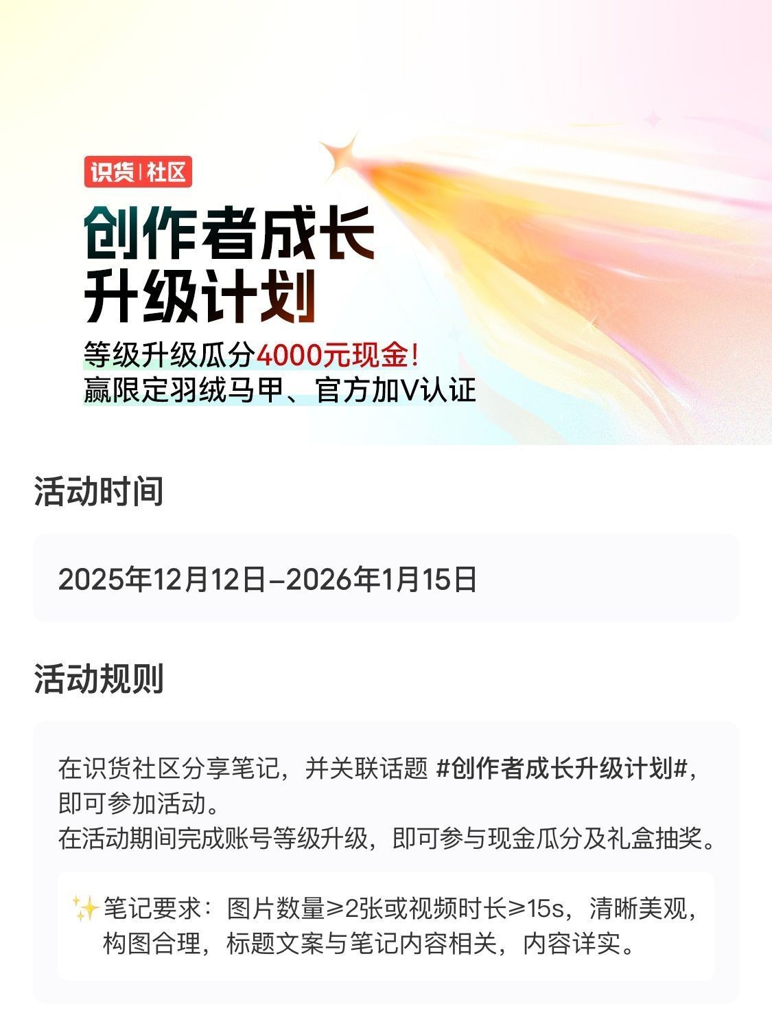 等级进阶一起瓜分4000元现金~更有机会赢限定羽绒马甲和官方加V认证! 【活动规则】 2025年12月12日~2026年1月15日 在识货社区发布笔记,并关联话题 #创作者成长升级计划#,即可参加活动。在活动期间完成账号等级升级,即可参与现金瓜分及礼盒抽奖。 笔记要求:图片数量≥2张或视频时长≥15s,清晰美观,构图合理,标题文案与笔记内容相关,内容详实。 【活动奖励】 「升级瓜分奖」 创作者为L...