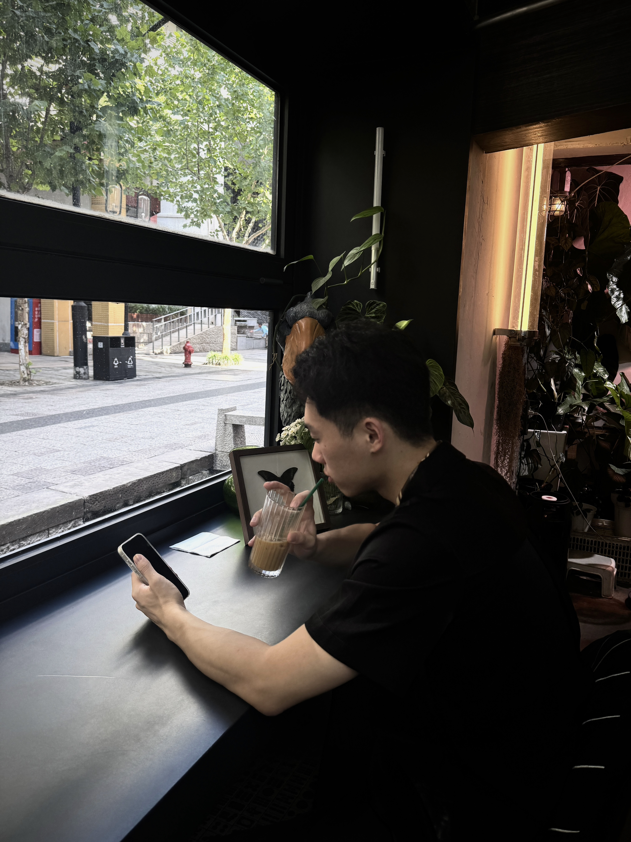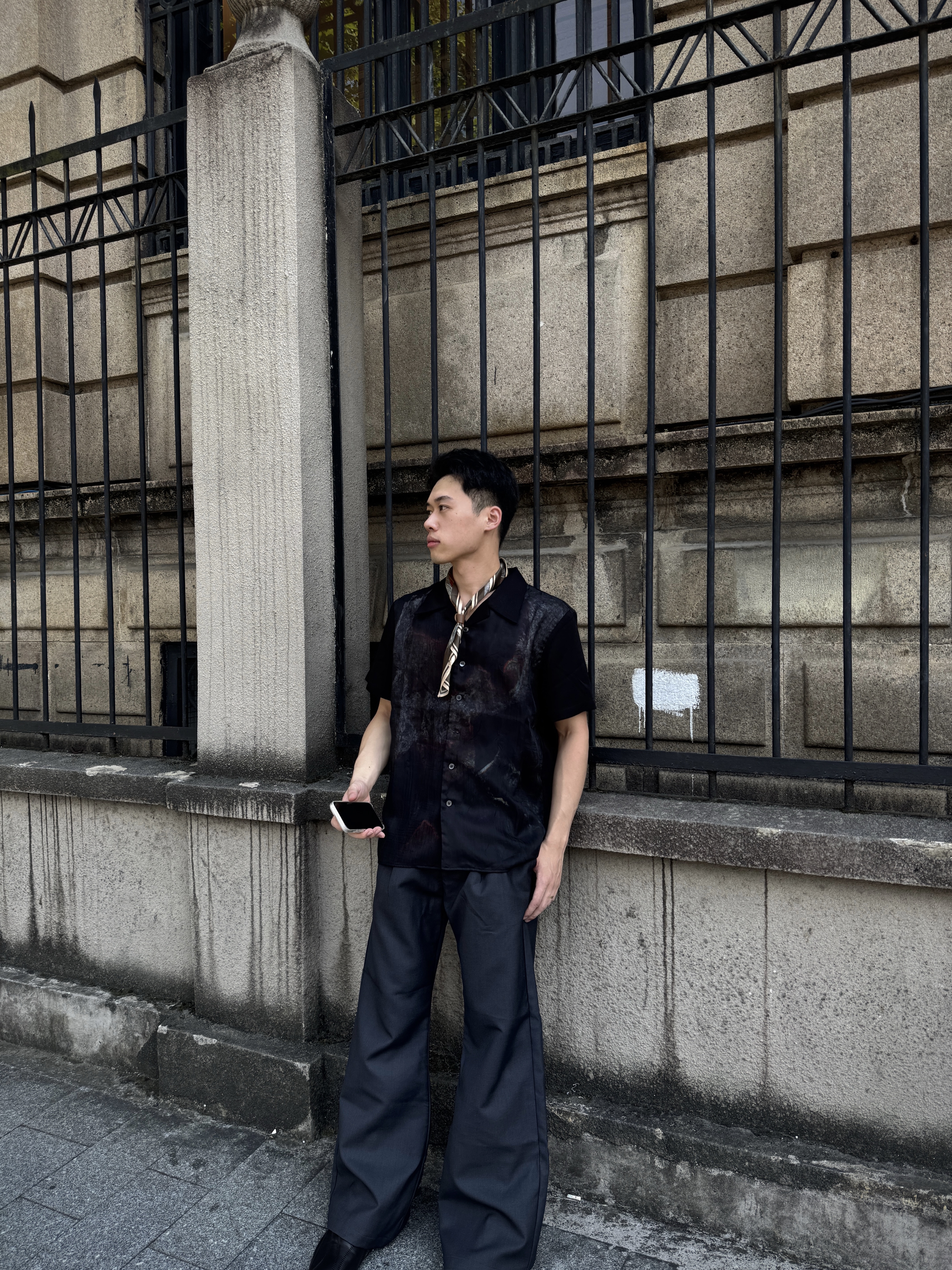 墨色短袖衬衫自带清冷肌理,搭配垂坠感满分的黑色阔腿裤,用丝巾和橘粉色挎包做撞色点缀,在江南建筑旁随手拍都透着新中式的慵懒松弛,黑调穿搭也能玩出层次感~
