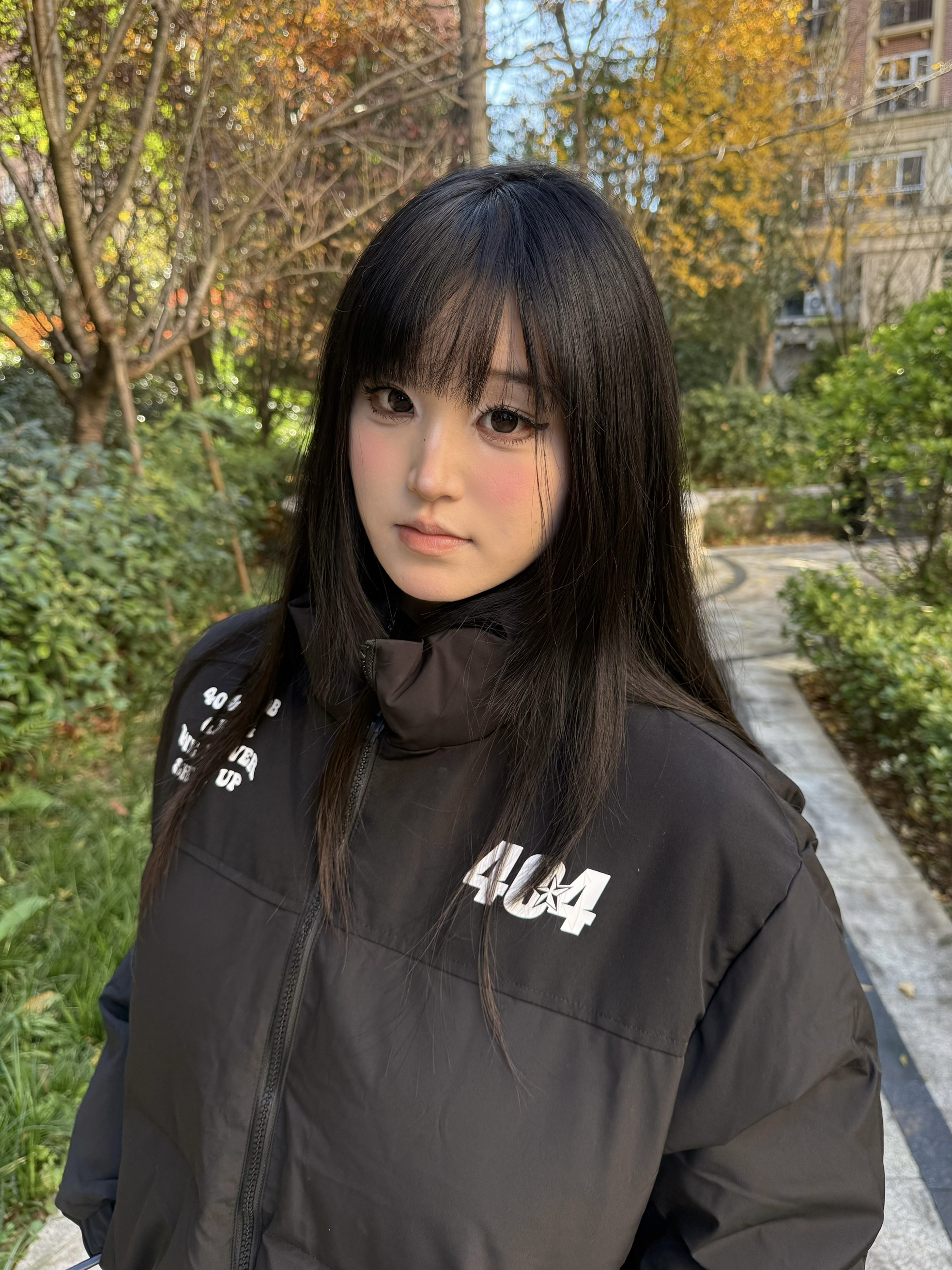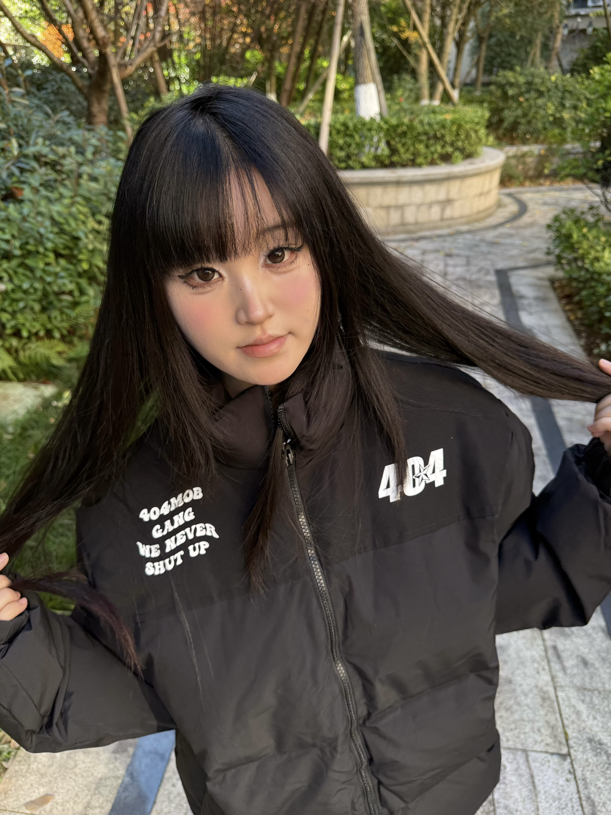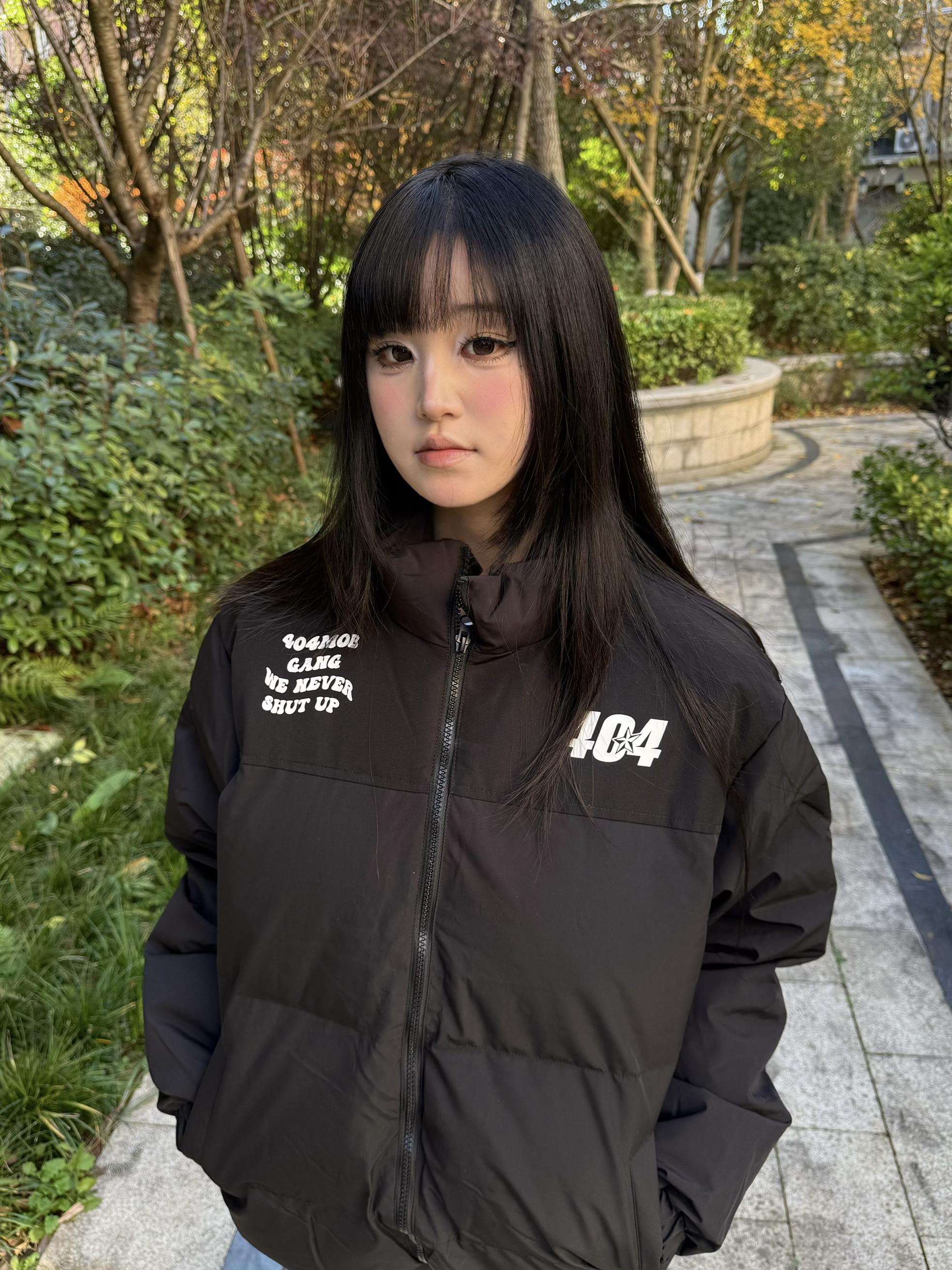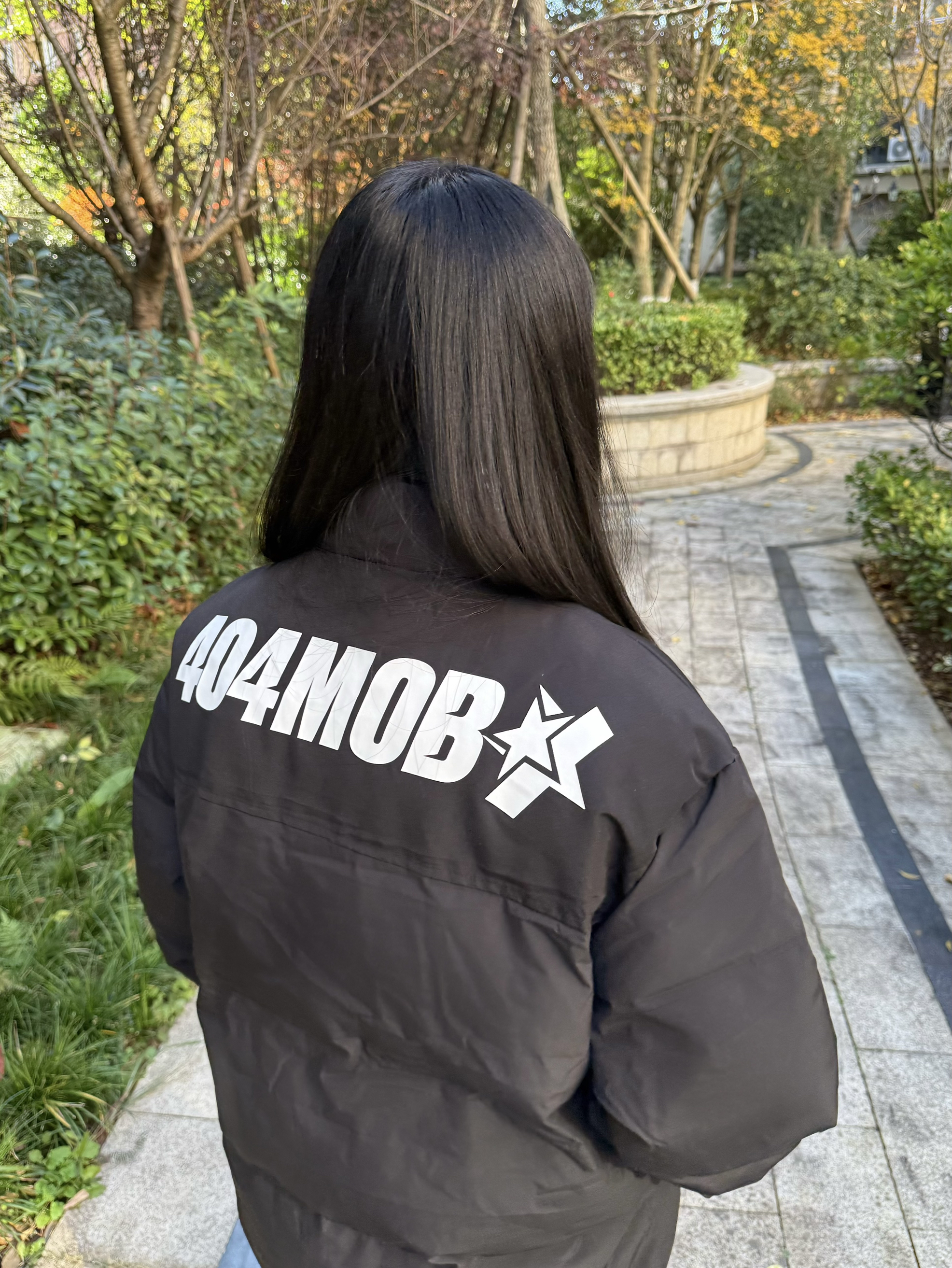 身高158cm体重47kg 穿的是M码 这件棉服还挺舒服 涤纶面+棉填充 厚但不沉 立领宽松款 404MOB印花挺耐看 搭牛仔或卫衣都合适 日常出门穿刚好