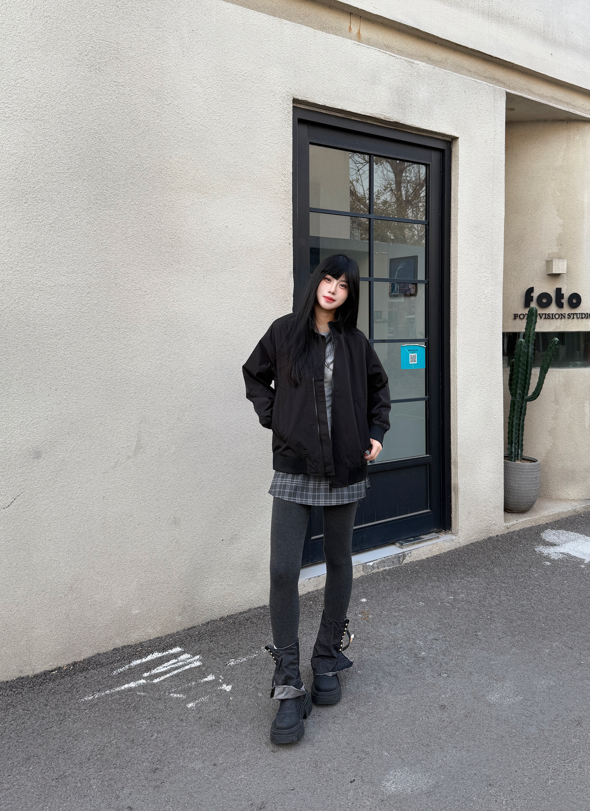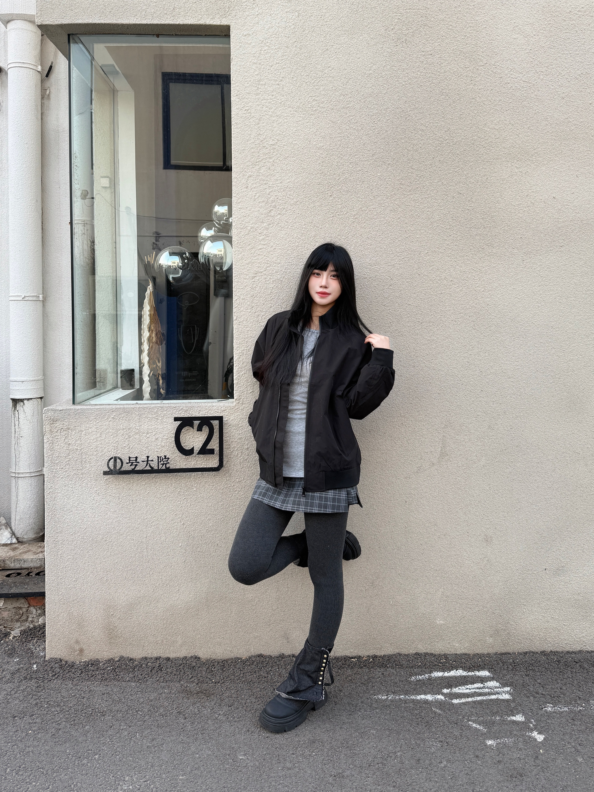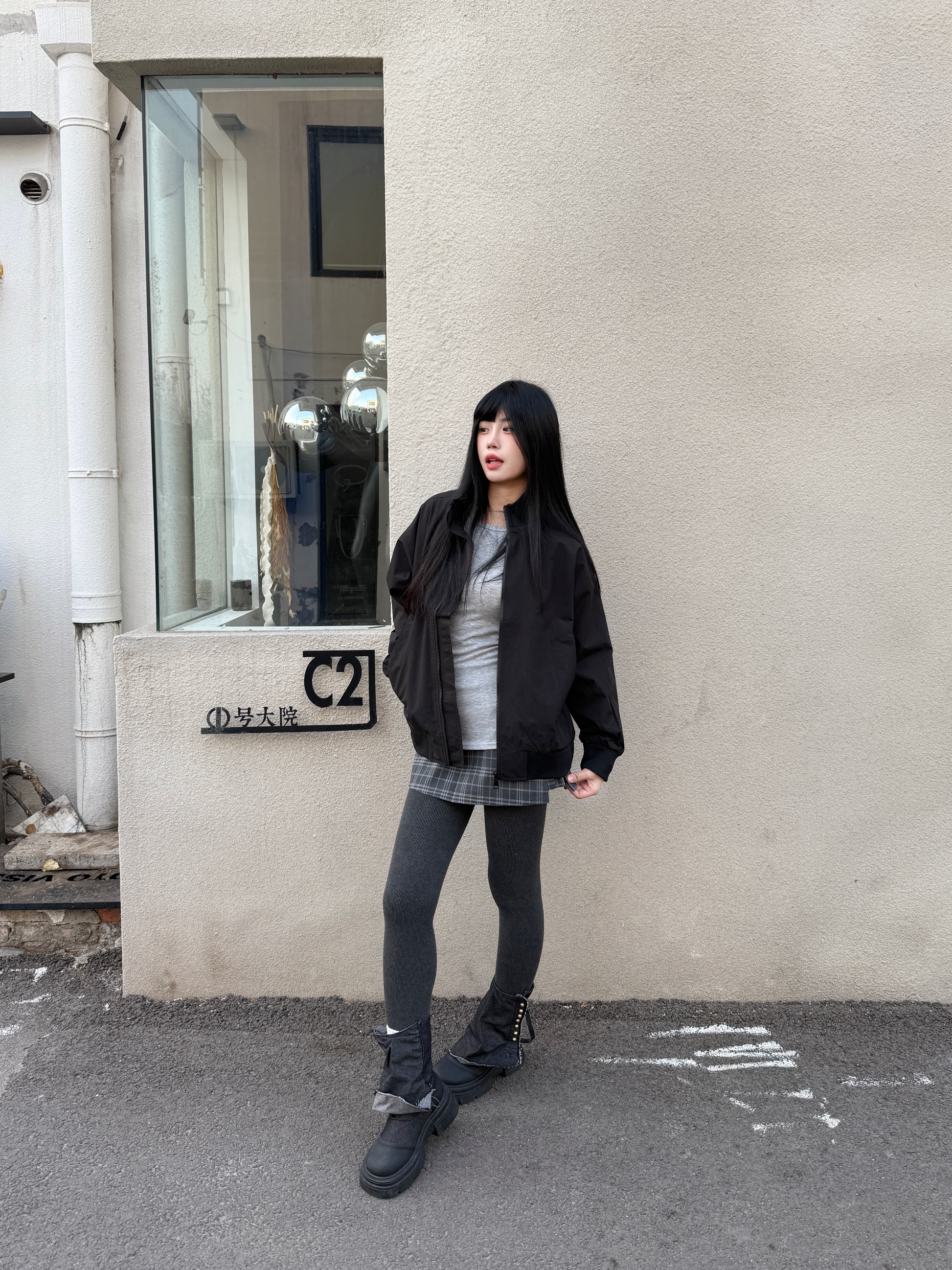 降温怎么穿 轻薄又保暖 👔上衣穿了一件黑色夹克 搭配灰色内搭增加层次感 搭配一条格纹短裙少女感满满🎊 鞋子搭配美式半靴氛围感满满 秋冬这样穿 轻薄又保暖