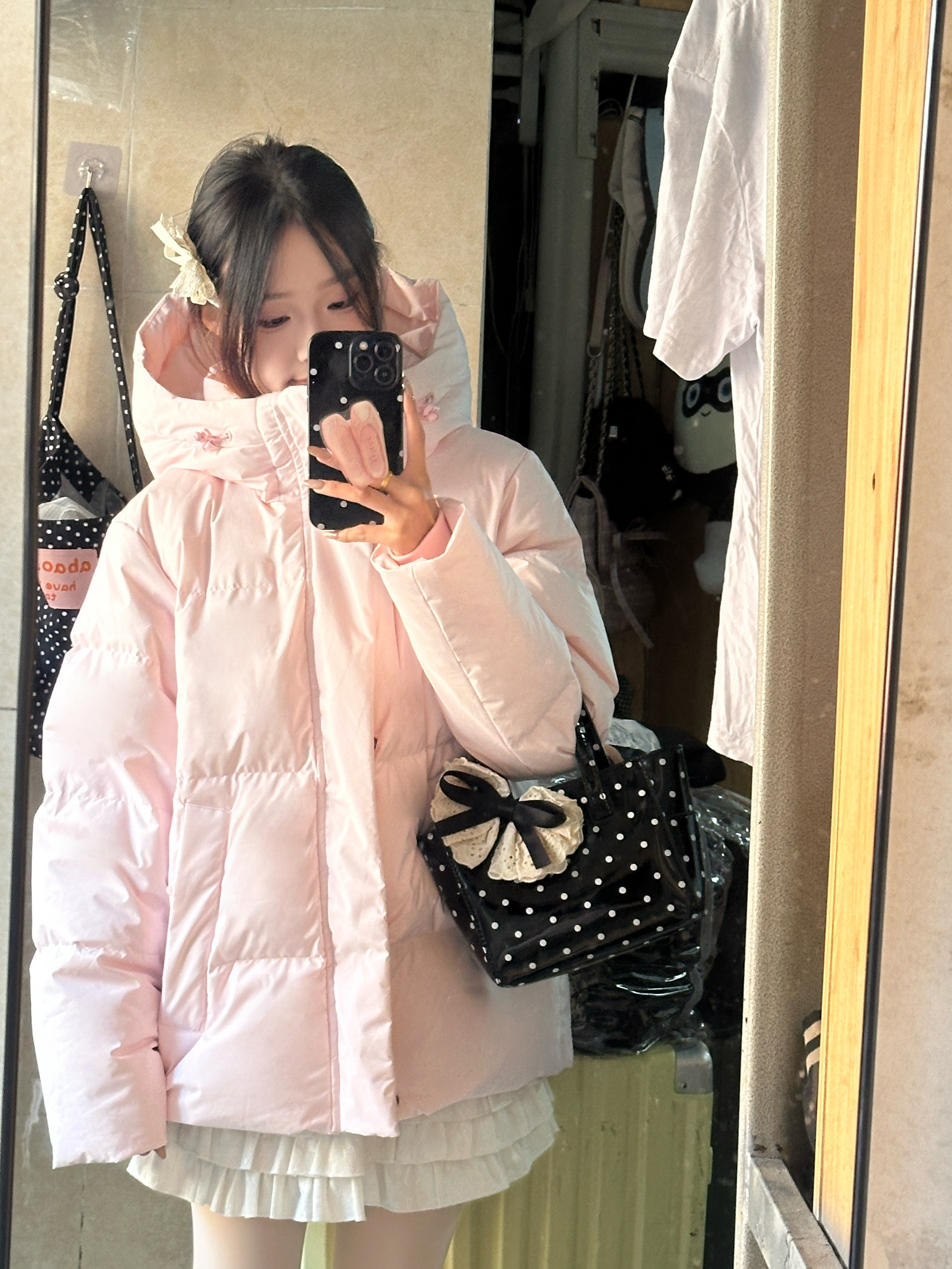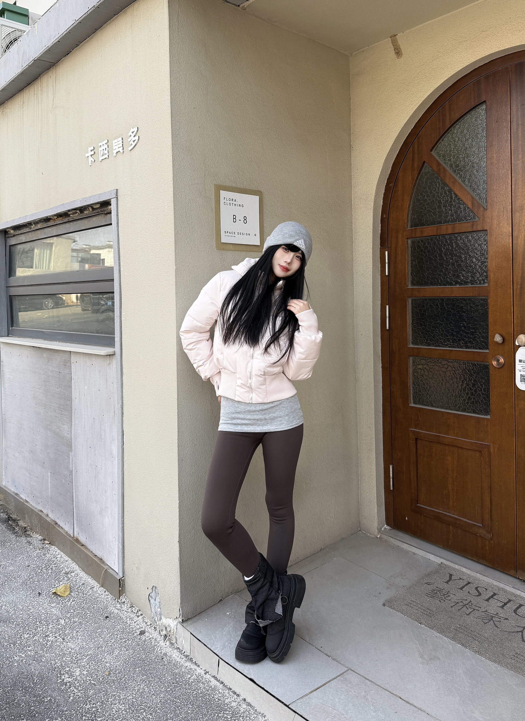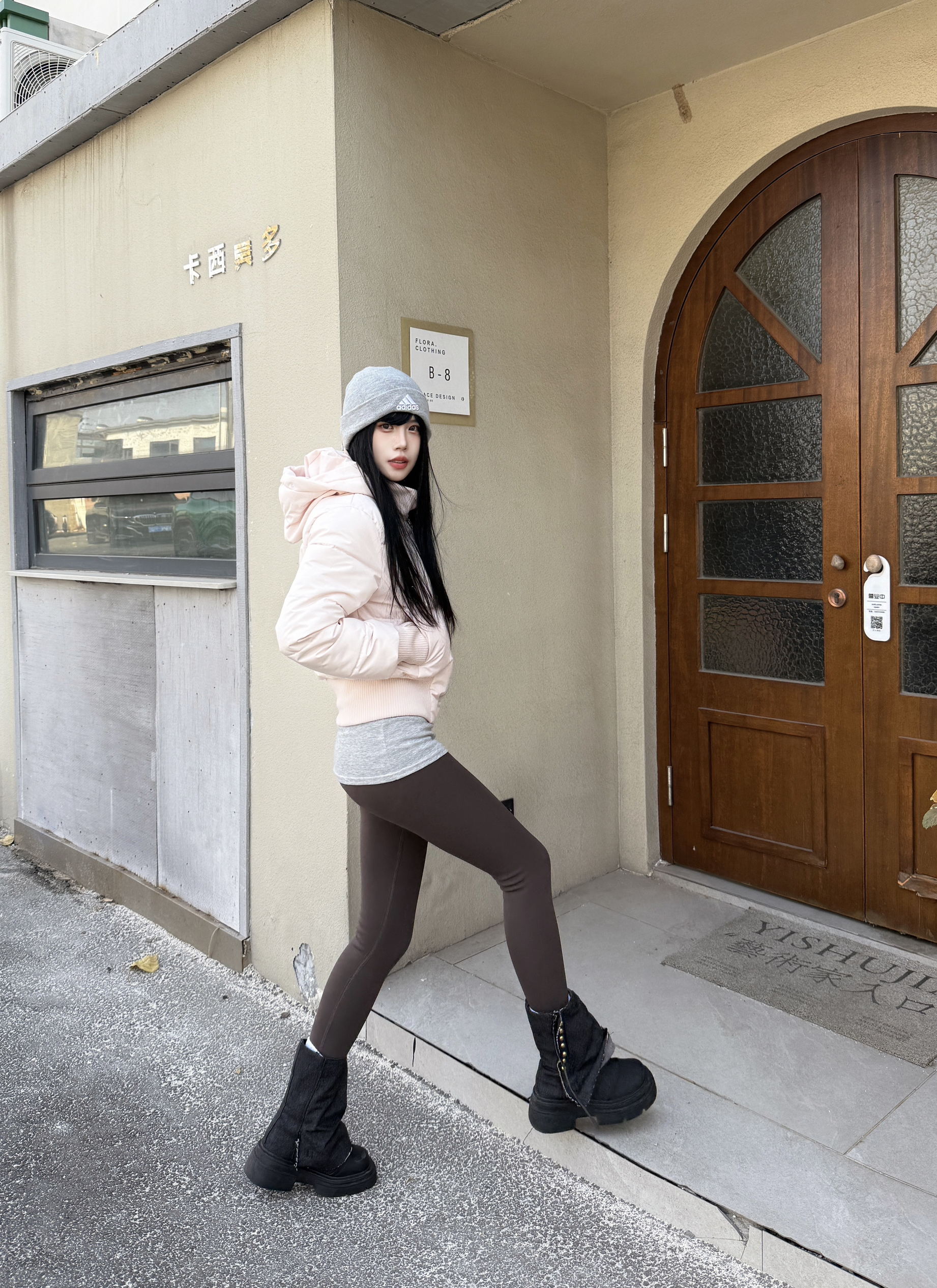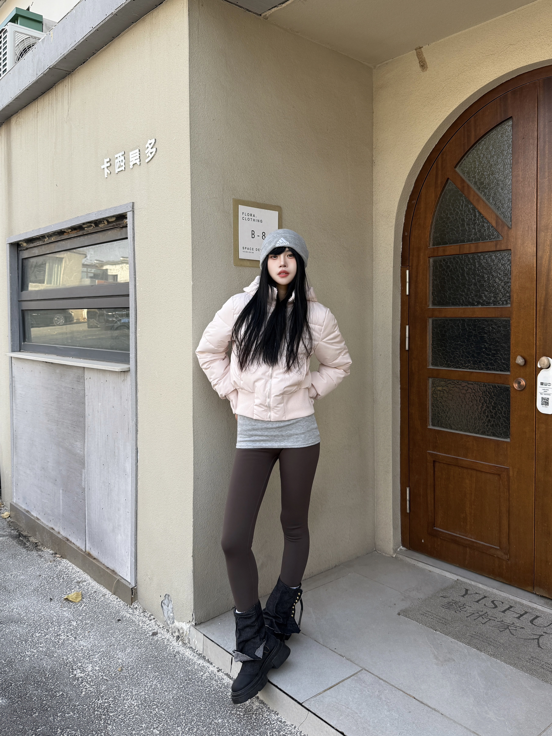 今天是少女感满满的粉色系穿搭 小巧的粉色羽绒服少女感满满 而且连帽设计很有安全感 搭配一个灰色内搭增加层次感 穿一条瑜伽裤显出好身材 最后穿一双靴子高级感满满 这套轻薄保暖look你学会了吗
