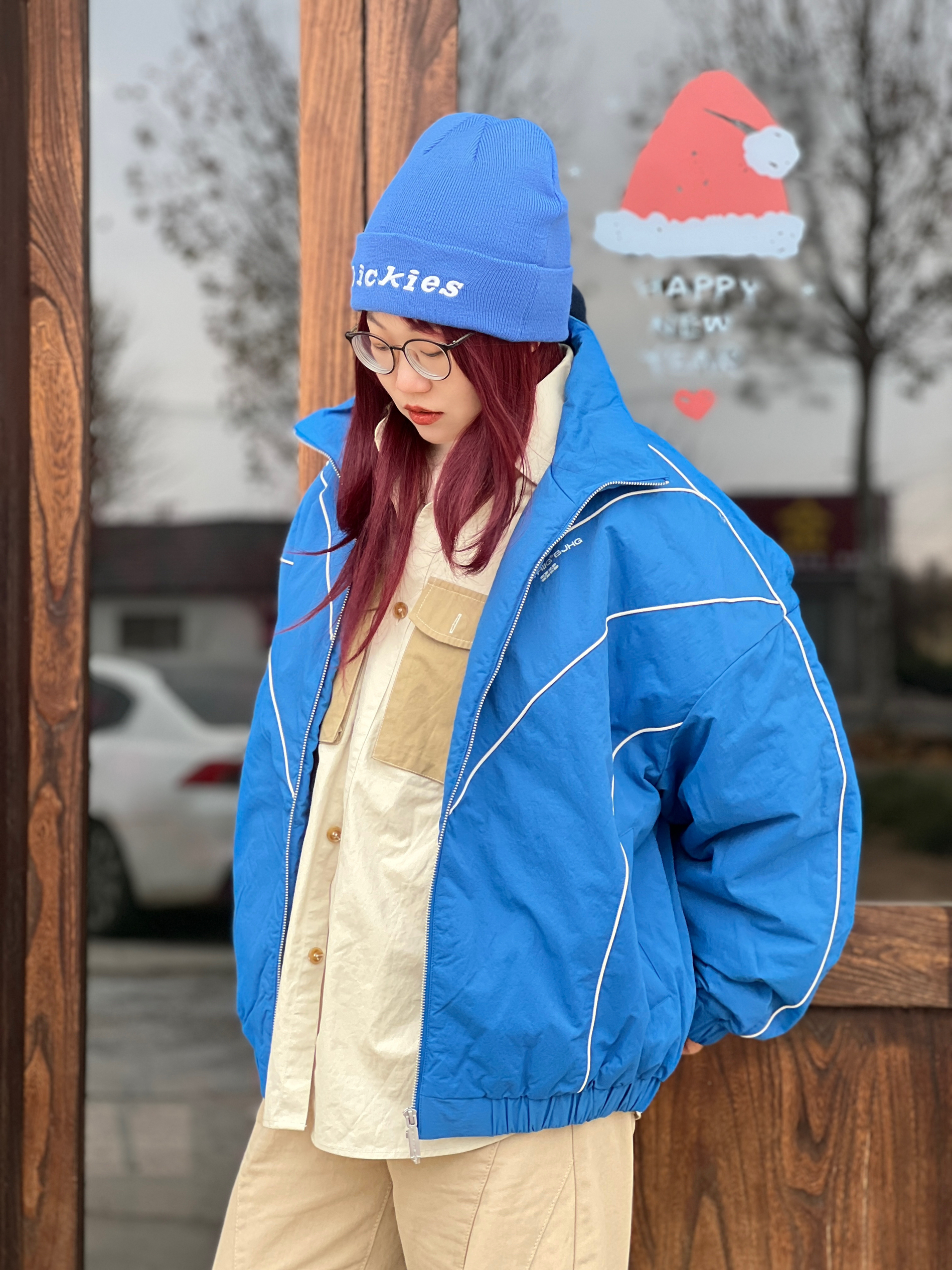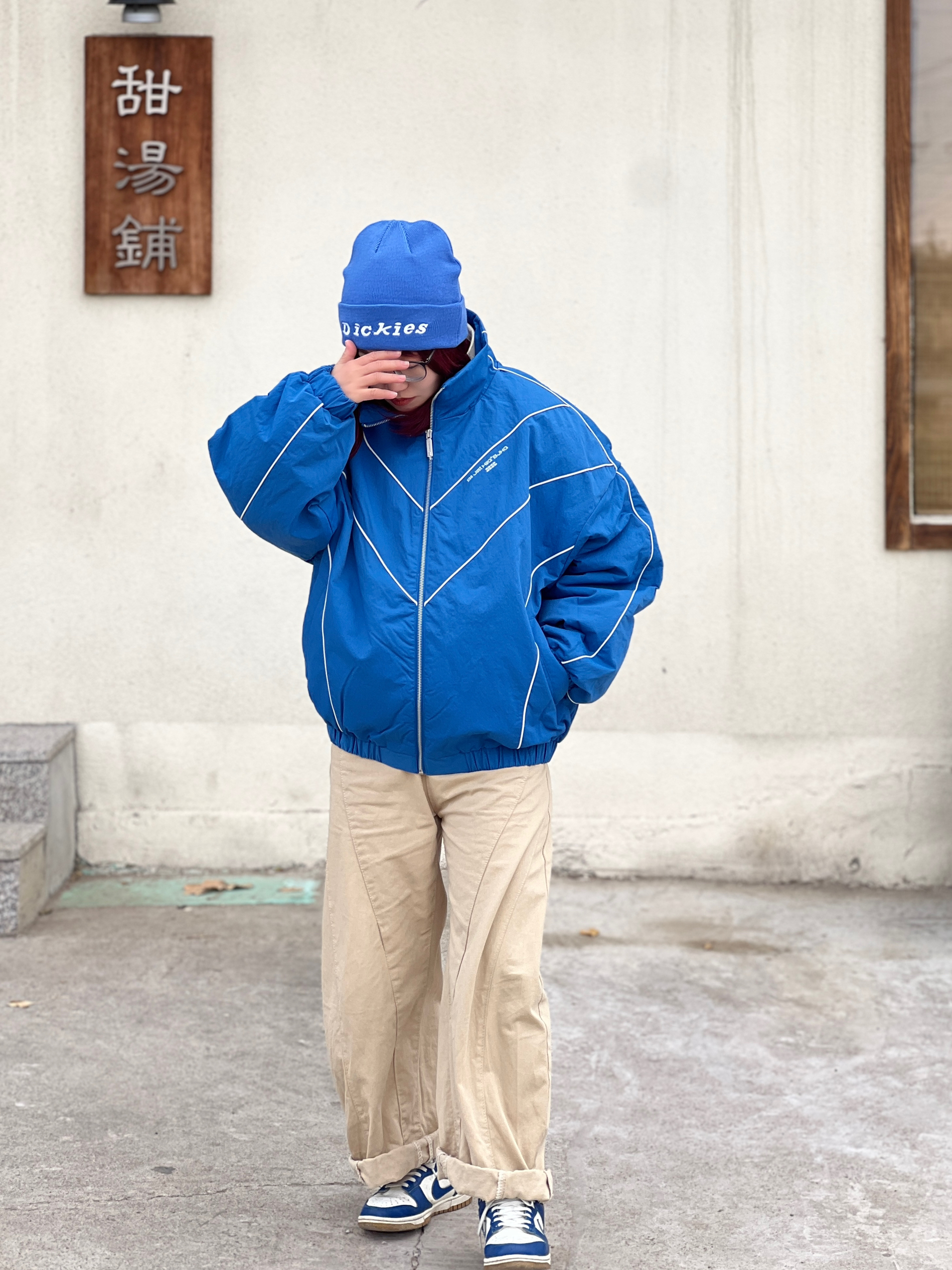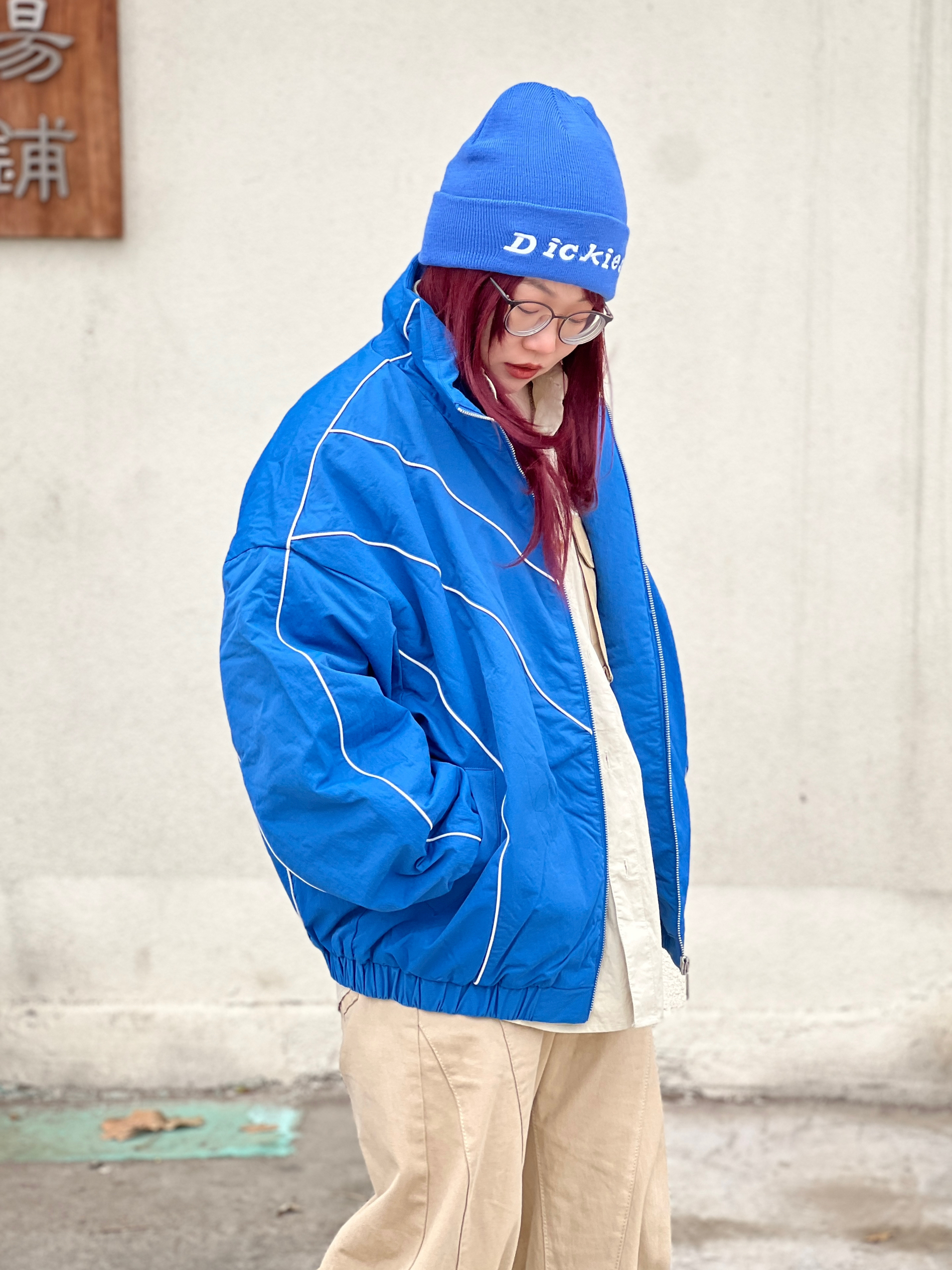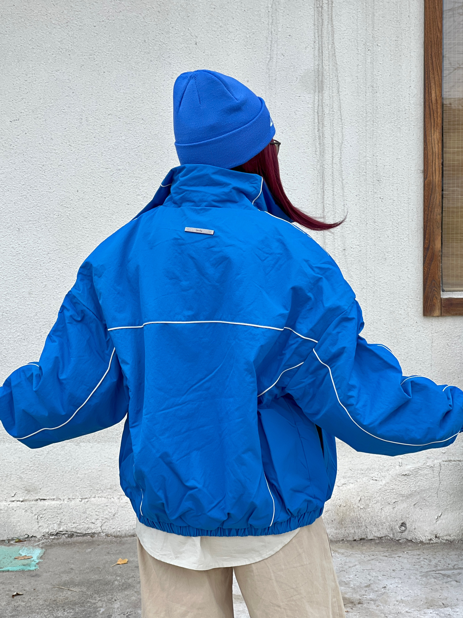 美式复古运动风真的谁穿谁潮呀❗️ 一定要选这种落肩廓形的版型才有那种街头松弛感~~~ 对我来说,坠重要的是显比例好~~头肩比就好好看💙 我好爱这个面料的褶皱肌理感 好高级! V字撞色立体线条和蓝色大底撞色 整体看起来线条感强➕又🈶️辨识度 立领和松紧袖口更防风 这个蓝色我好喜欢好吸睛🤩