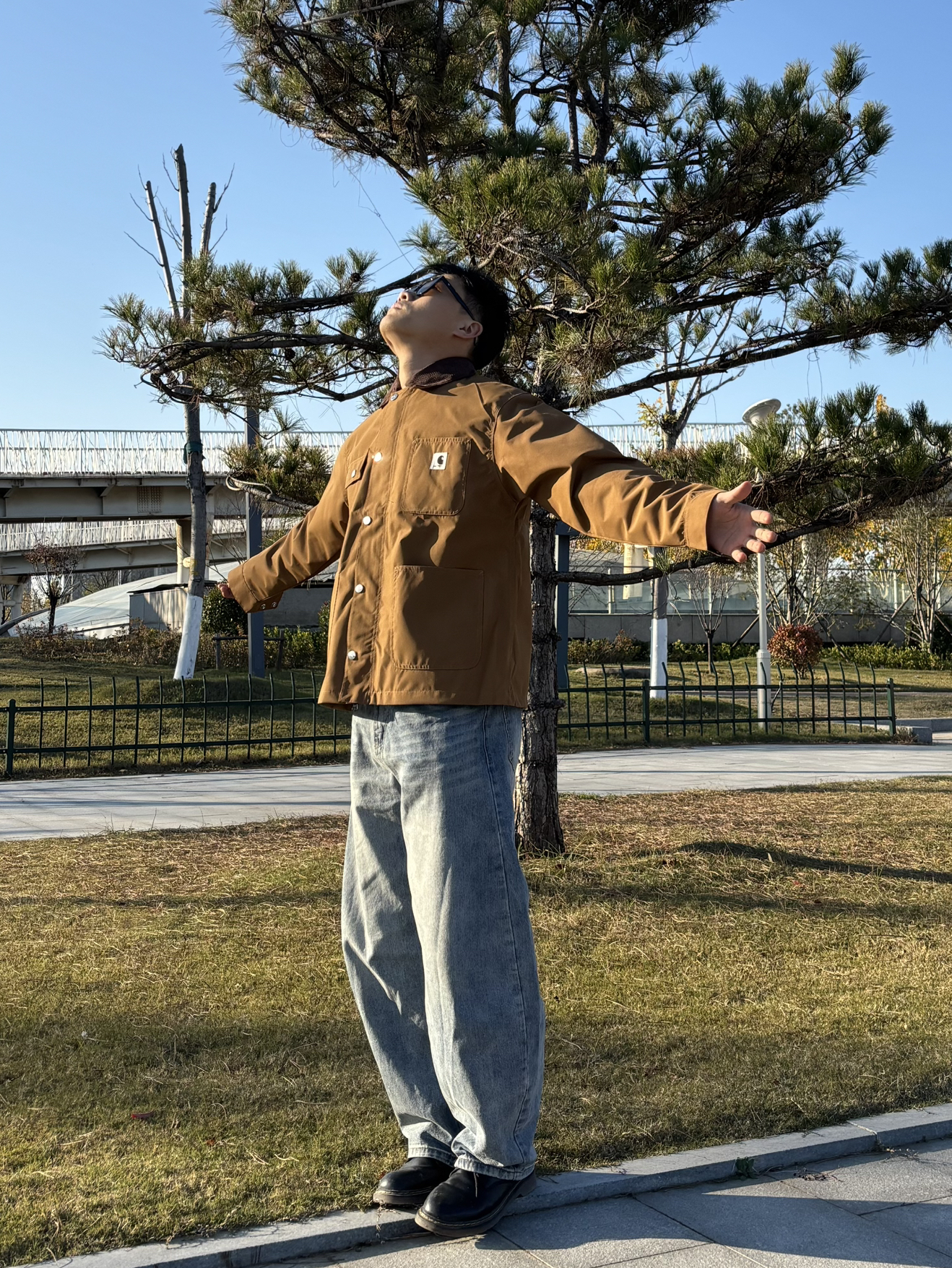 哈喽 这里是阿峰穿搭分享 今天休息日出来散散心💕 上身一件硬汉卡哈特 棕色可太好看了 内里搭一件衣服就够用 下身一件弯刀牛仔裤配马丁靴 这一套真有点牛仔的味道了😎 #一个人怎么出片 #我的降温衣橱 #男生的秋冬穿搭日记 #男大学生冬天OOTD #甜酷男生宝藏呢子夹克