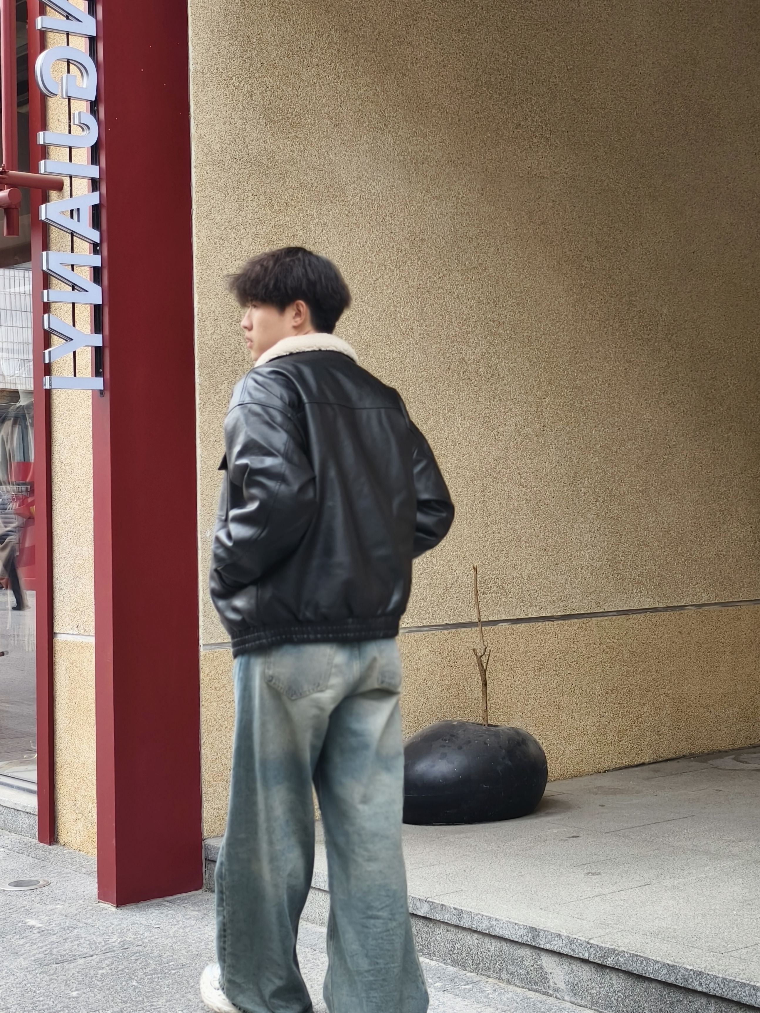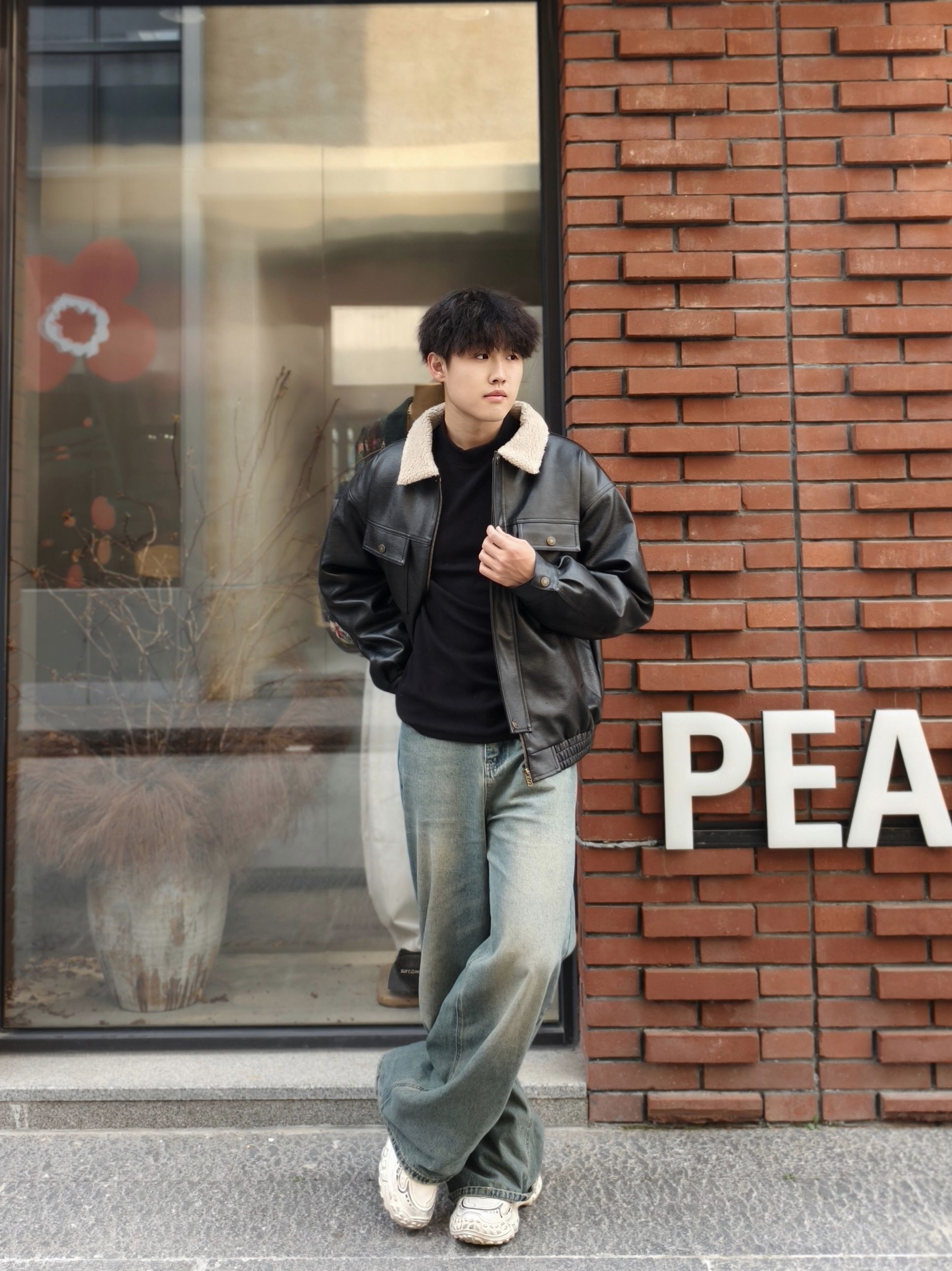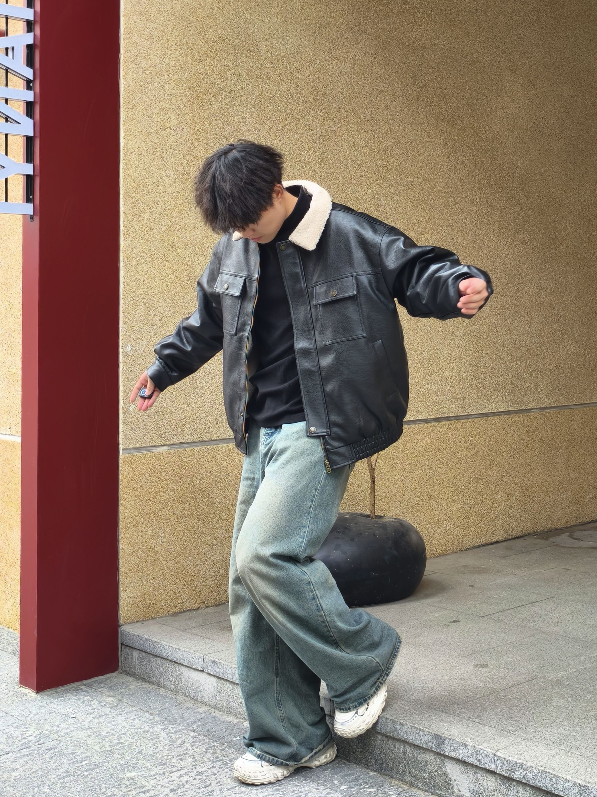 秋冬怎么少得了皮夹克!这件羊羔毛领的黑皮夹克也太戳我了🤠 内里搭黑色高领打底,简约又显瘦,下装配水洗阔腿牛仔裤,复古街头感拉满 红砖墙的背景和皮夹克适配度超高,随便拍都有那股痞帅味儿~ 🧥:羊羔毛领黑色皮夹克 👕:黑色高领打底 👖:水洗做旧阔腿牛仔裤 👟:白色休闲鞋