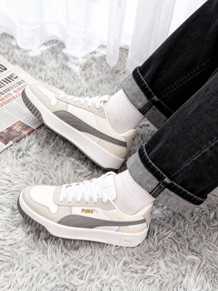 低饱和的灰白调在彪马里真的少见,鞋身的灰白带点细腻的质感拼接 上脚直接get3-4cm增高 日常出行完全没问题,皮面材质擦一擦就干净,小雨天也能放心穿👟 不管是搭牛仔裤走休闲风,还是配小短裙走甜妹路线,这双鞋都能完美适配,百元价位的百搭厚底鞋。