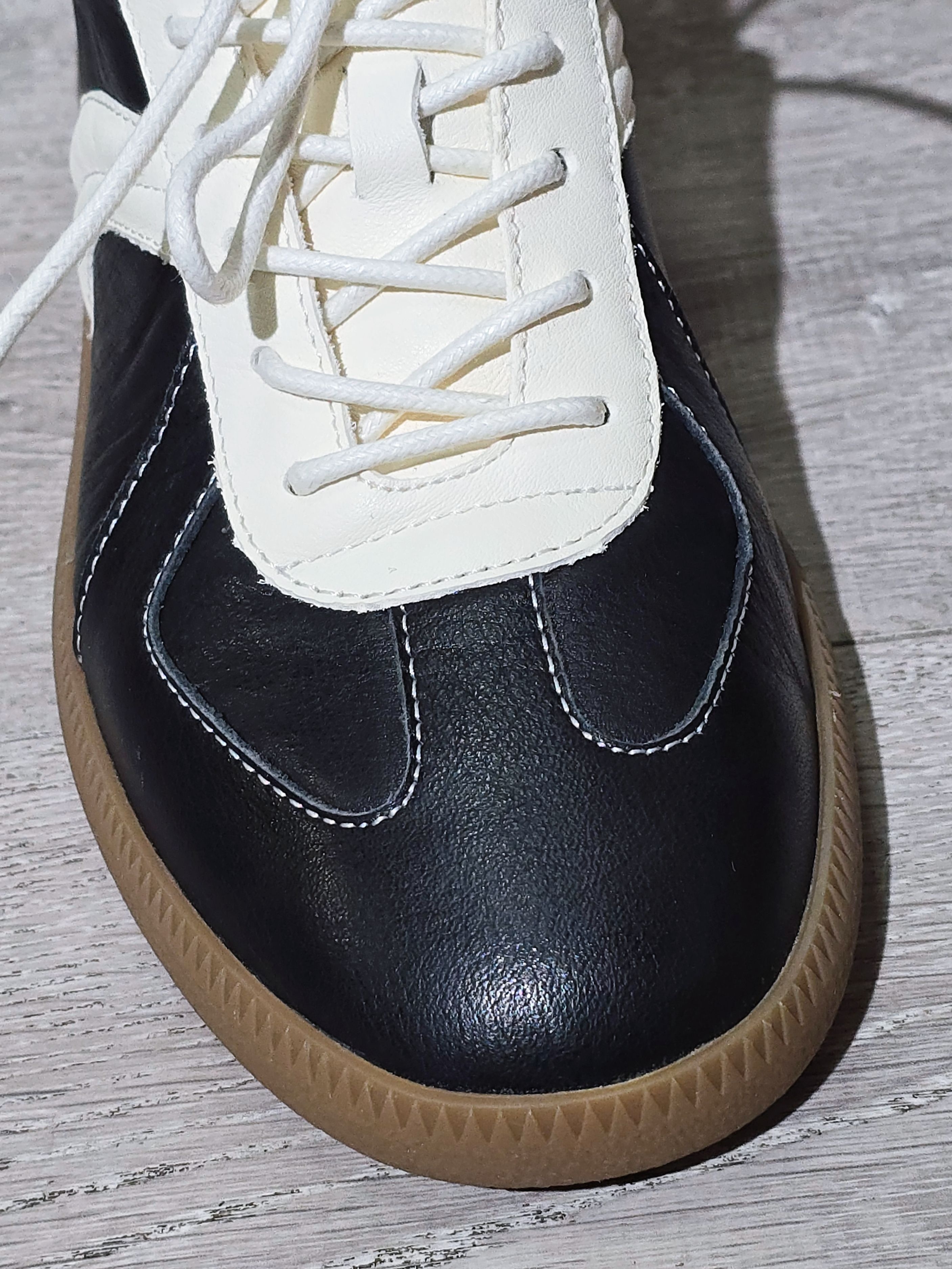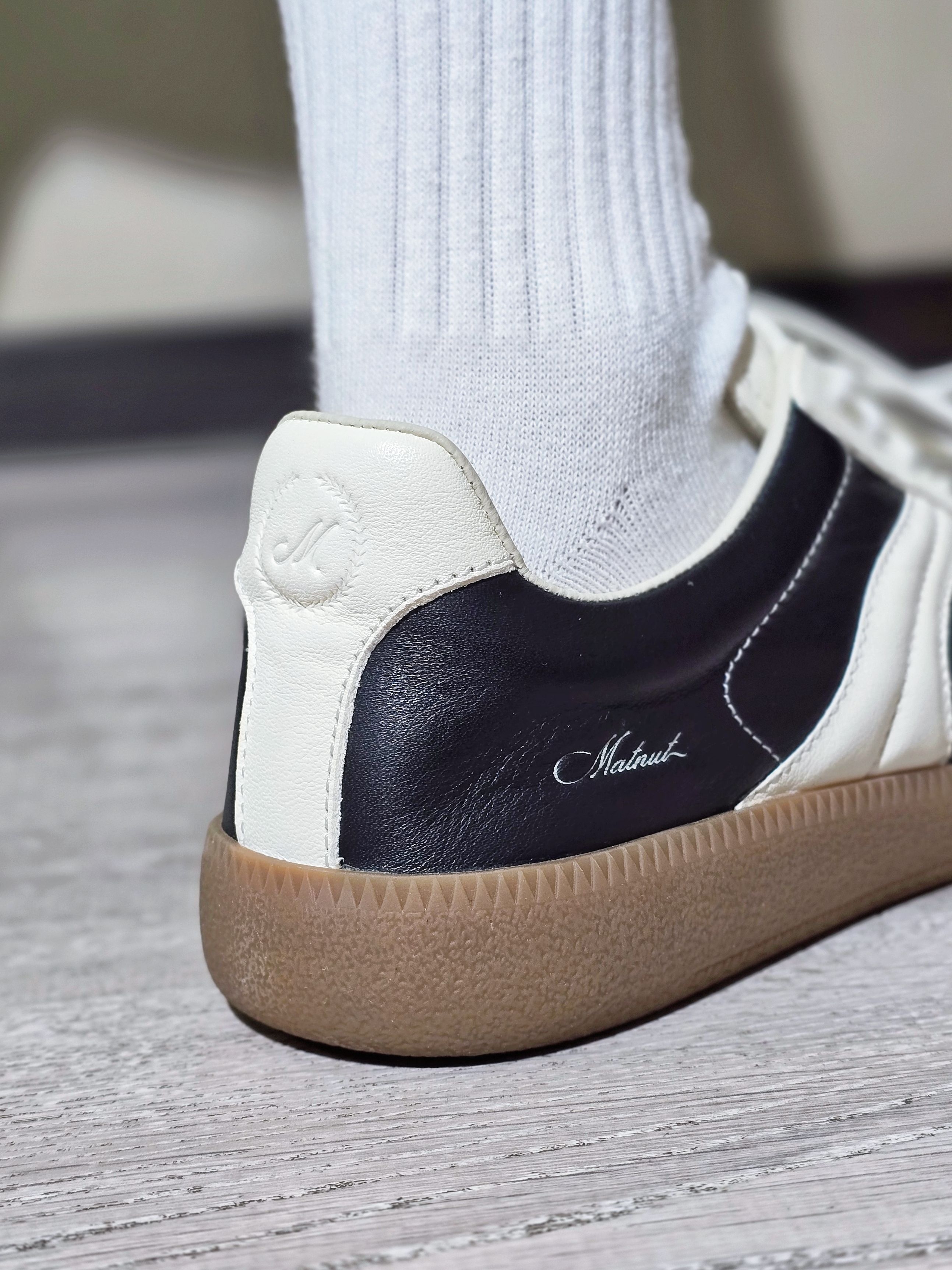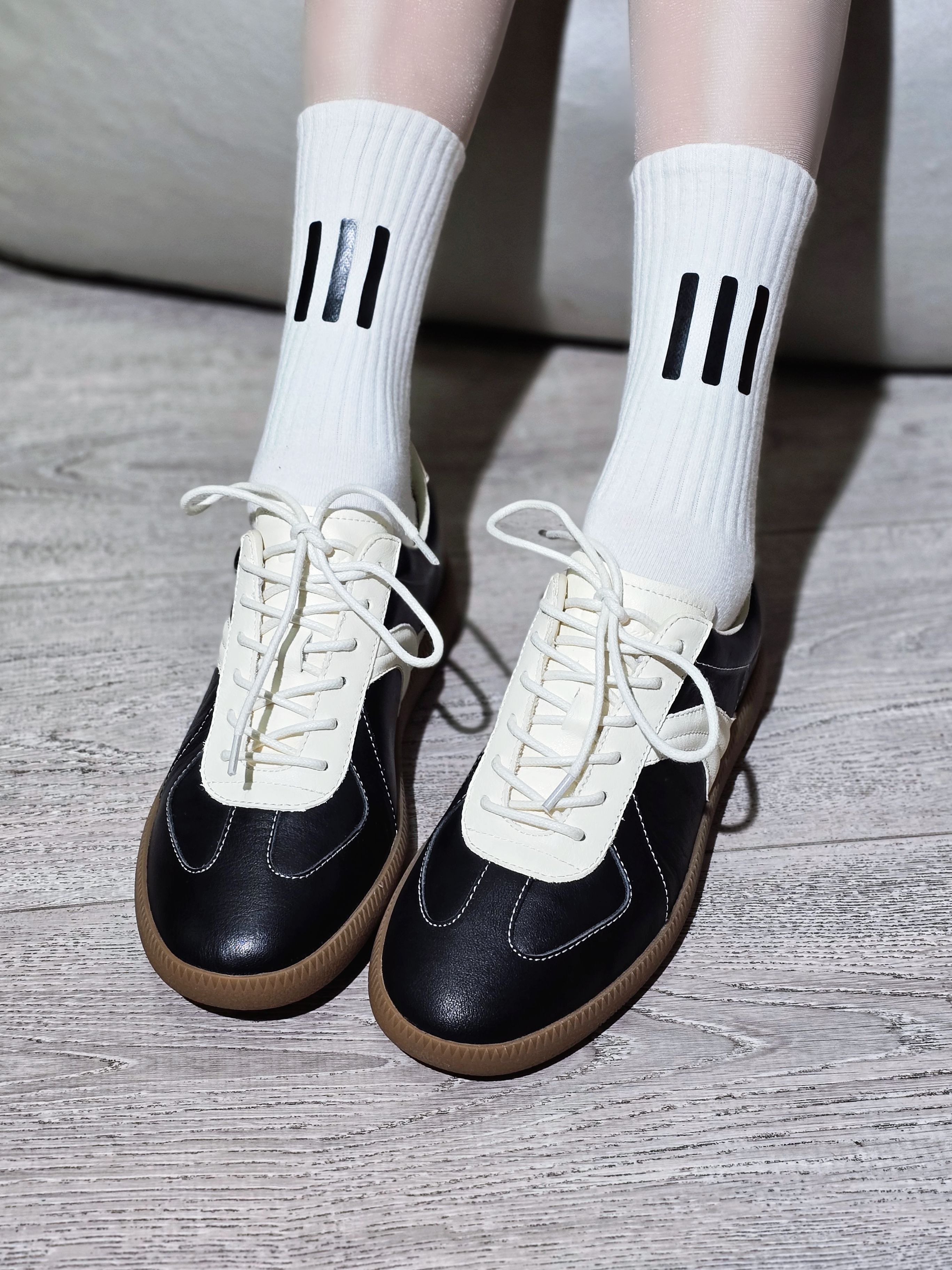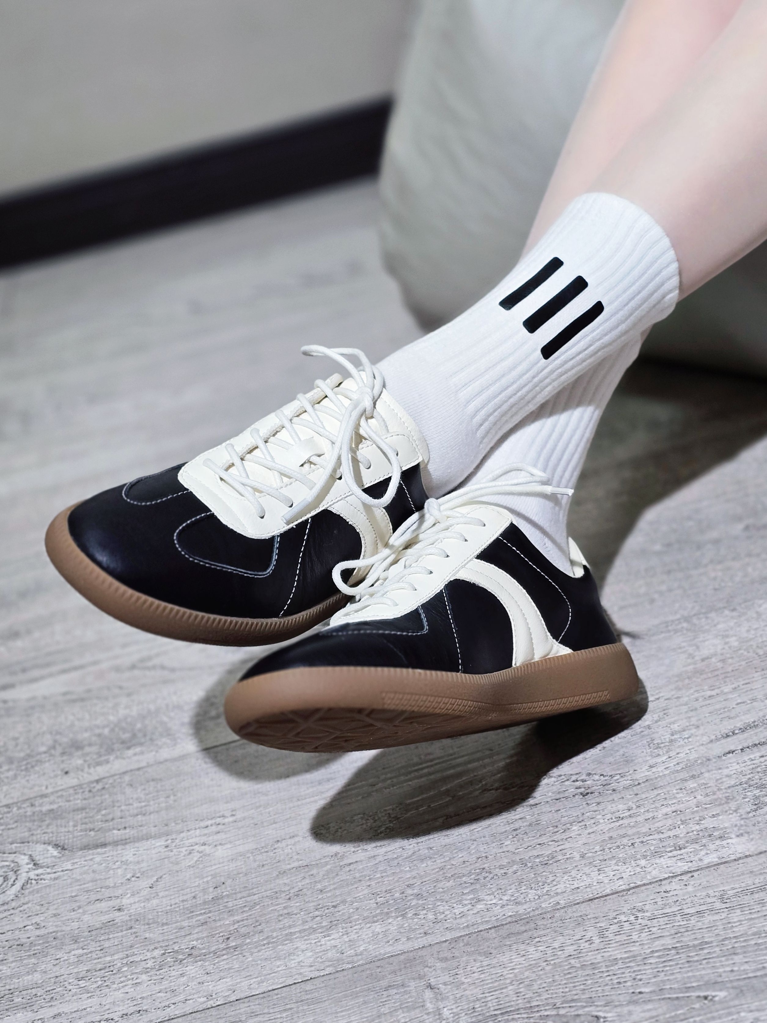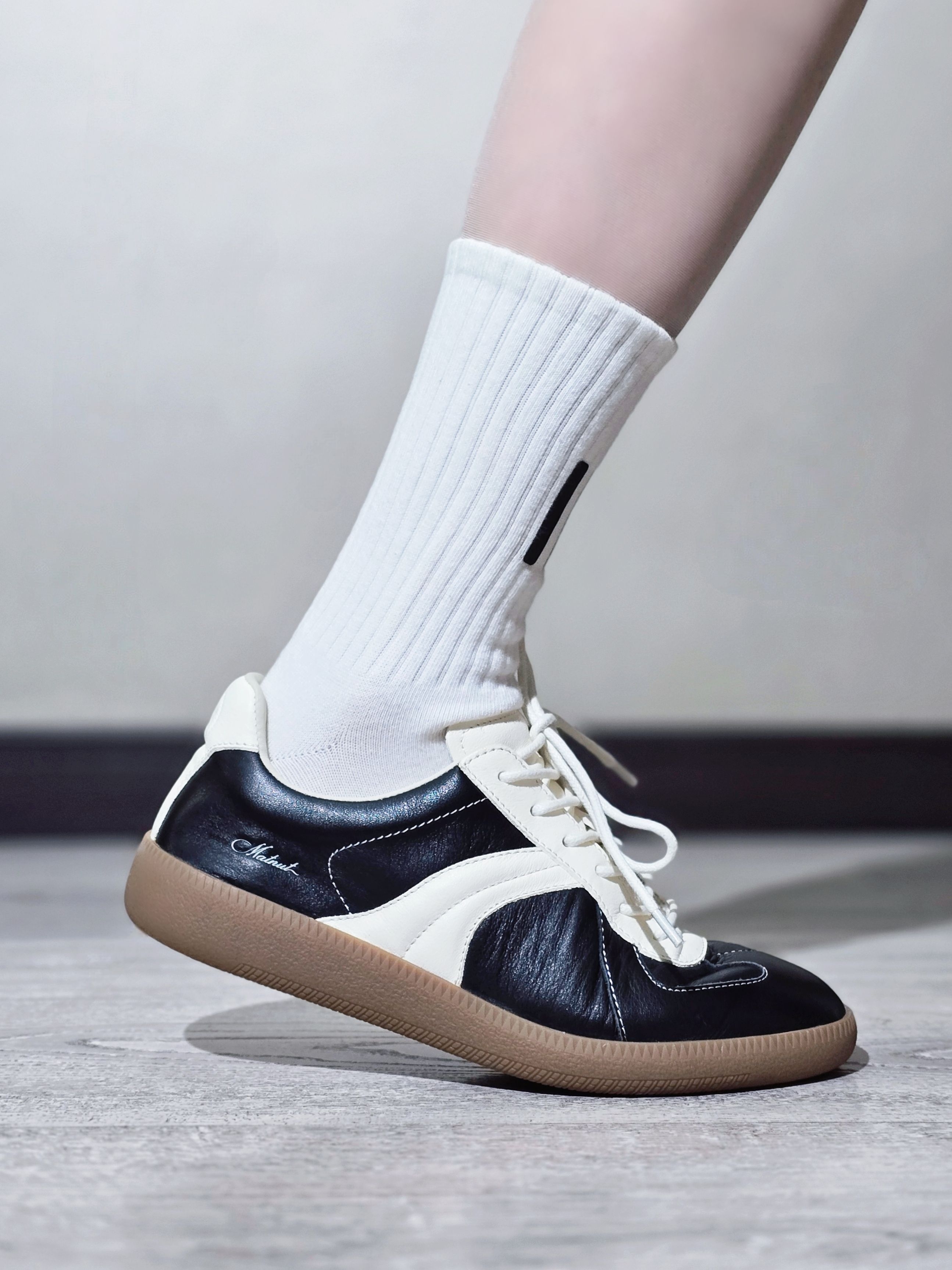 这双MATNUT RTS-01 的德训鞋好多明星上脚哎,到底有啥魅力啊?到手才发现这个头层牛皮的质感还真不是吹的,纹理光泽度都透露着高级轻奢,脚感也柔软透气舒适,对得起这个价格呀!薄底德训鞋鞋型和黑白拼色,上脚就是满满的复古摩登范儿,还属于怎么穿都错不了的那种,好容易搭配哦!