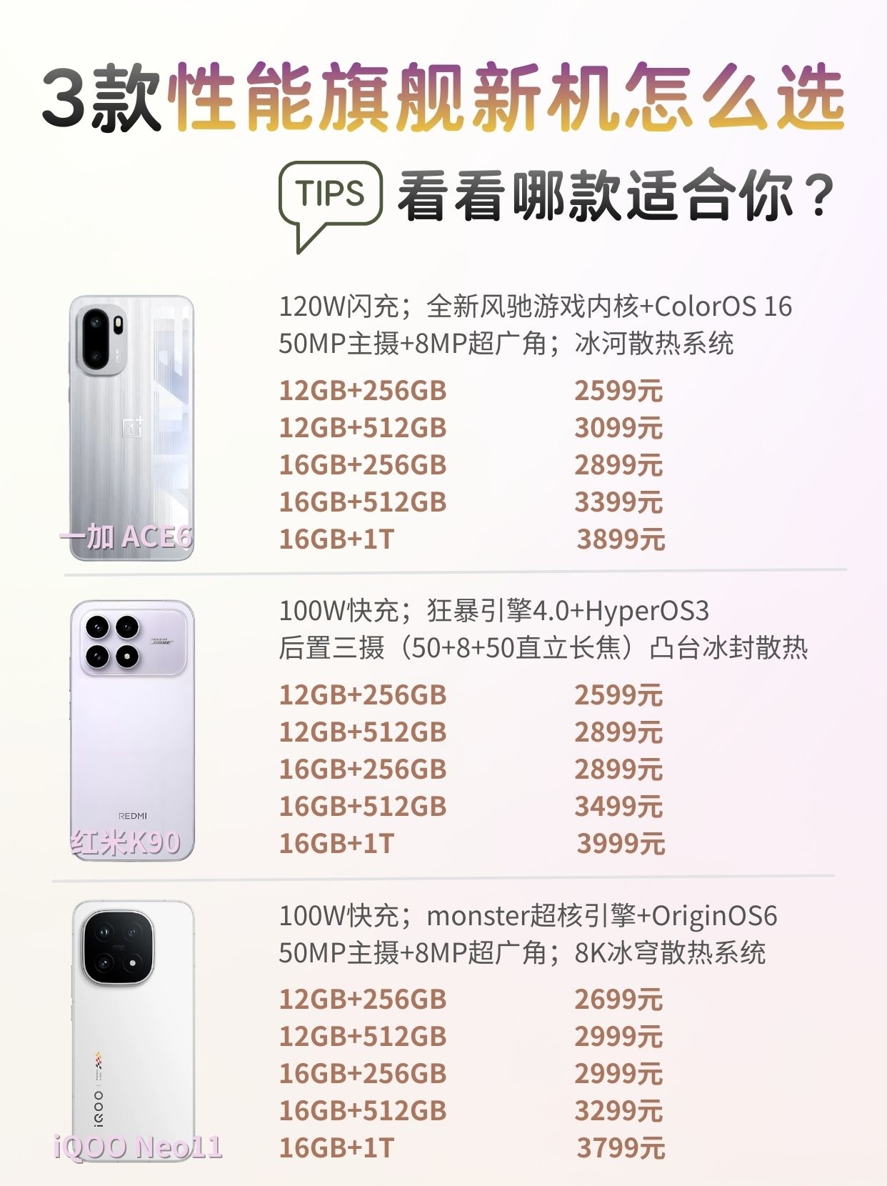 3款性能旗舰新机,选机不纠结 最近纠结换手机的宝子看过来,一加ACE6、红米K90、iQOO Neo11这三款性能旗舰各有亮点,帮你们整理好啦👇 ✨一加ACE6 搭载骁龙8至尊版,165Hz超高刷屏幕,7800mAh大电池续航很顶,还有风驰游戏内核+ColorOS 16加持,游戏体验拉满,掠影绿配色颜值也超清爽,握感很舒服。 ✨红米K90 同样是骁龙8至尊版,120Hz高刷屏,7100...