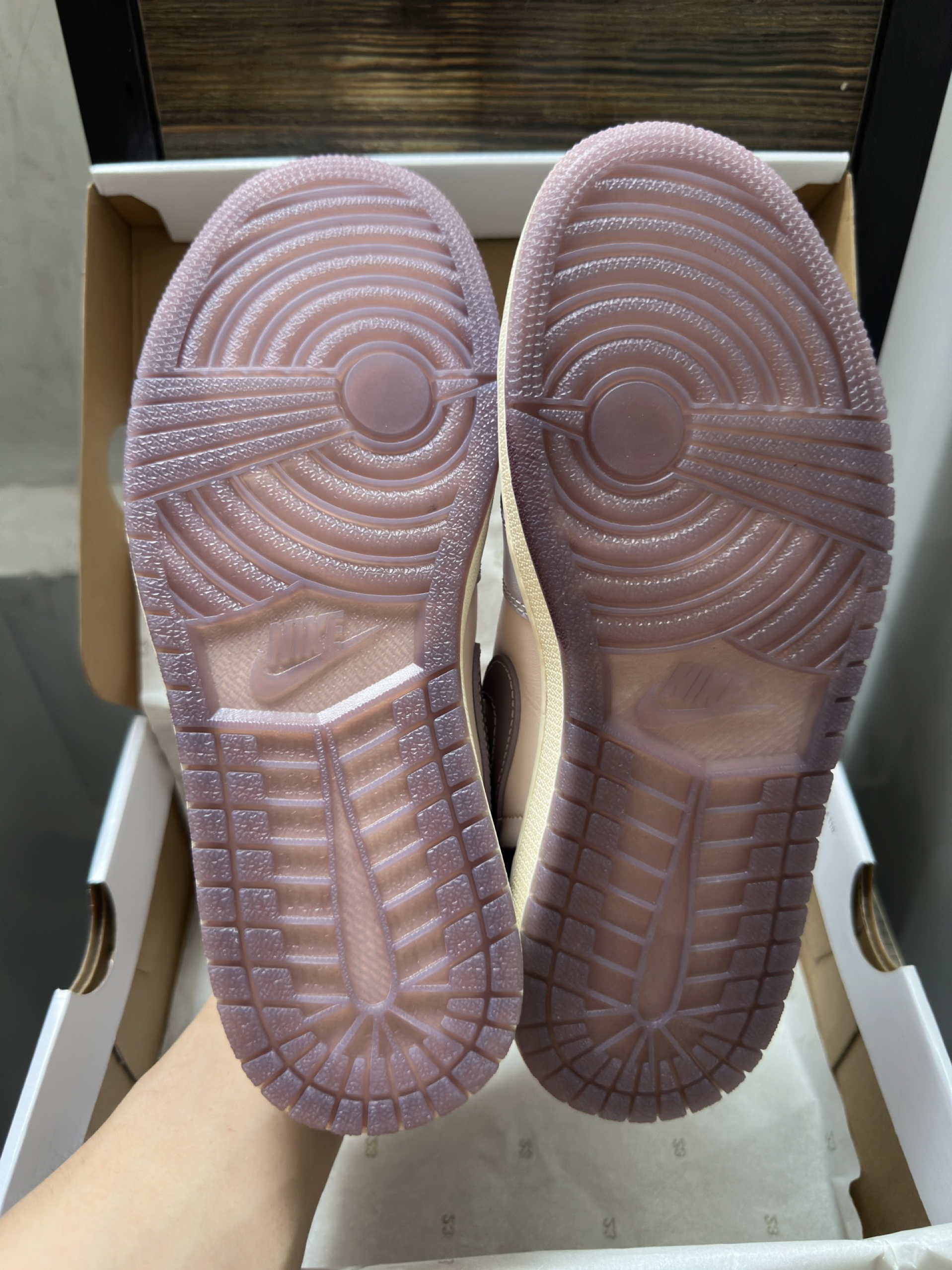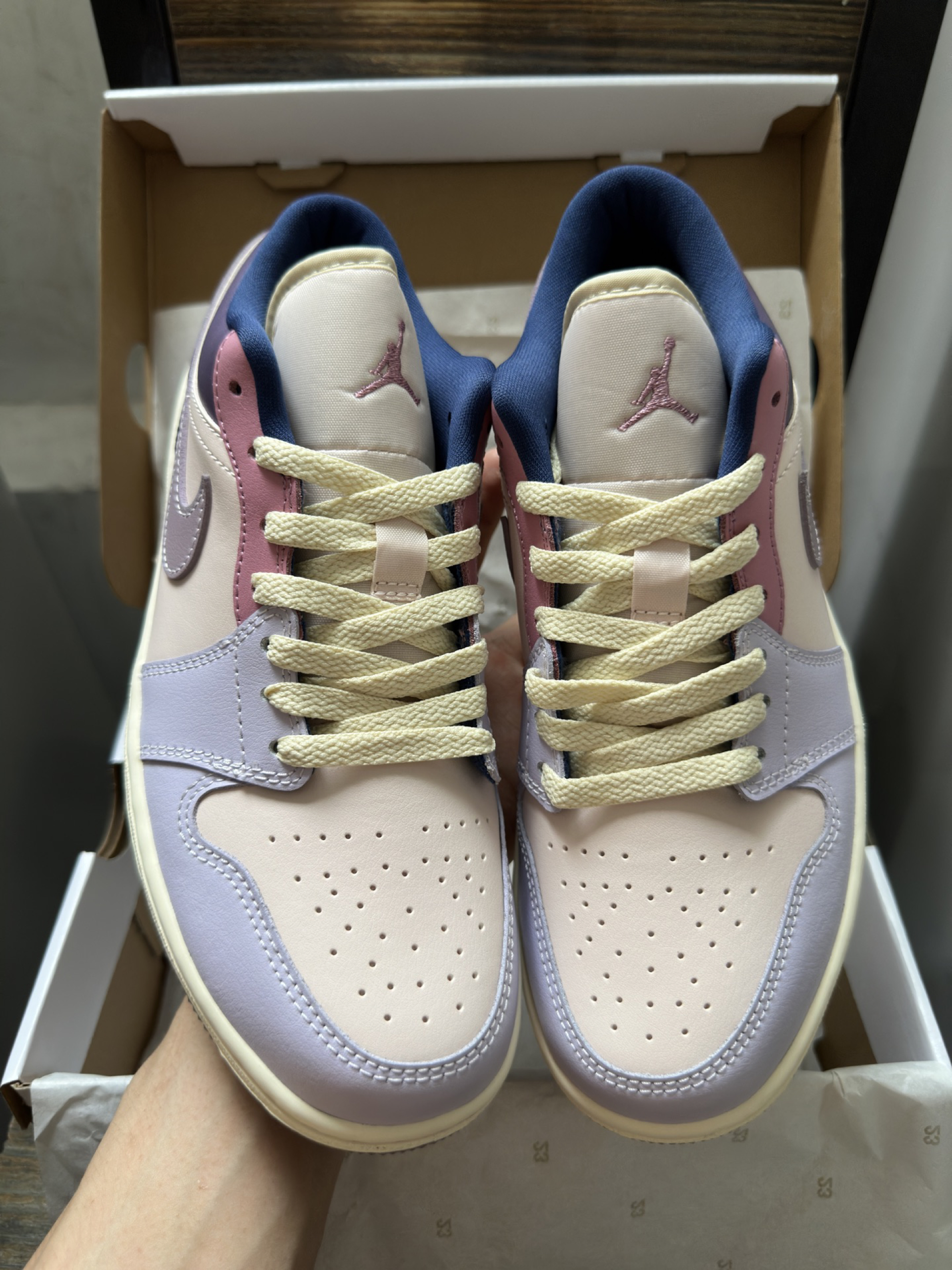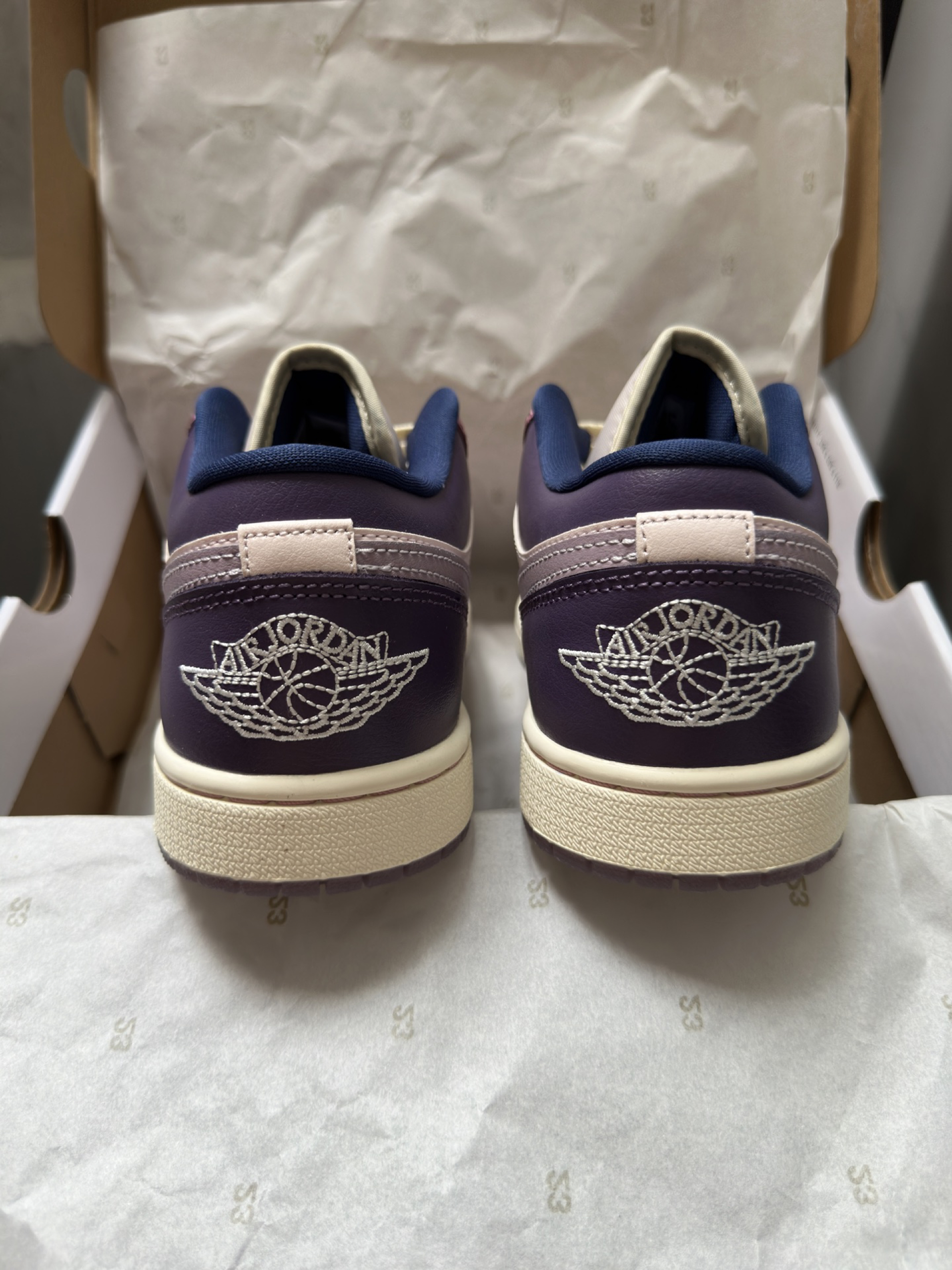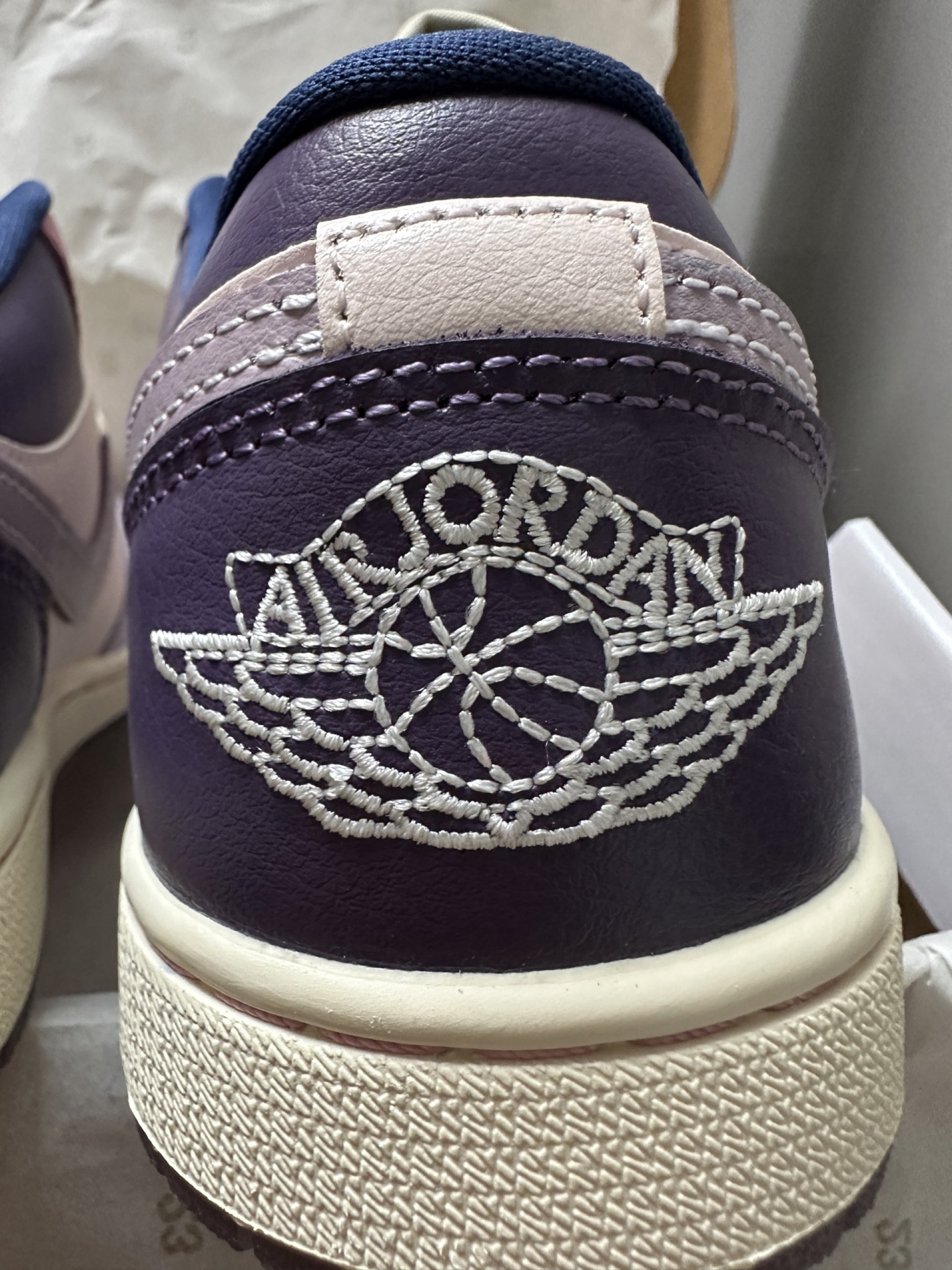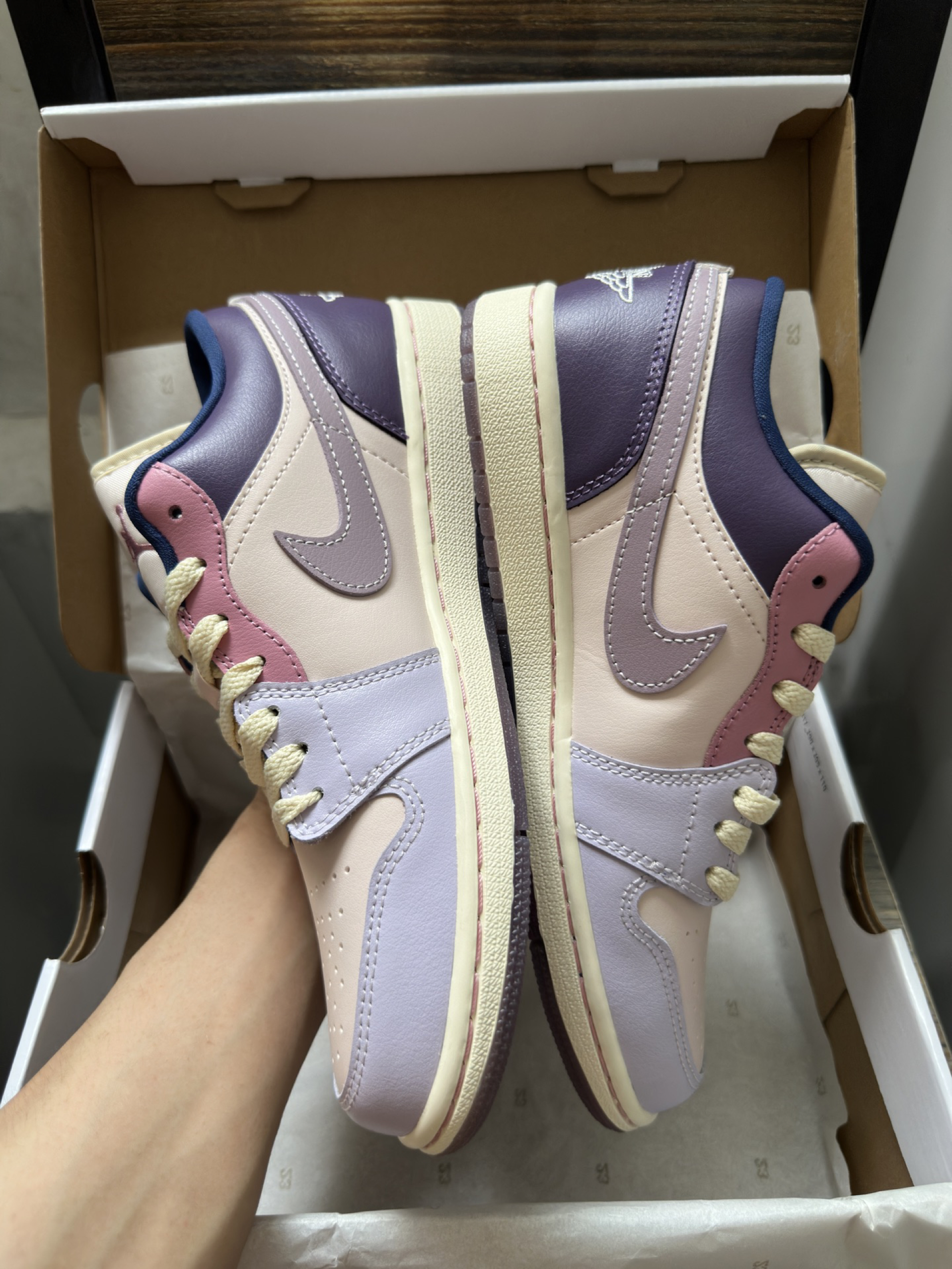 刚收到的AJ1 Low紫粉拼接款,拆开快递直接被实物惊艳到了!淡紫+裸粉的撞色超温柔,还有深紫的拼接细节,整体色调很有层次感,完全不会显黑。皮质摸起来很软,鞋型也很秀气,上脚脚感很舒服,不会磨脚,搭配牛仔裤、运动裤都超合适,今年的本命板鞋就是它了~