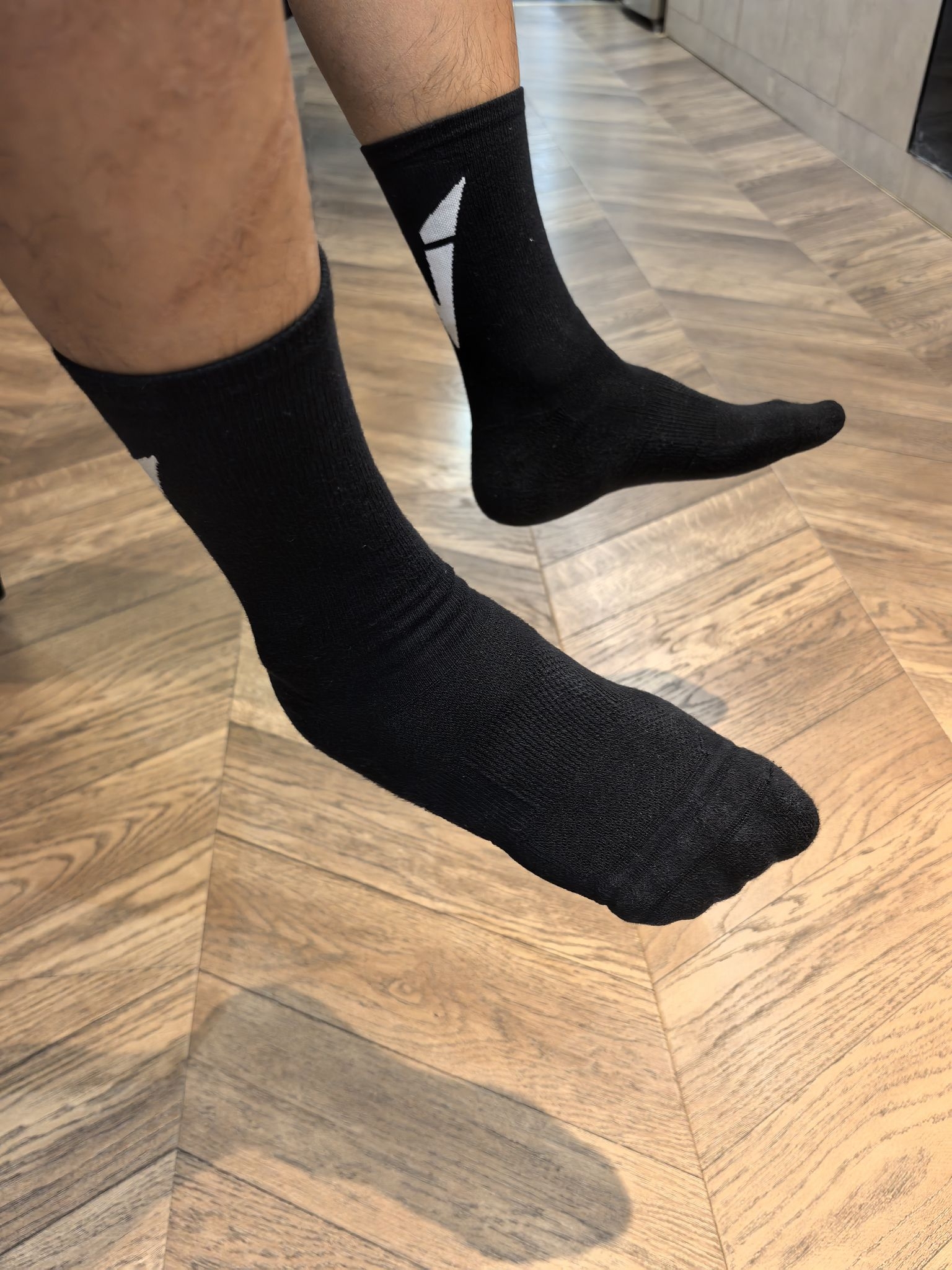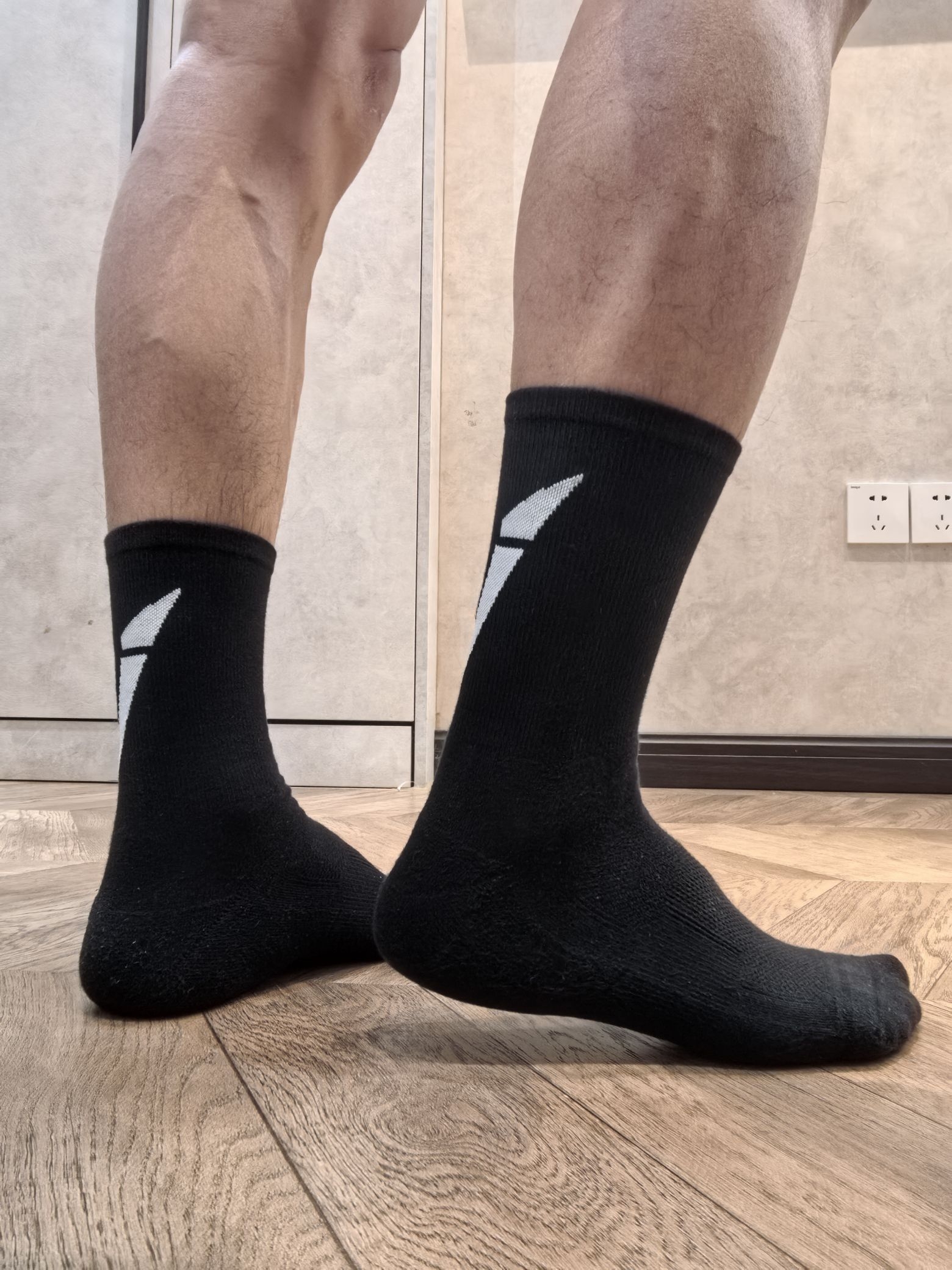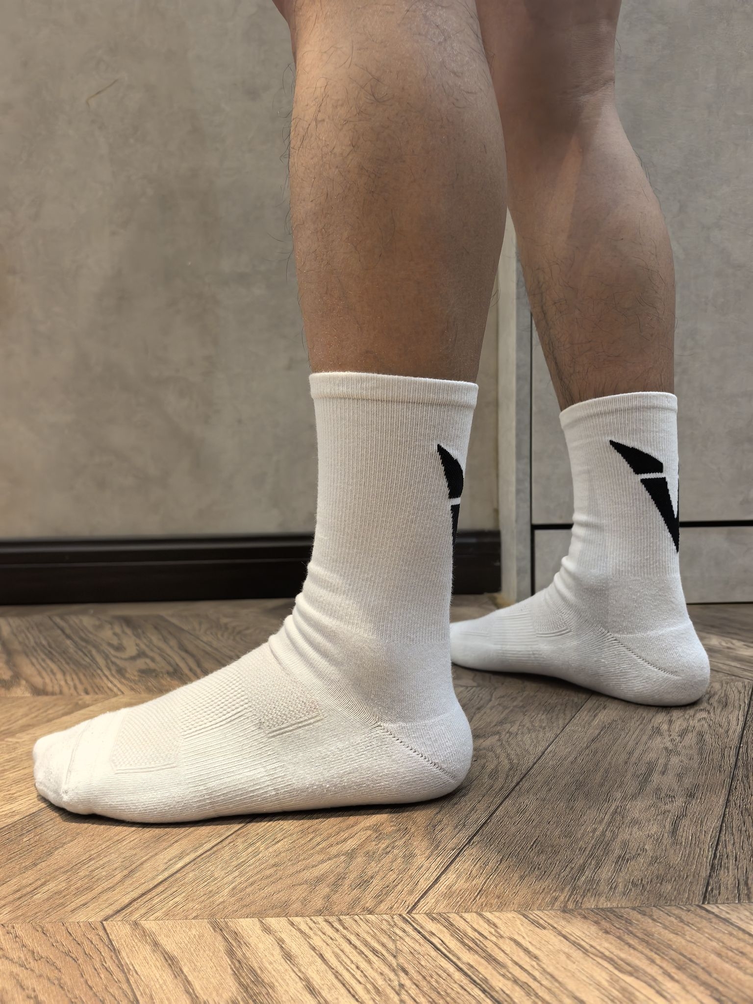 今天穿的维动这款运动袜,采用的是一个黑白撞色的设计,简约的外观在后脚跟增加了一点点小个性!袜子厚度属于中等吧,一年四季都可以穿!毛巾底袜底,脚背处还做了大面积透气,适合日常休闲和一些轻运动穿着。有黑白两个颜色可选!