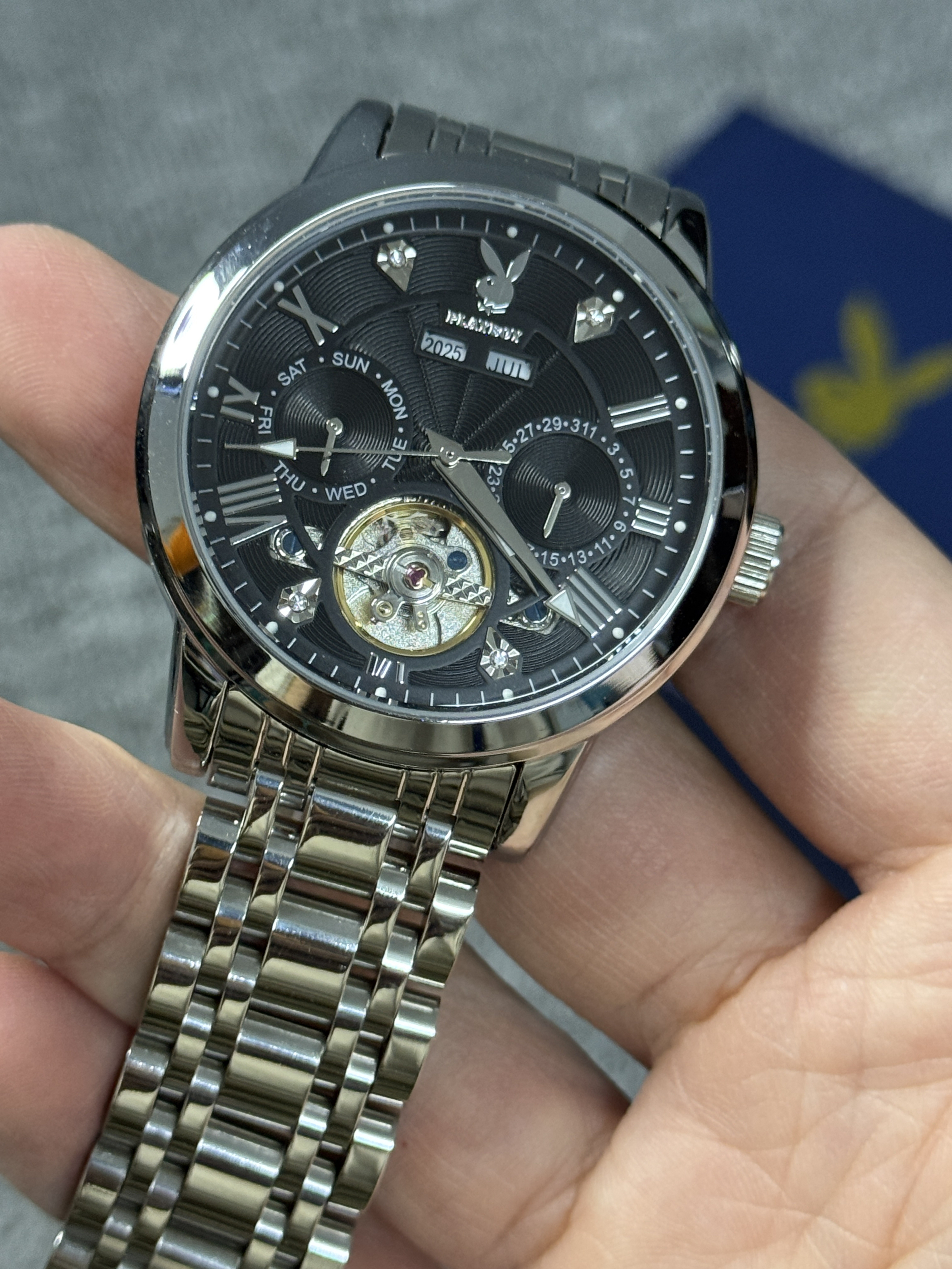 本篇笔记关联了Playboy/花花公子 新款镂空潮流双日历防水钢带全自动机械男士手表 银黑钢带等商品,为用户提供真实的使用体验和购买参考。