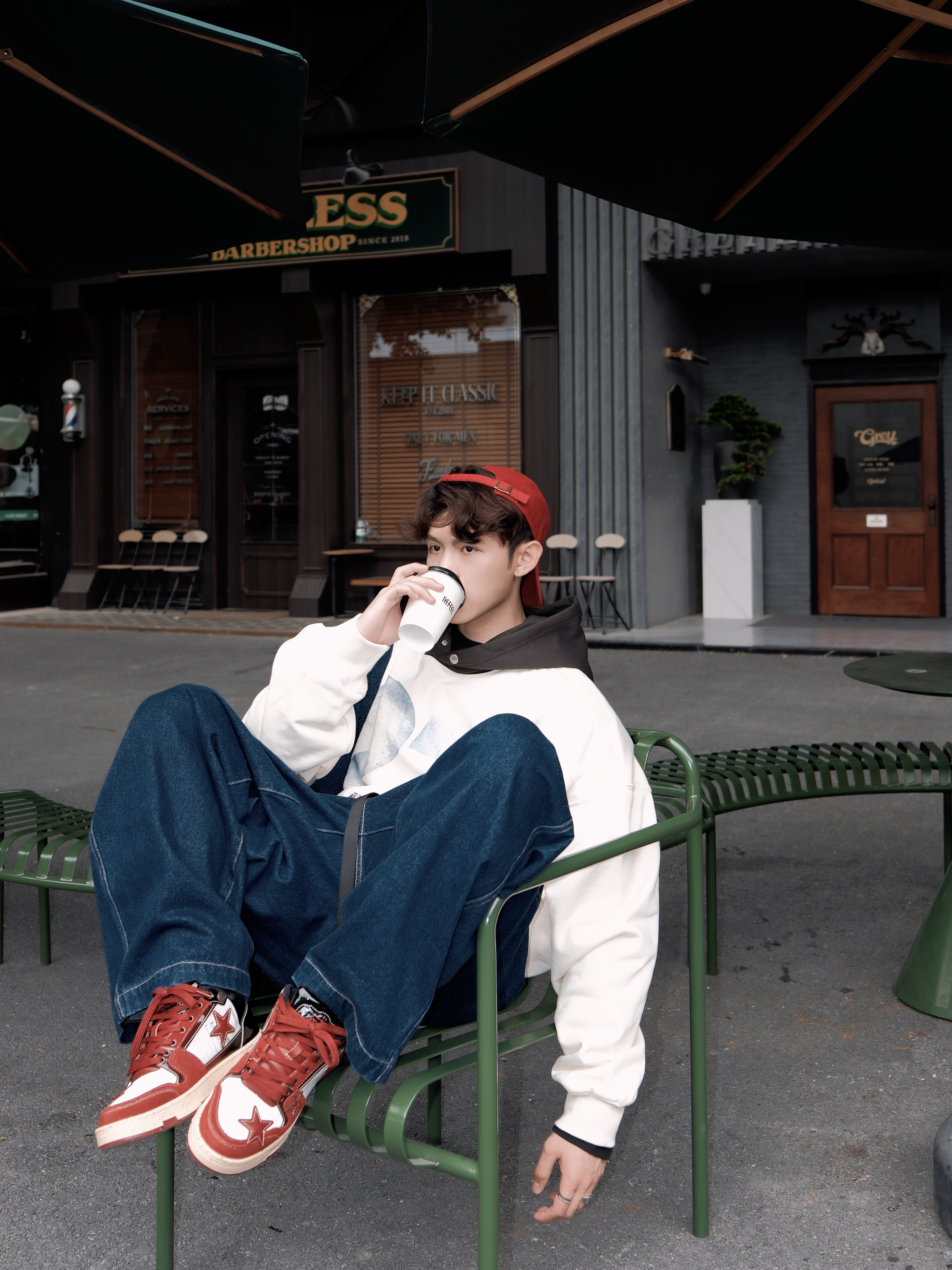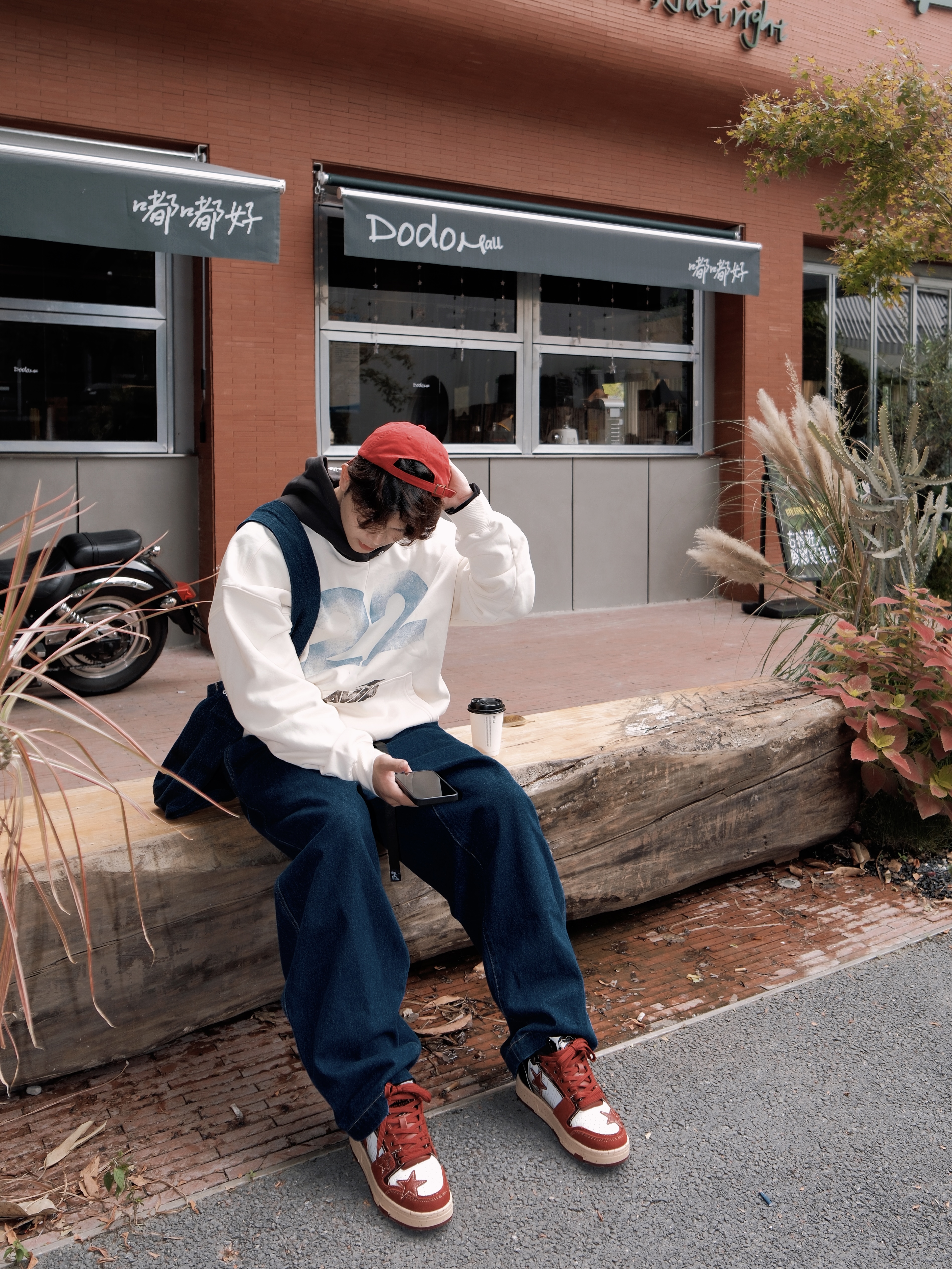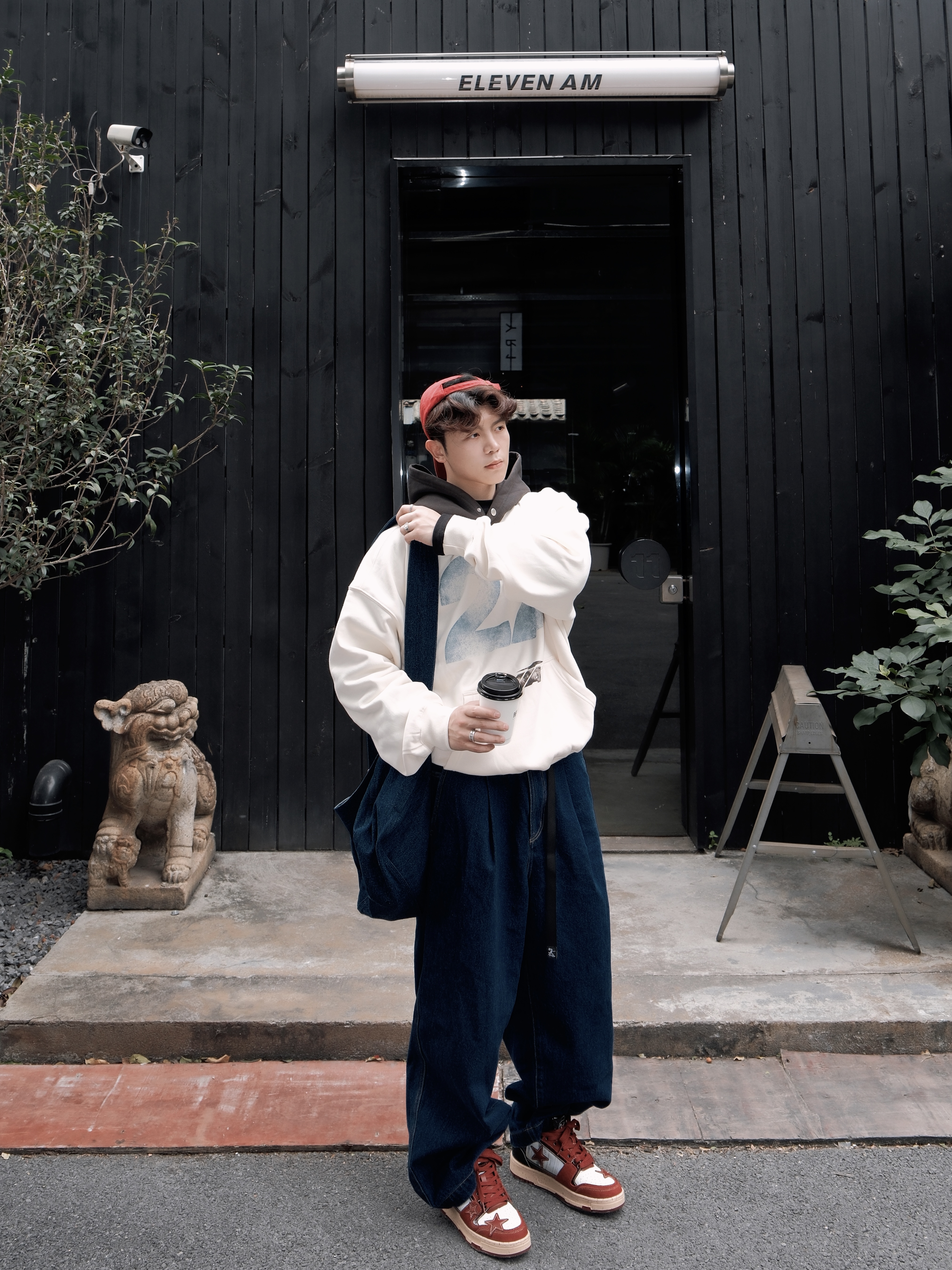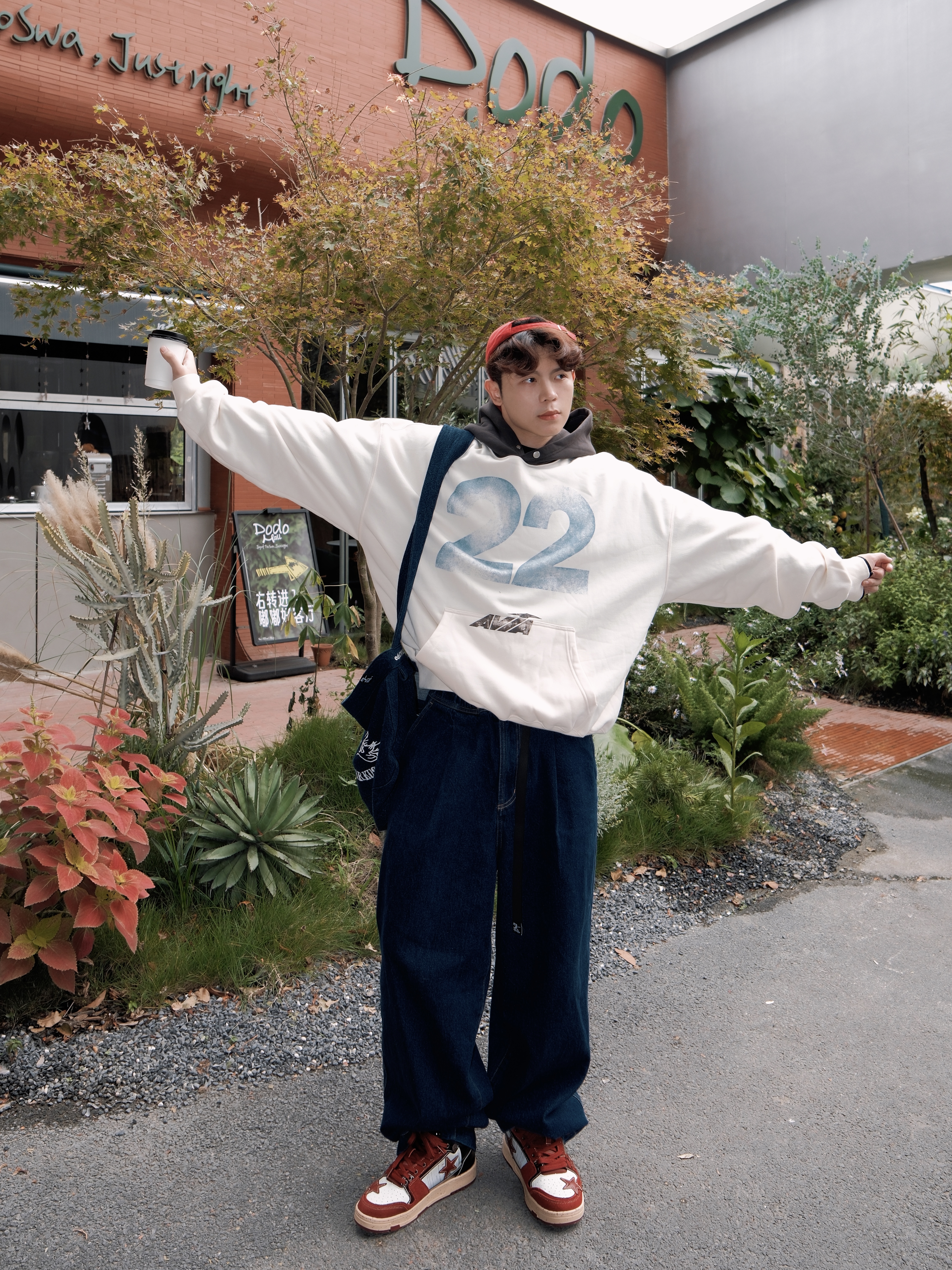 红蓝撞色不要吸睛啦👀 宽松美式连帽卫衣搭配蓝色阔腿裤 oversize穿起来就是舒适松弛呀🤩 选择 kaalixto 酒红色星星板鞋 质感高级➕舒适的高感 简直太爱好啦😝 利用帽子和鞋子作色彩呼应 整体帅得很轻松~