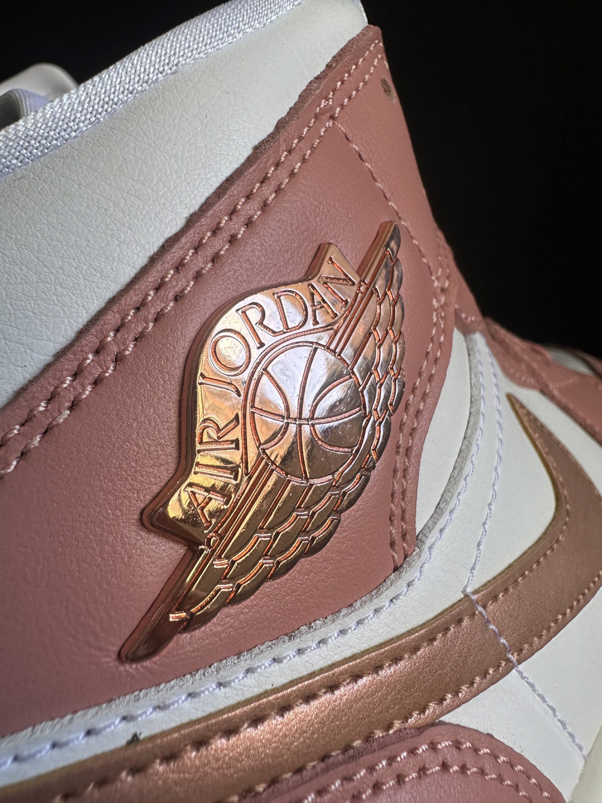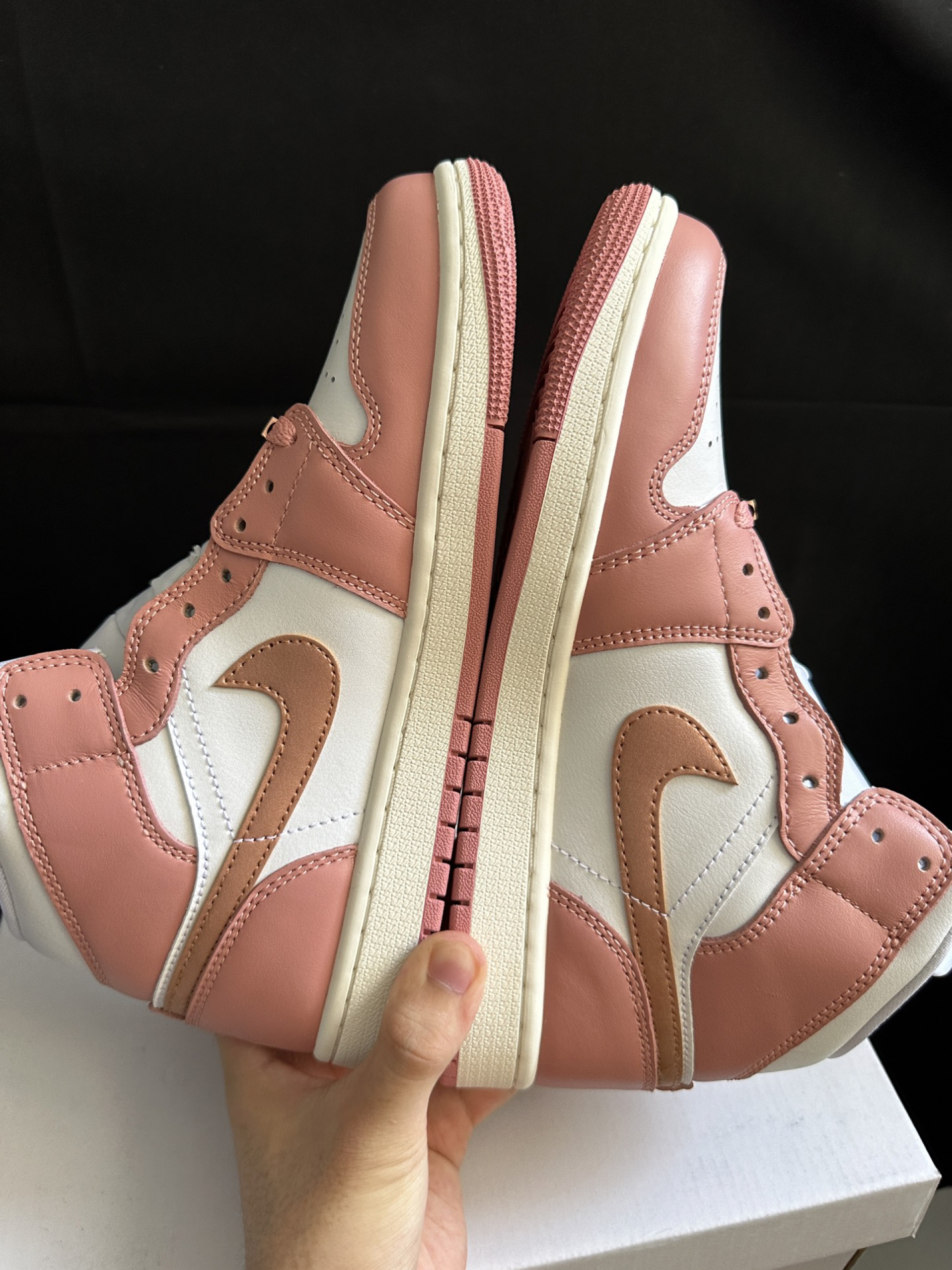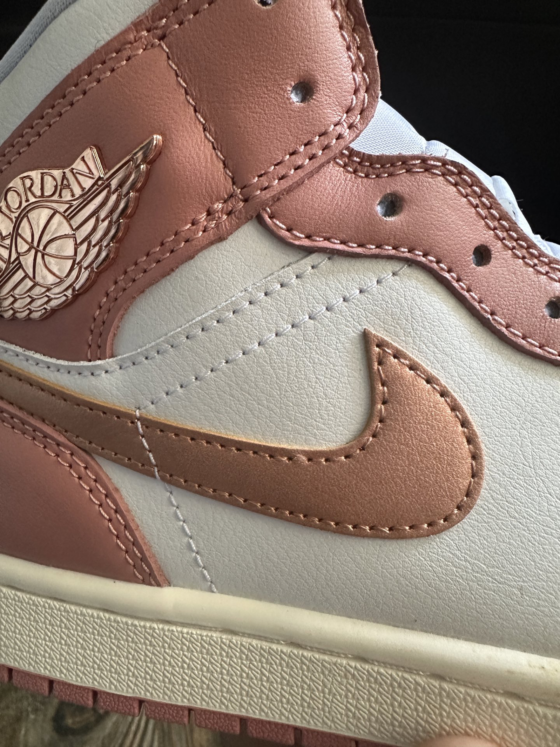 蹲了好久的AJ1 Mid玫瑰金粉终于到手了!拆开盒子第一眼就被颜值拿捏了,裸粉+米白的配色温柔到骨子里,鞋侧的玫瑰金勾子和鞋帮的金属飞翼标超有质感,细节拉满。皮质摸起来很细腻,上脚试了下,鞋型很贴合脚型,走路也不累,搭配浅色系的裤子或者裙子都超合适,今年的心头好球鞋就是它了~