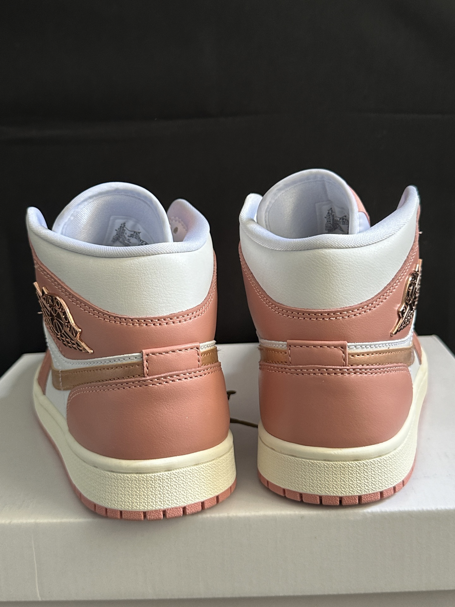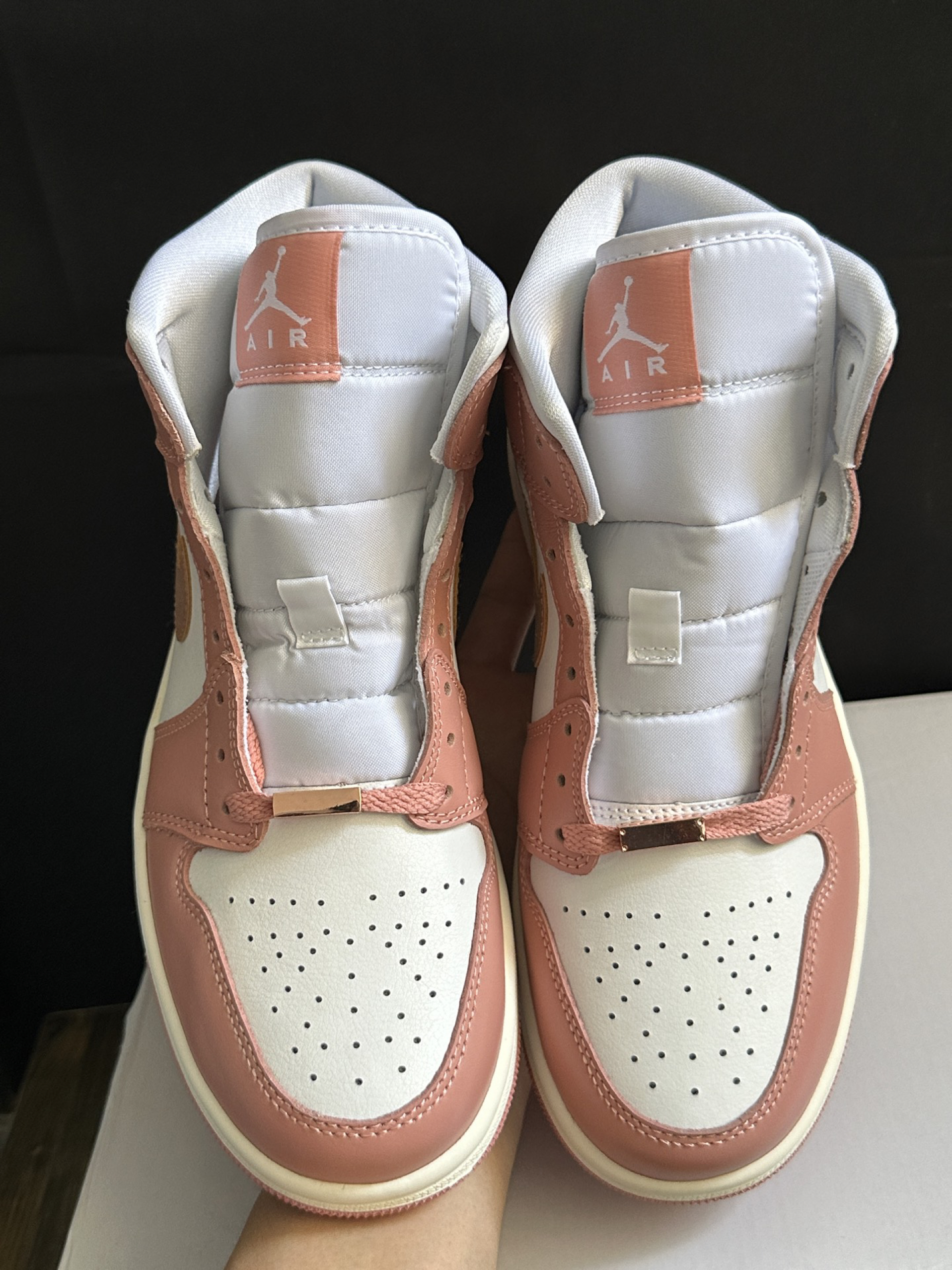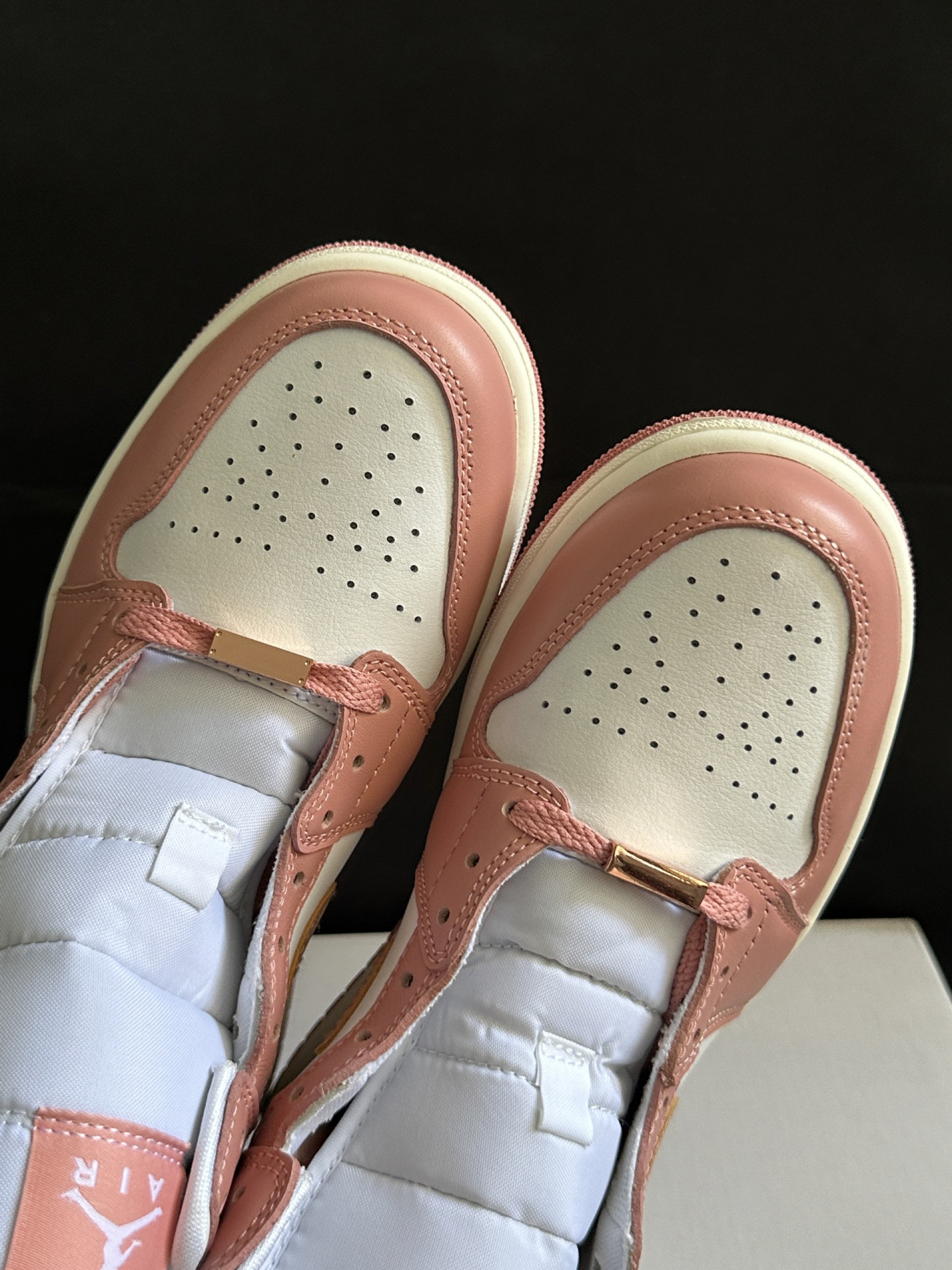 蹲了好久的AJ1 Mid玫瑰金粉终于到手了!拆开盒子第一眼就被颜值拿捏了,裸粉+米白的配色温柔到骨子里,鞋侧的玫瑰金勾子和鞋帮的金属飞翼标超有质感,细节拉满。皮质摸起来很细腻,上脚试了下,鞋型很贴合脚型,走路也不累,搭配浅色系的裤子或者裙子都超合适,今年的心头好球鞋就是它了~