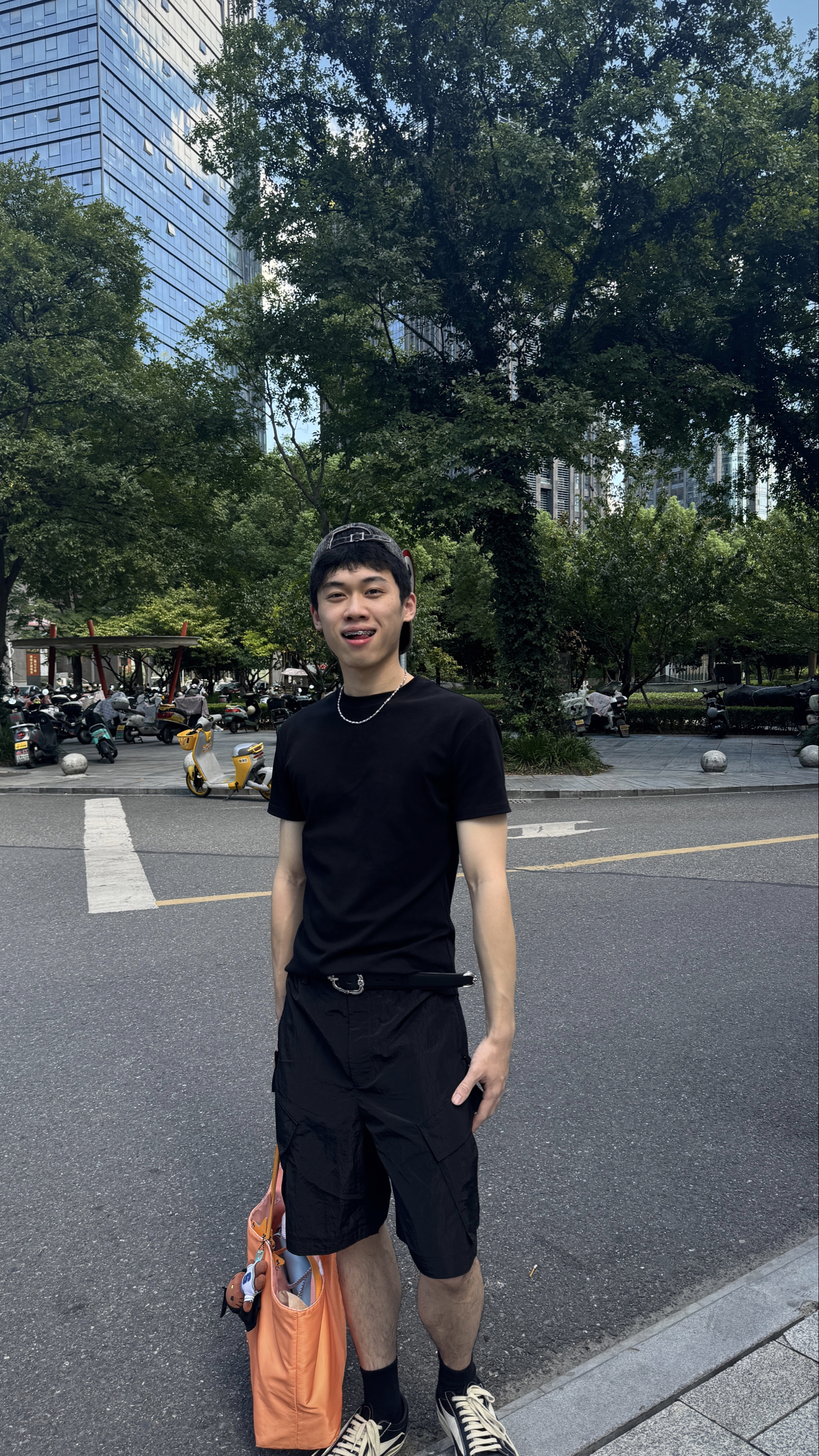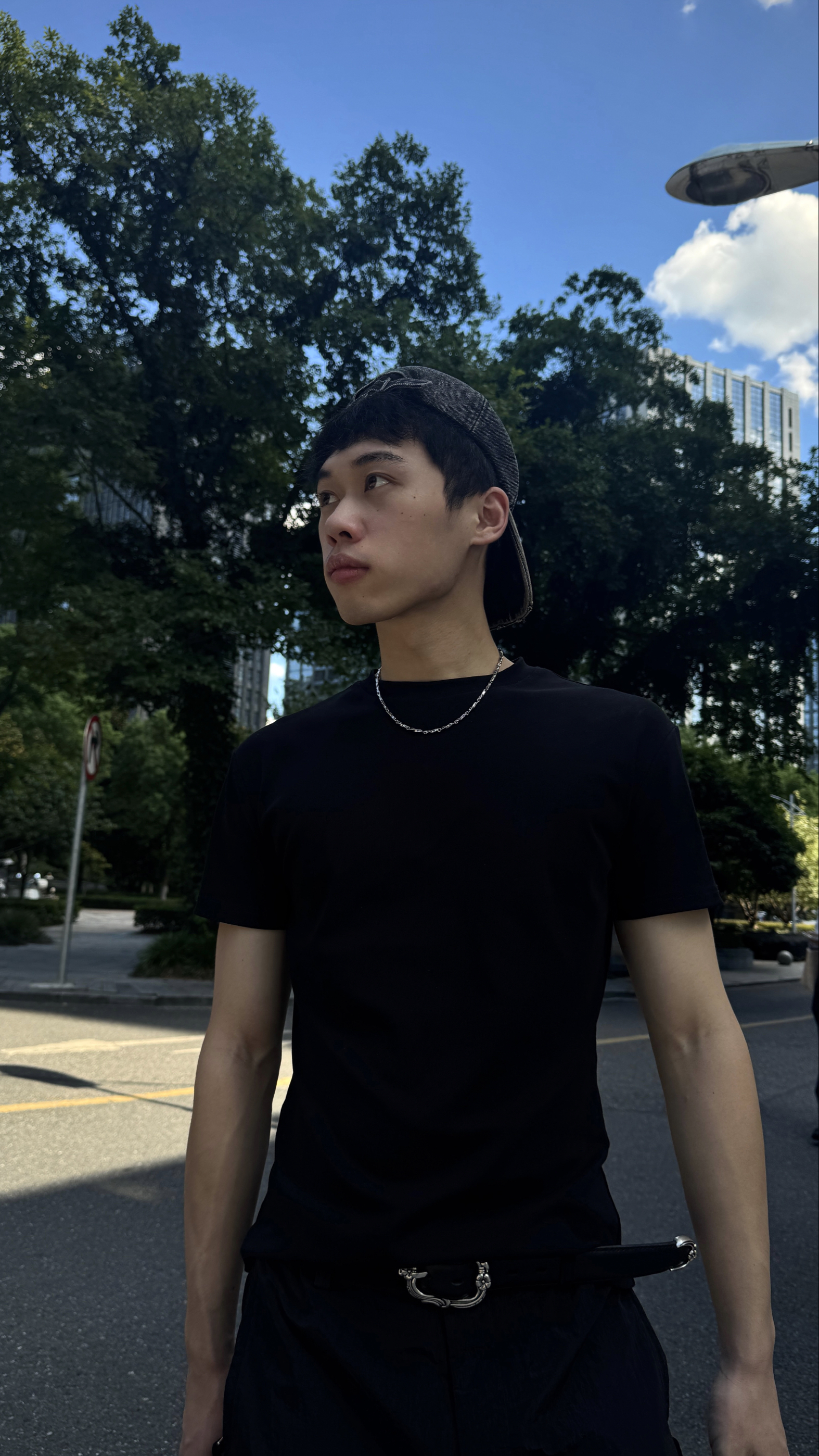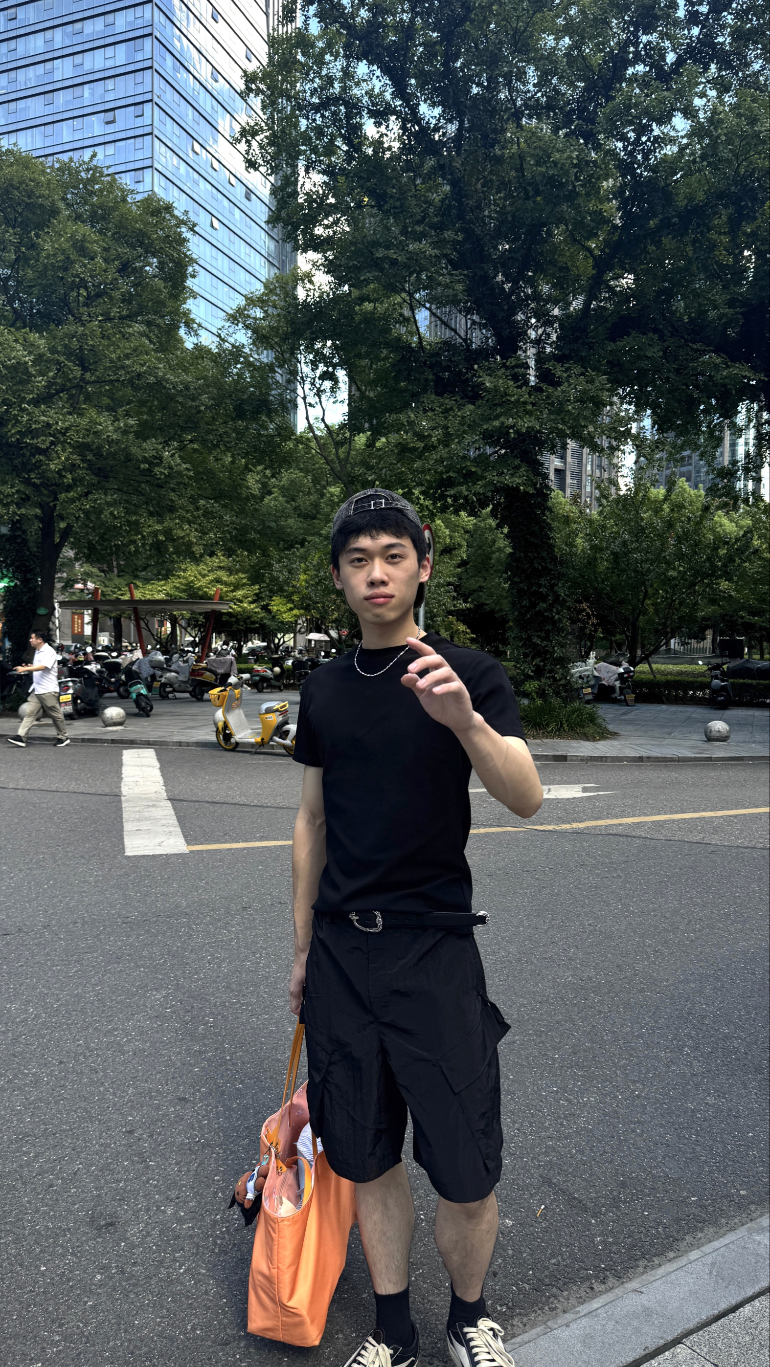 175cm|65kg的街头穿搭 不想费脑搭配就选全黑套装,基础款黑T搭工装短裤,金属项链和花卉皮带正好做个小点缀,简约穿搭也能穿出酷感,日常出门超合适~