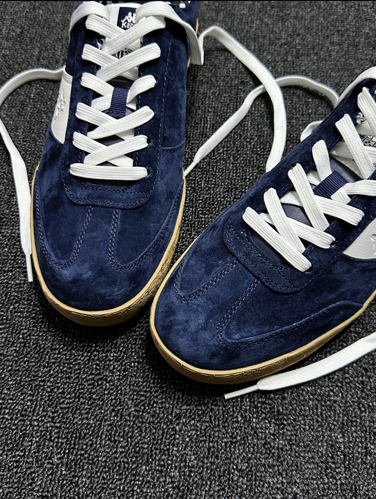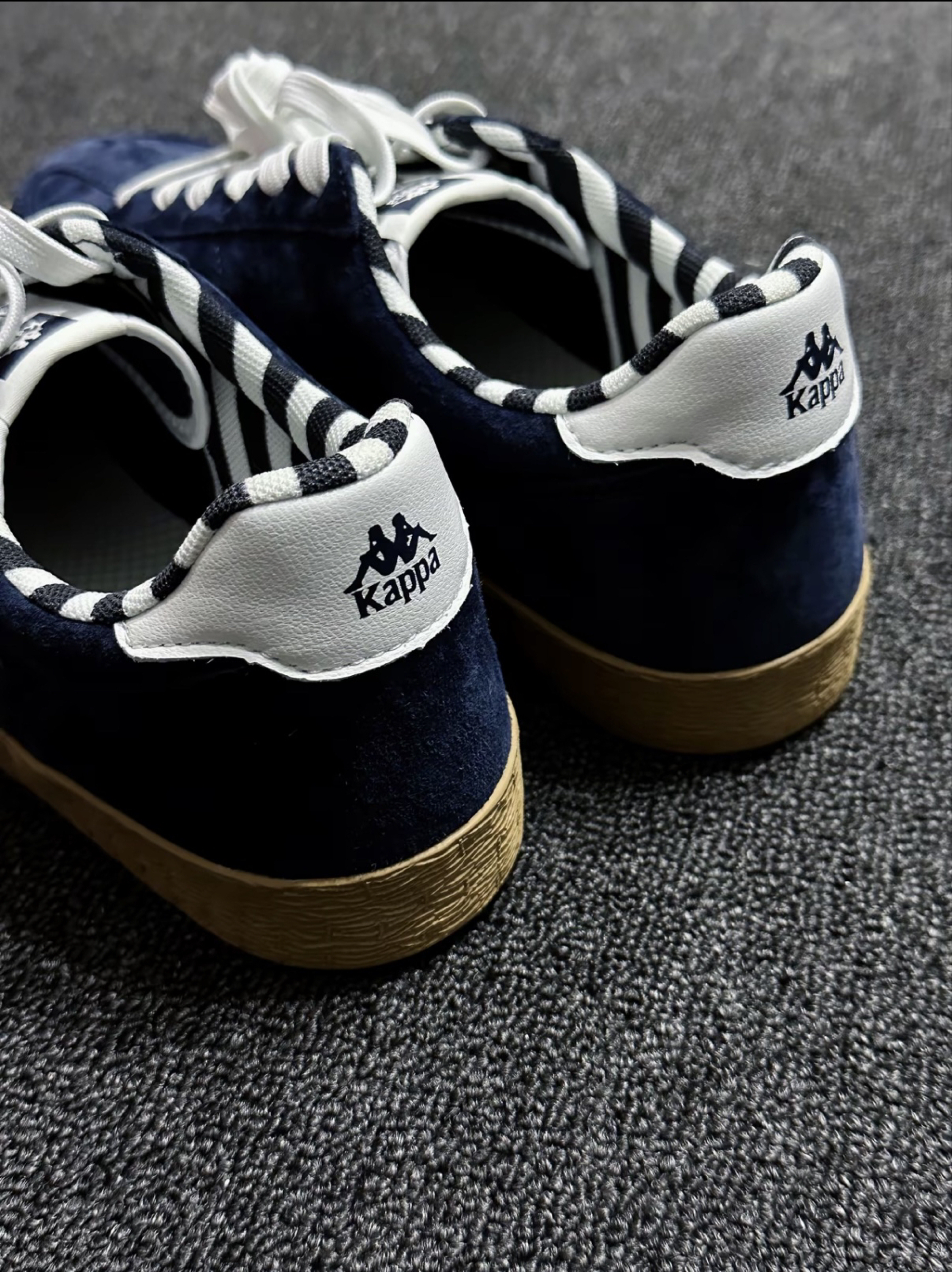家人们!今天挖到一双Kappa的复古德训鞋,给你们分享一下!! Kappa 这双鞋的藏蓝色翻毛皮材质太有质感了,摸起来细腻高级,秋冬氛围感直接拉满!鞋侧白色饰条上有立体Kappa串标,辨识度绝绝子;鞋口的黑白条纹内衬复古感爆棚,后跟白色皮标上的Kappa Logo醒目又精致;生胶色鞋底+鞋侧“ITALIA”金色小字,细节控表示爱了爱了~ 👟上脚体验:鞋底不算软弹型,但日常走路...