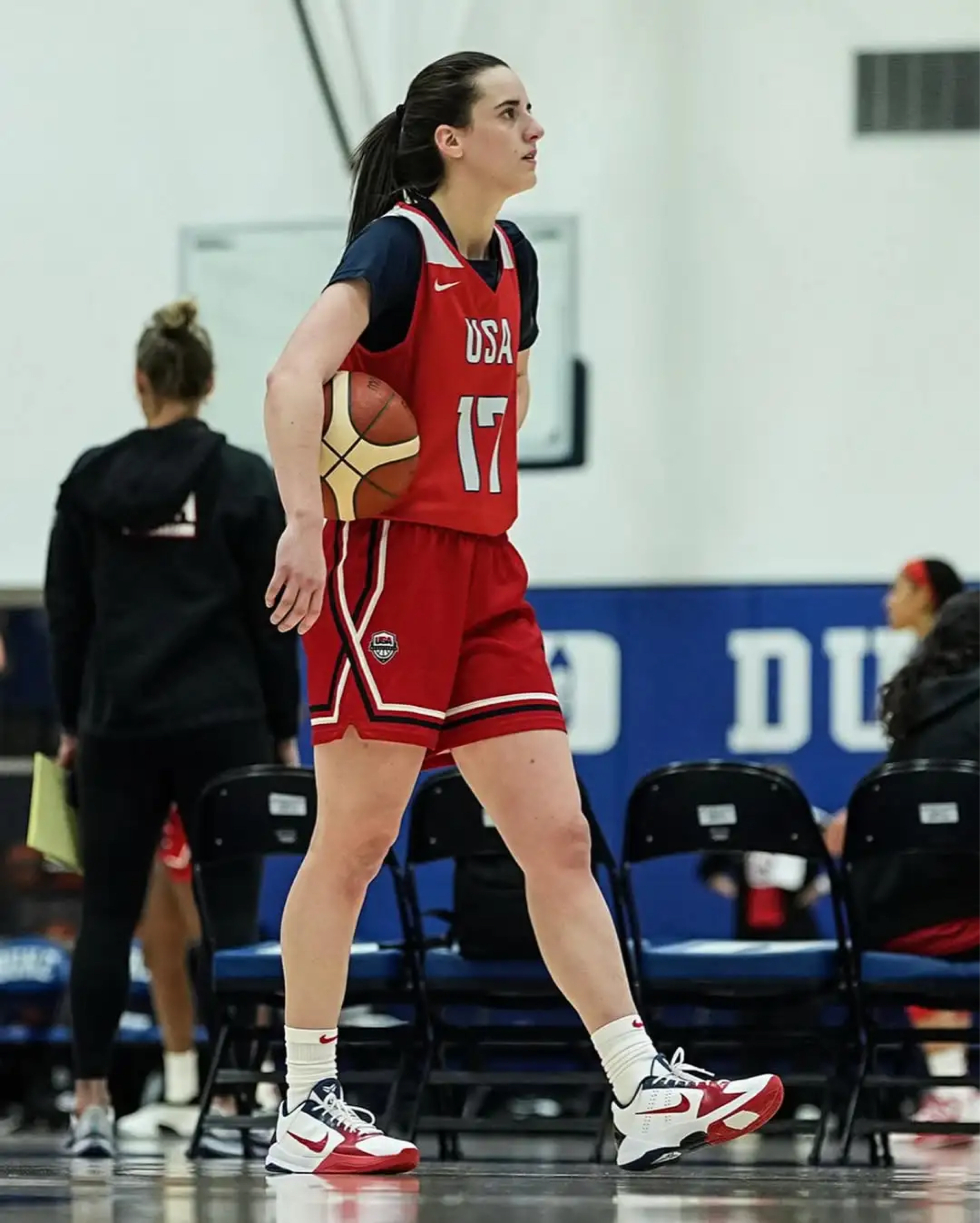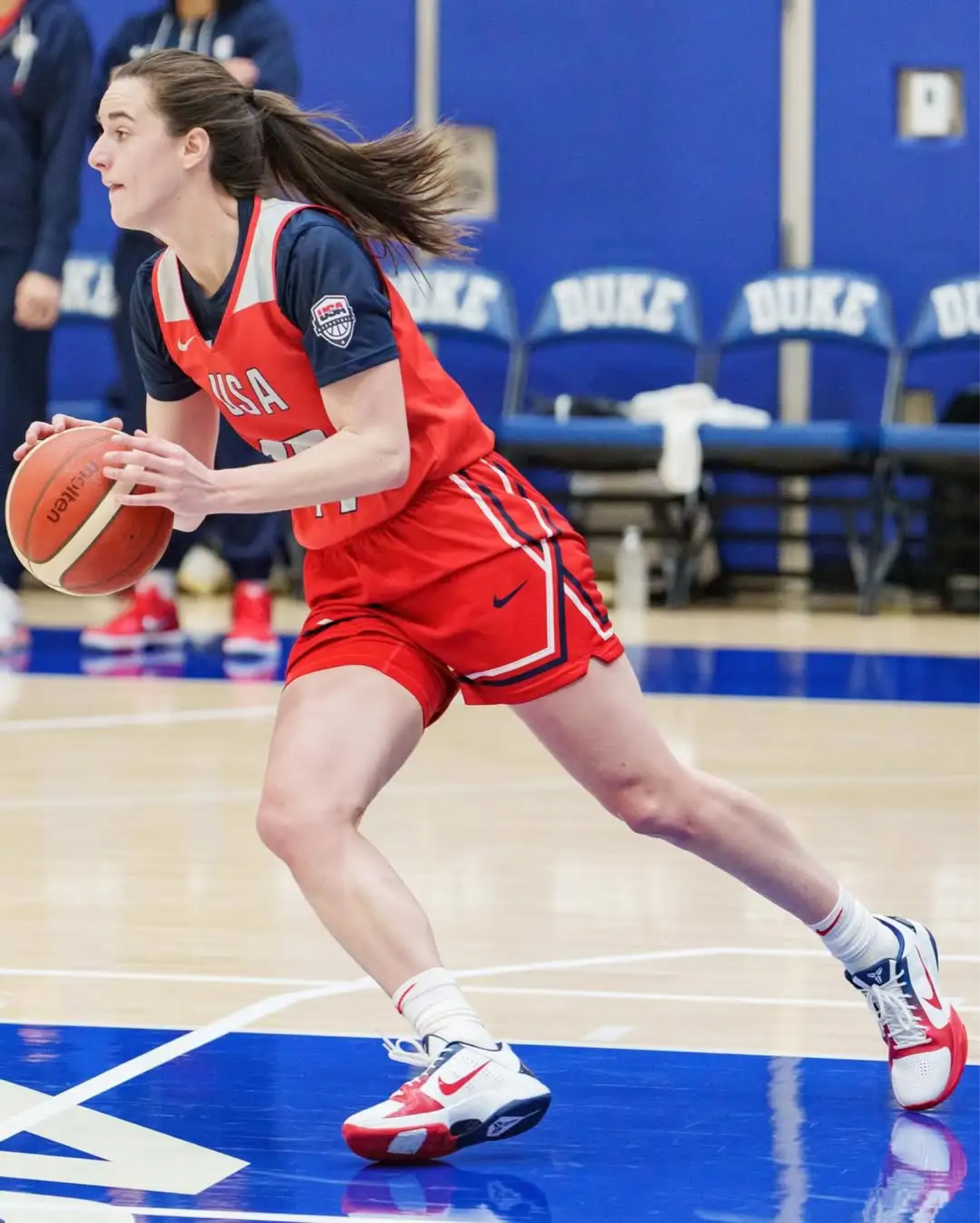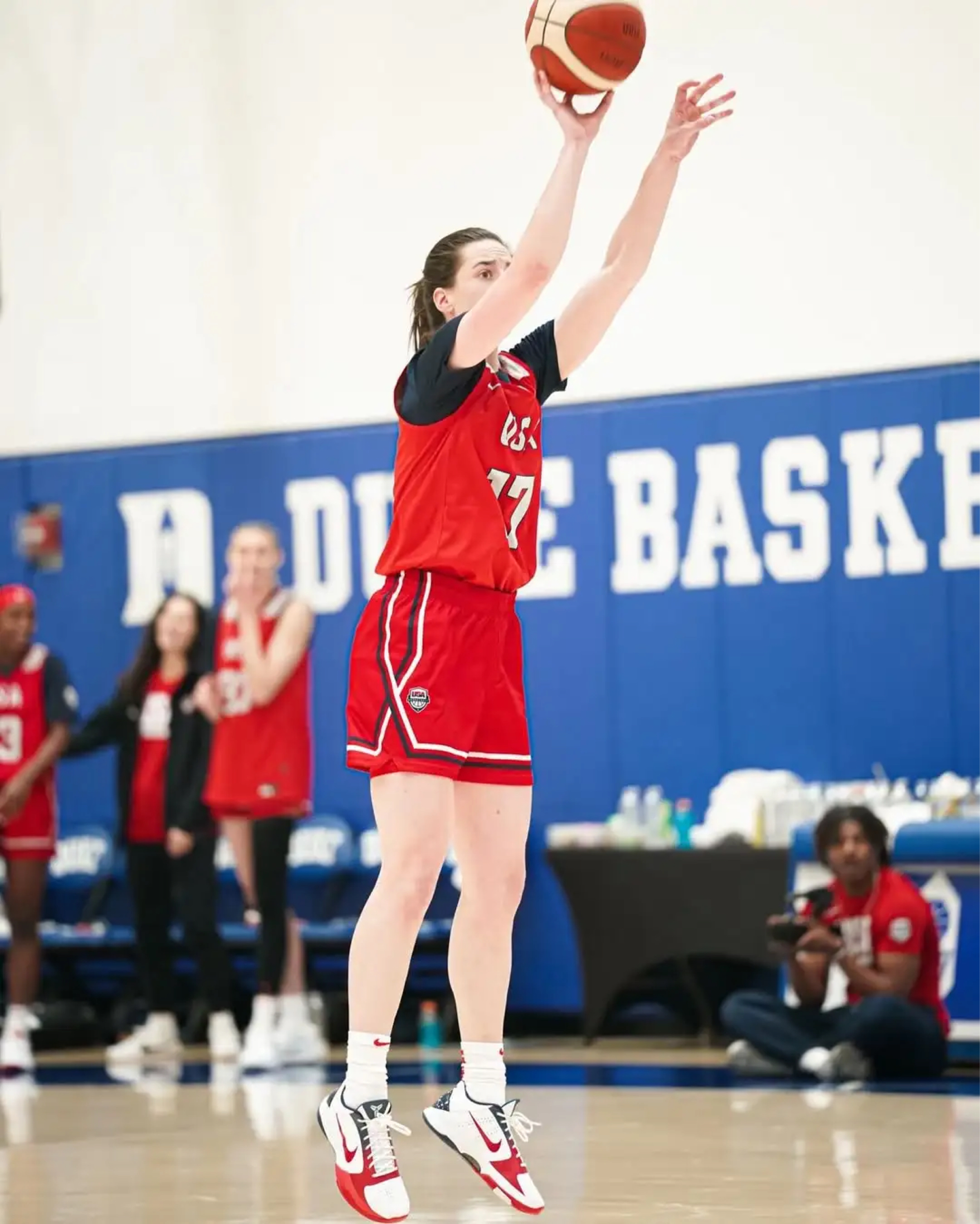 美国女篮为期三天的训练营在北卡罗莱纳州达勒姆正式开启,赛场之外,新星凯特琳·克拉克的脚下战靴格外吸睛。此次训练中,她身着全新美国队配色的Nike Kobe 5 Protro“USA”PE亮相,经典鞋型融合国家队主题元素,尽显运动风采。这款专属PE版本战靴不仅承载着科比系列的传奇基因,更与美国女篮的队服风格相得益彰,成为训练营现场一道亮眼的风景线,也让不少球迷对这双战靴的后续发售充满期待。