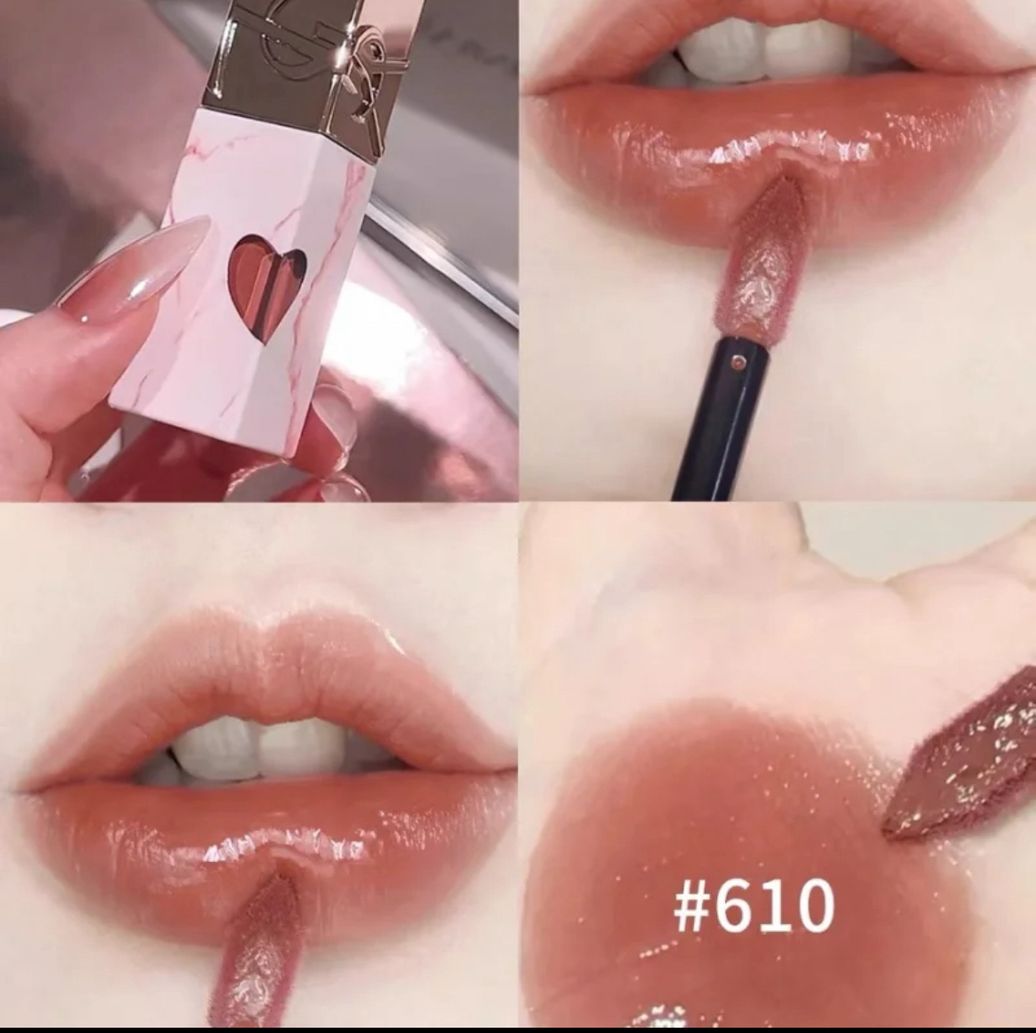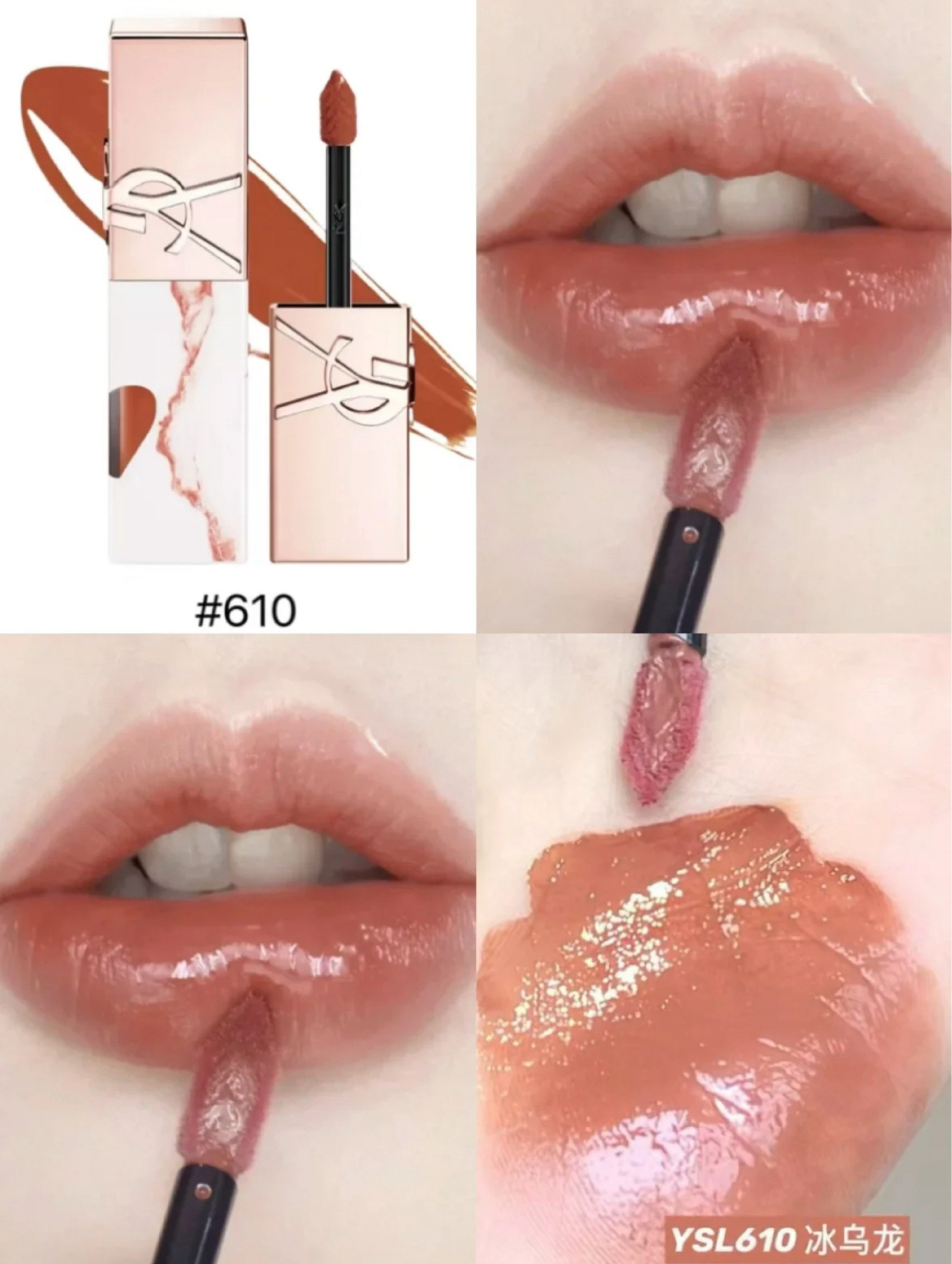 YSL这支爱心大理石限定唇釉真的把氛围感焊在嘴上了!大理石纹管身+爱心镂空设计颜值拉满,质地和色号更是踩在审美点上,今天实测442烈酒浅棕和610冰乌龙两个色号,黄皮姐妹直接抄作业~ 🌟 质地体验 镜面玻璃唇质感绝了!上嘴是水嘟嘟的水润感,成膜速度快,成膜后镜面感超亮,不会黏嘴也不沾杯,抿嘴也不会破坏镜面效果。持久度在线,喝水轻微沾杯,吃饭后留色均匀,唇部状态差的时候涂也不会卡纹,干唇友好度拉...