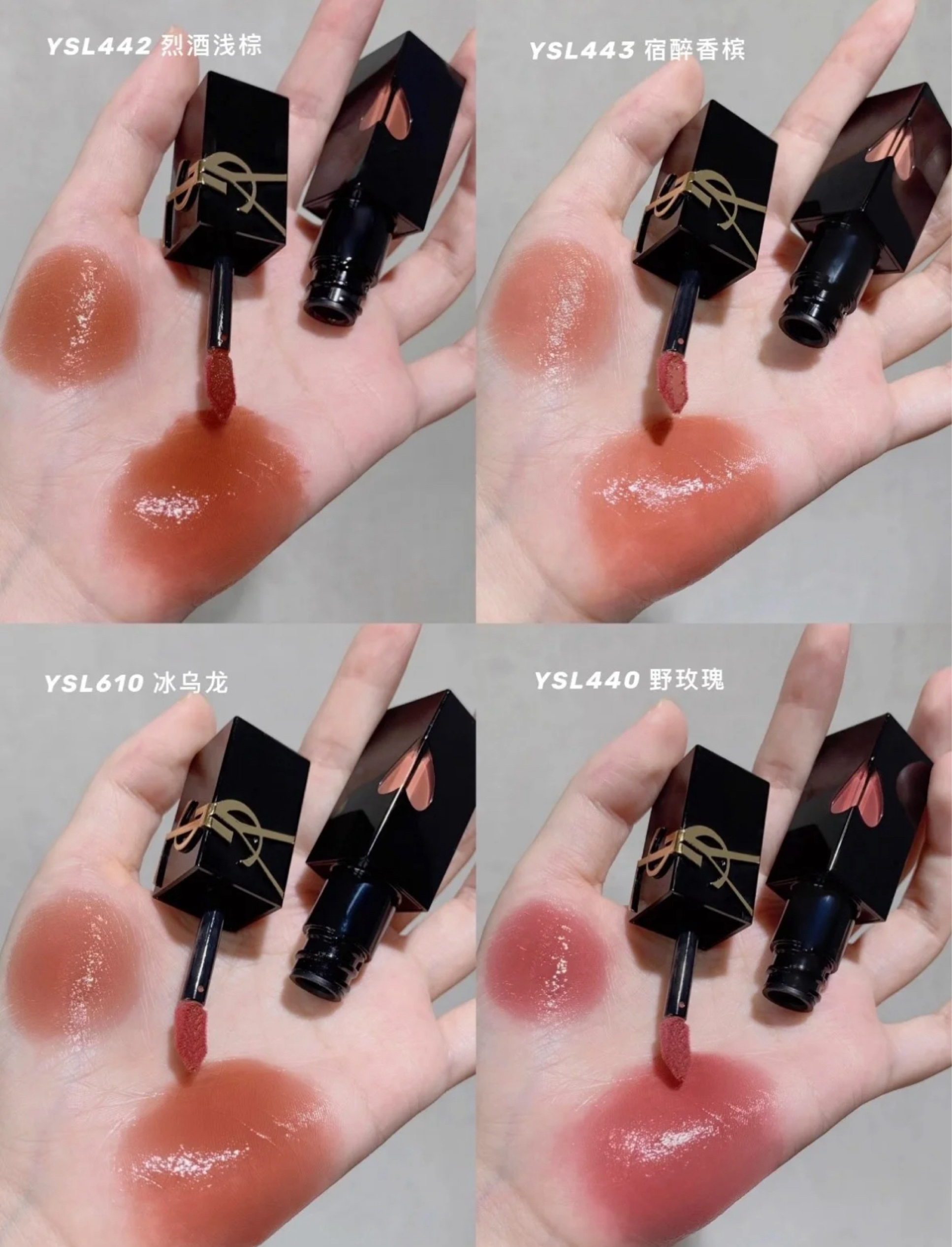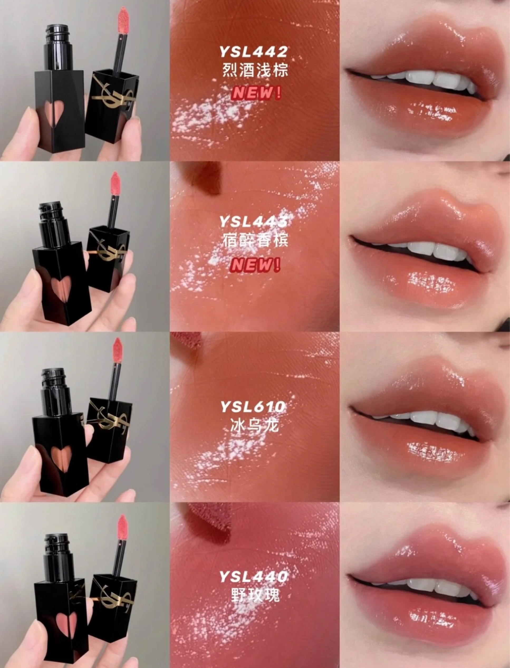 YSL爱心黑管唇釉直接把镜面唇的美感拉到新高度!黑金管身搭配爱心镂空设计,颜值戳中少女心,质地和色号更是精准踩中审美,这次把热门色号442、443、610、440全测了,黄皮姐妹按这篇选不踩雷~