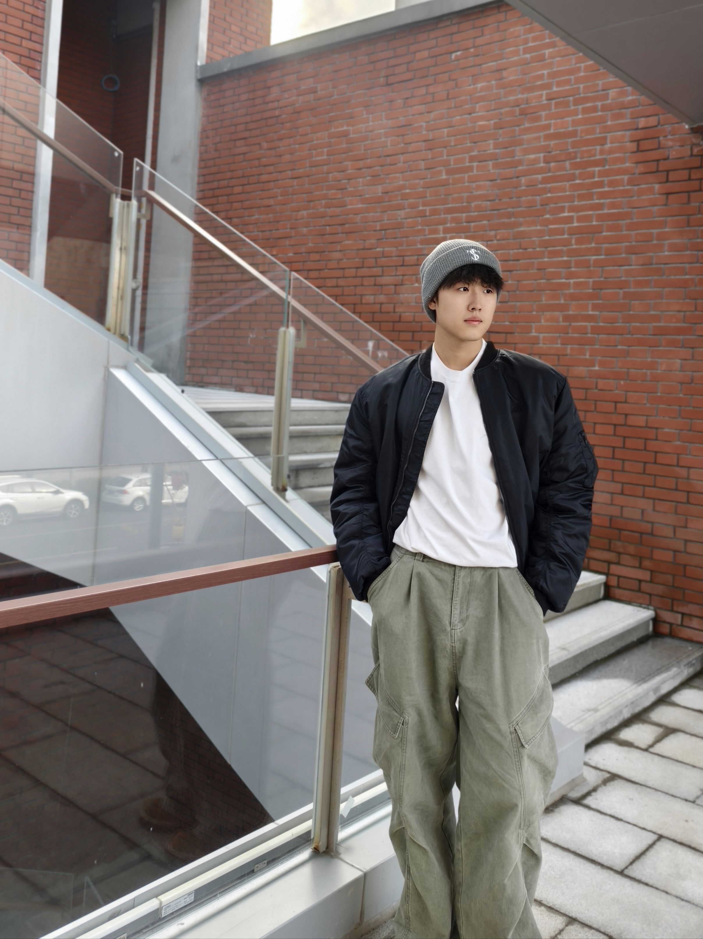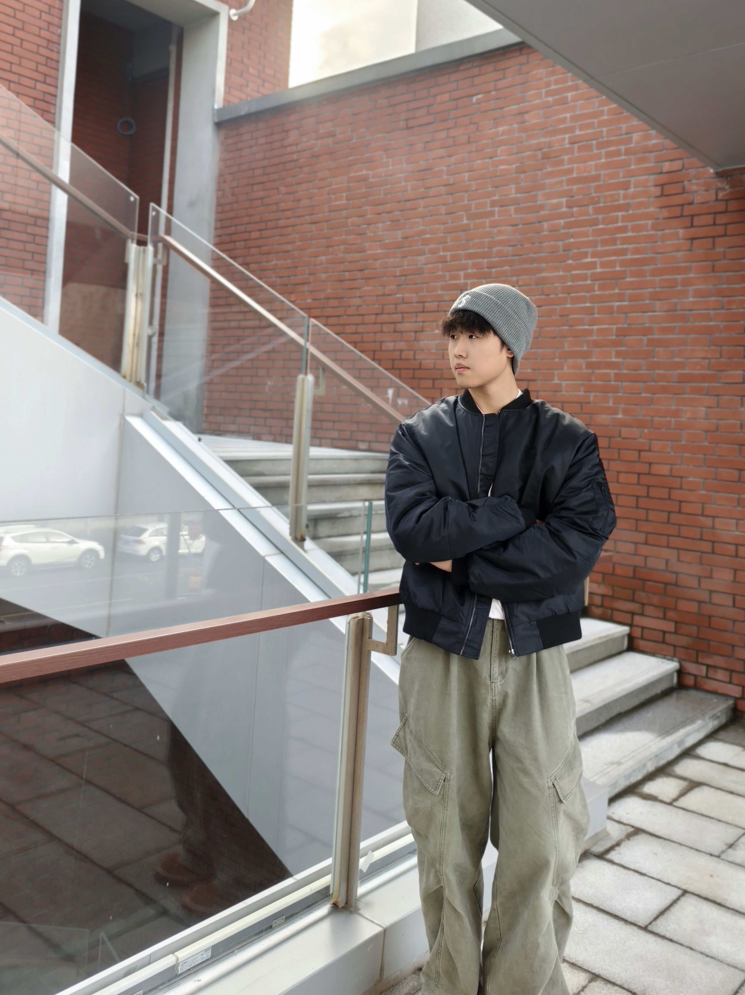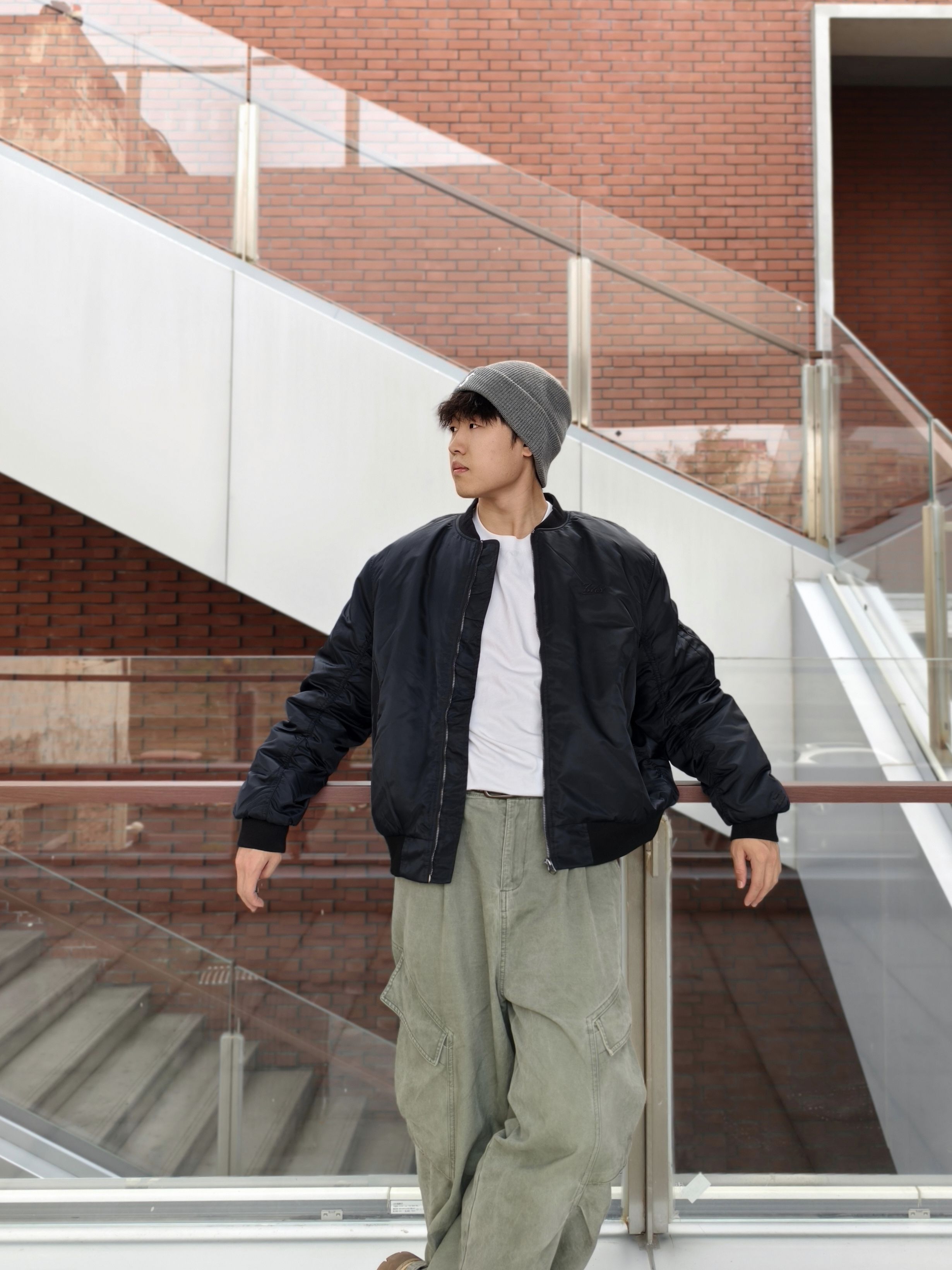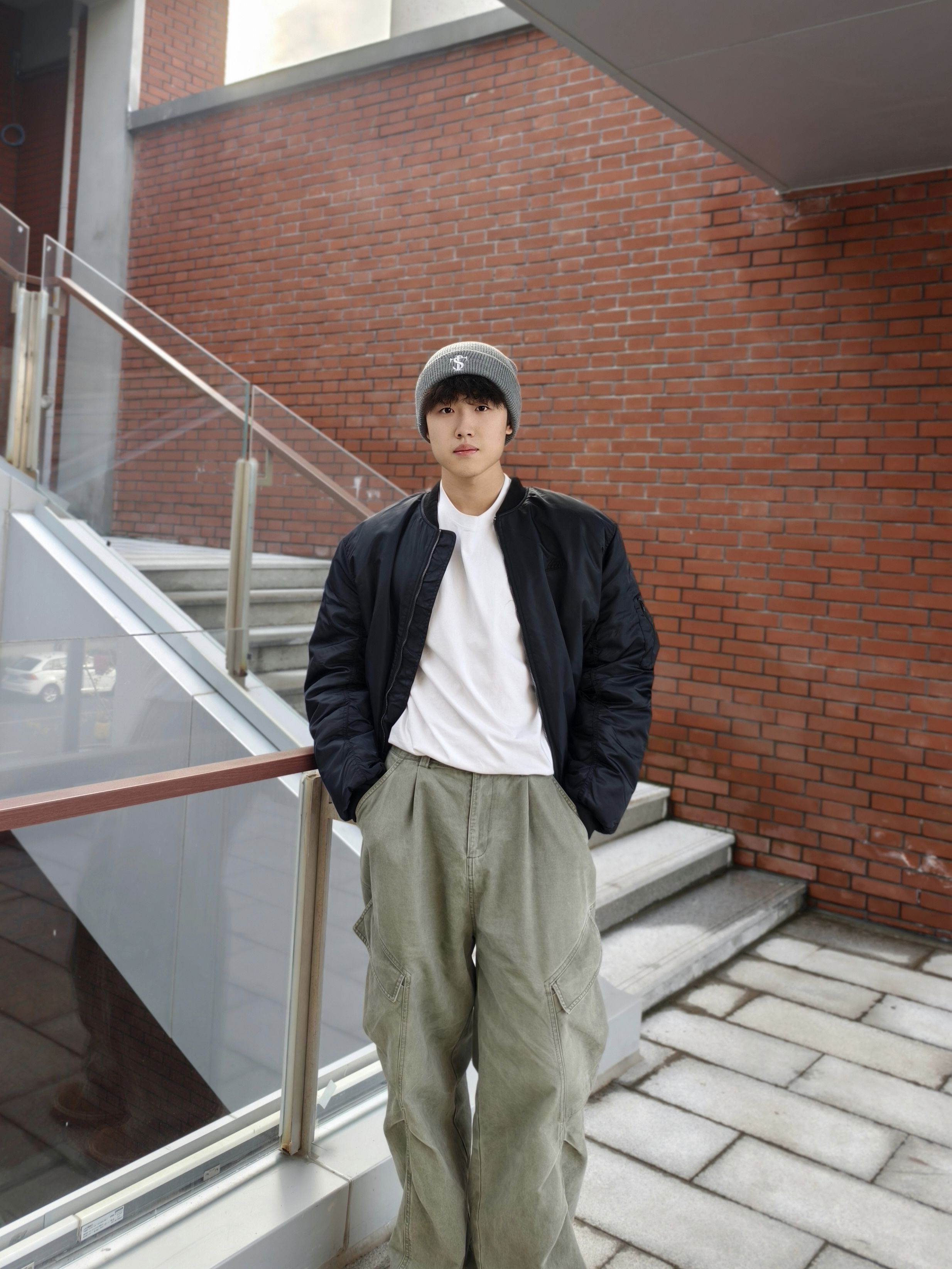 黑色MA-1棒球夹克也太顶了!利落的飞行员版型自带酷感,内搭白T+军绿色工装裤,再配个冷帽,街头痞帅感直接拉满,随便往楼梯扶手一靠,氛围感大片就有了~
