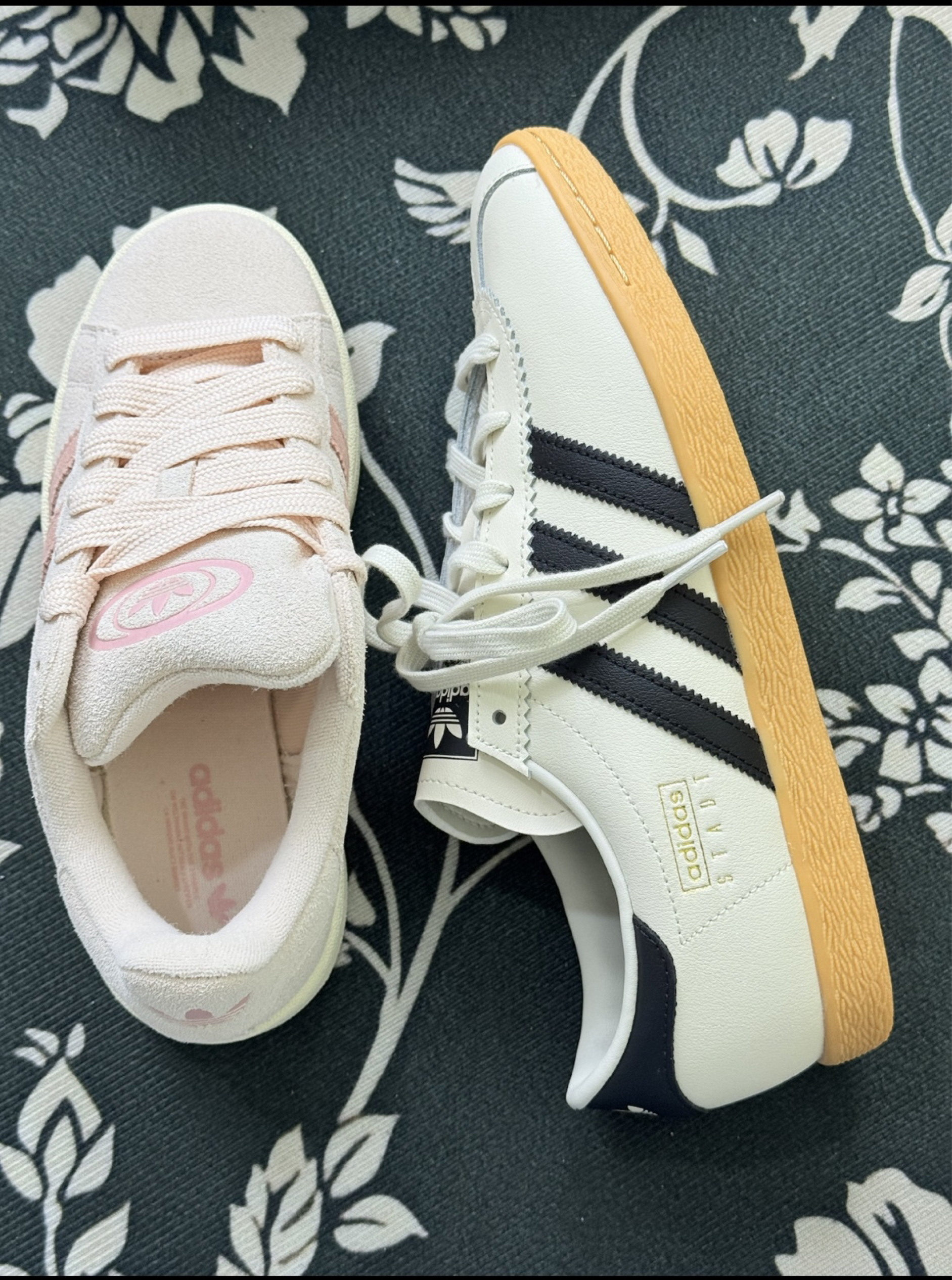 这双鞋子我穿的一段时间优缺点都很明显 左侧鞋子 浅粉色麂皮材质,鞋舌处有粉色三叶草标志,风格清新。麂皮材质手感柔软,但存在不耐脏、需精心打理的特点,雨天穿着受限,长时间行走后跟支撑感稍显不足,适合日常轻量休闲搭配。 右侧鞋子 米白色皮革搭配黑色装饰,生胶外底,复古风格显著。皮革材质易清洁,不过鞋头偏窄,脚宽者初期穿着会有挤脚感,需磨合适应。透气性一般,夏季长时间穿着脚部易闷,是复古潮...