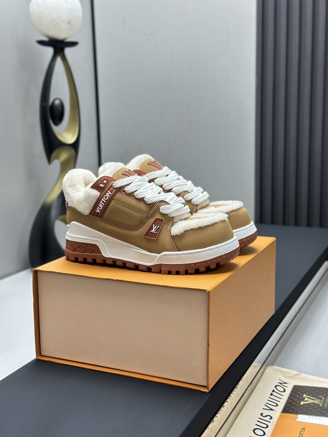 这双路易威登(Louis Vuitton)的毛绒板鞋保暖又时尚,以下是一些冬季穿搭建议: 男士穿搭 • 休闲通勤风:上身选择深灰色羊毛毛衣,外搭黑色中长款呢子大衣,增加层次感和保暖性。下身搭配深蓝色直筒牛仔裤,整体简约大方 ,适合上班或日常外出。 • 街头潮流风:上身穿着宽松的黑色连帽卫衣,卫衣上可以有个性的印花,外搭一件军绿色的工装棉服。下身搭配黑色束脚工装裤,再配上同色系的毛线帽和围巾,...