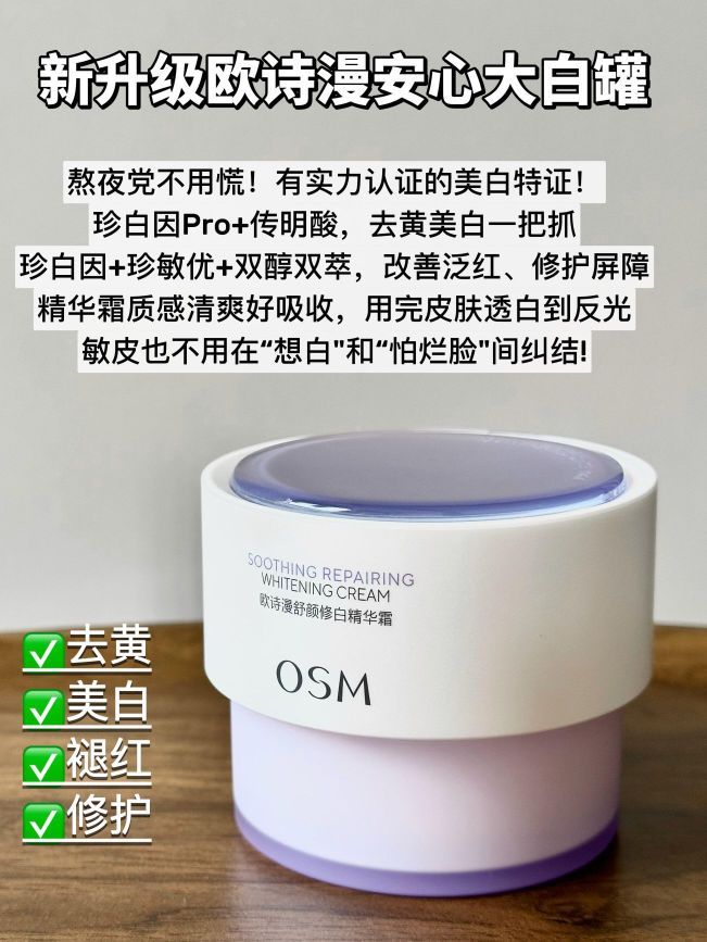 日常护肤中最重要的步骤就是面霜了 一年四季都在用的东西可得选择适合自己的! 说真的市面上的面霜那么多种 每次选择是不是都会挑花眼! 我盘点出了4款不同功效的好用面霜 适合不同肤质和不同皮肤问题的姐妹 大家可以来抄作业!按需选择! - 👉🏻 新升级欧诗漫安心大白罐 这一罐真的好用不踩雷!夜猫子狂用已空瓶 熬夜后的黄气暗沉反黑啥的都能一举拿下 有正经美白特证还经得住敏肌测试 珍白因Pro+传明酸能拦黑...