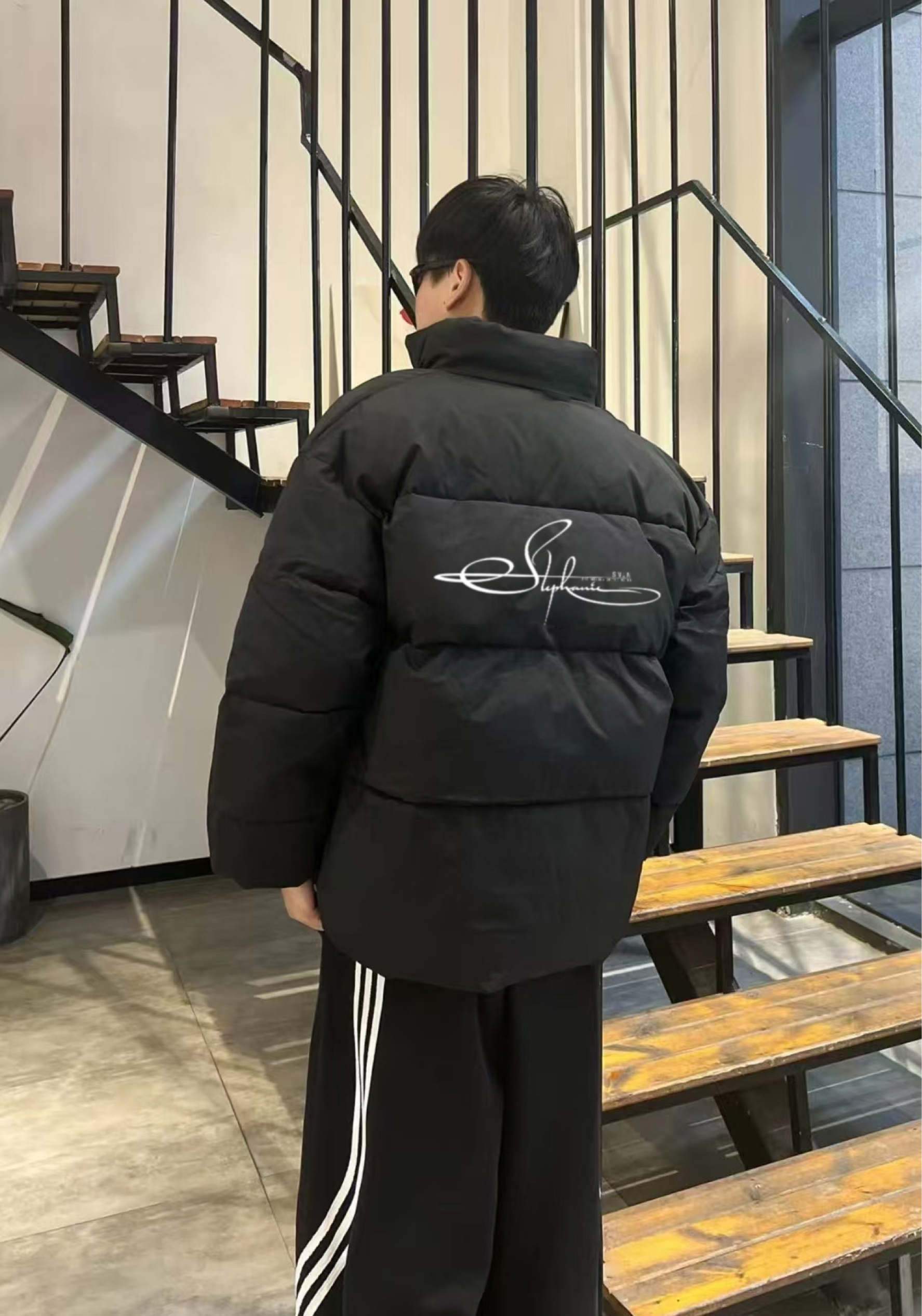 面包服版型蓬松不臃肿,后背的签名印花是点睛之笔!搭三条杠阔腿裤 + 白鞋,慵懒又潮,保暖还能拿捏氛围感。