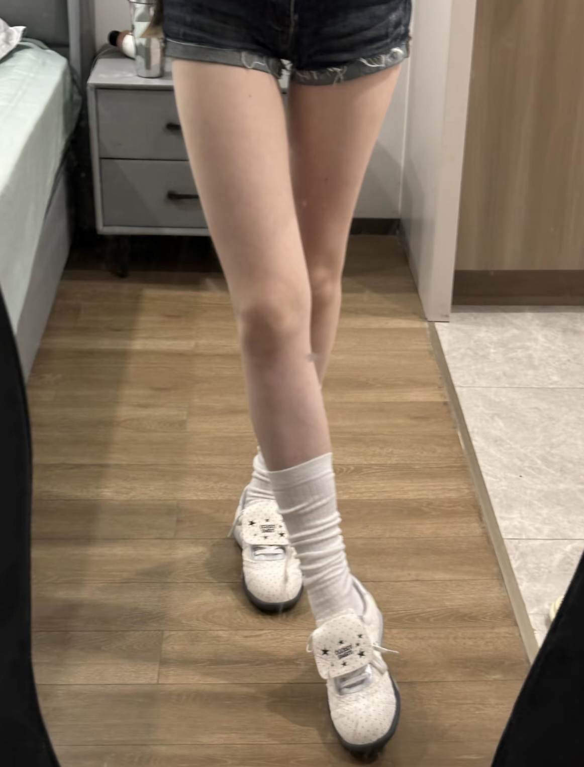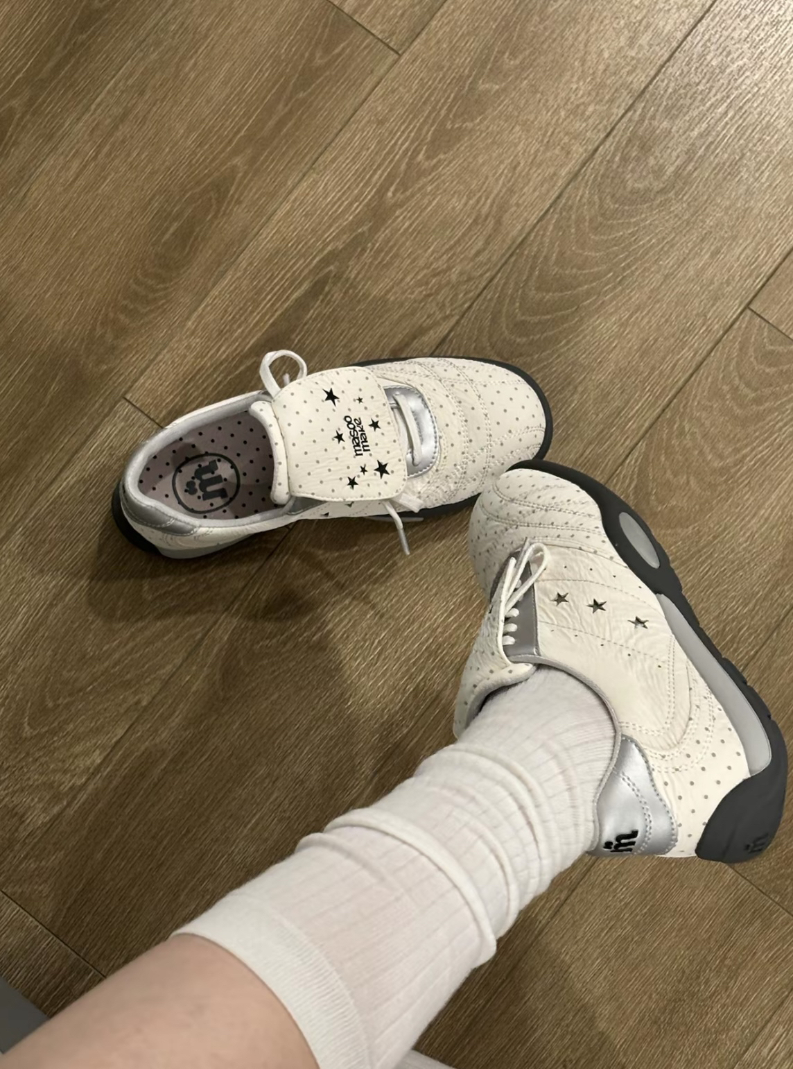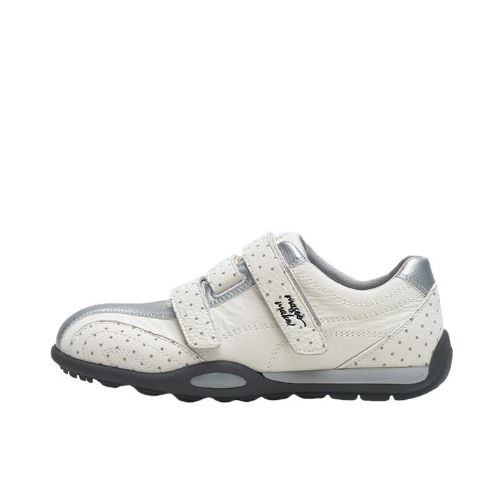 谁懂这双波点鞋呀🥺‼️‼️ 银白配色真的韩里韩气可好看噜 魔术贴设计穿脱非常的方便 上脚的脚感也蛮不戳的带有一点内增高 日常可以搭很多种风格的衣服 我比较喜欢配 搭配短裤短裙拉长比例~
