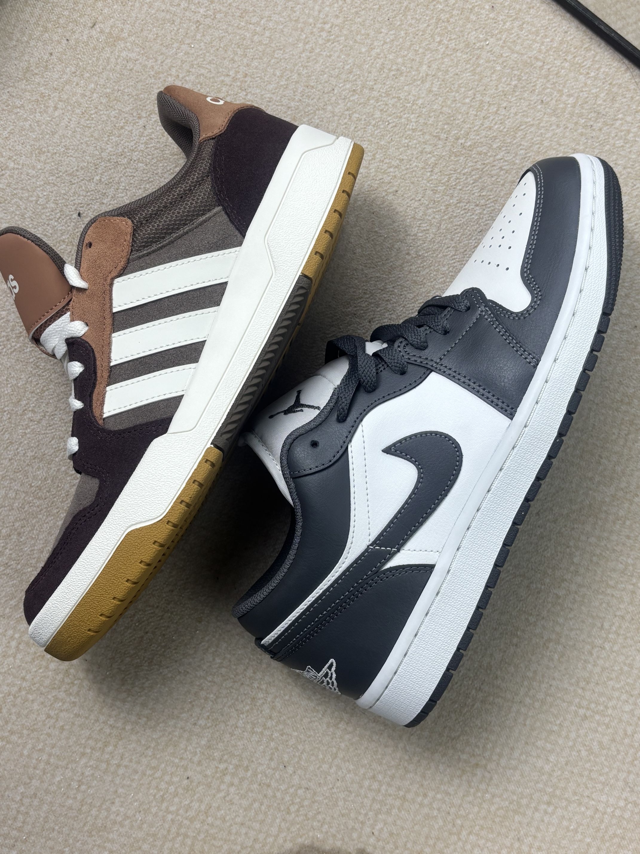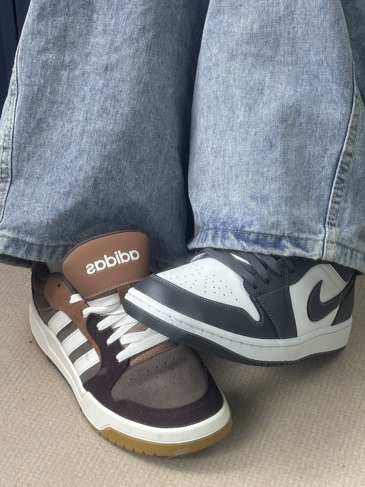 入了这双阿迪和Nike的拼色翻毛鞋,纯粹是被黄棕撞色的视觉感戳中了🤎。左边阿迪的翻毛质感偏细腻,右边Nike的麂皮更厚实些,搭牛仔裤能穿出不一样的层次感,日常摆拍或者出街都挺有味道。 但实际穿下来槽点也不少😮💨。两款都是翻毛面,出门沾点灰就特别显眼,用清洁湿巾擦还会留下印子,打理起来得格外小心。阿迪的鞋舌偏薄,走路时脚踝骨位置会磨皮肤;Nike的鞋头偏窄,前掌挤脚,得选大半码才合适。