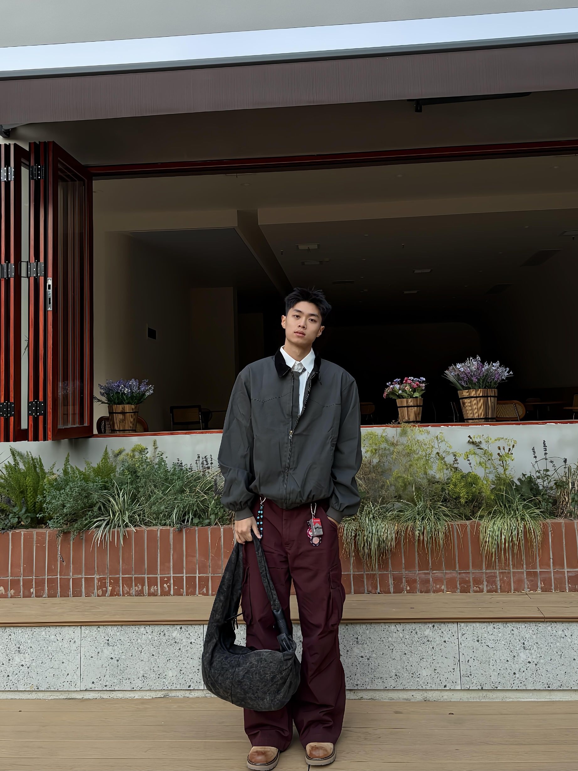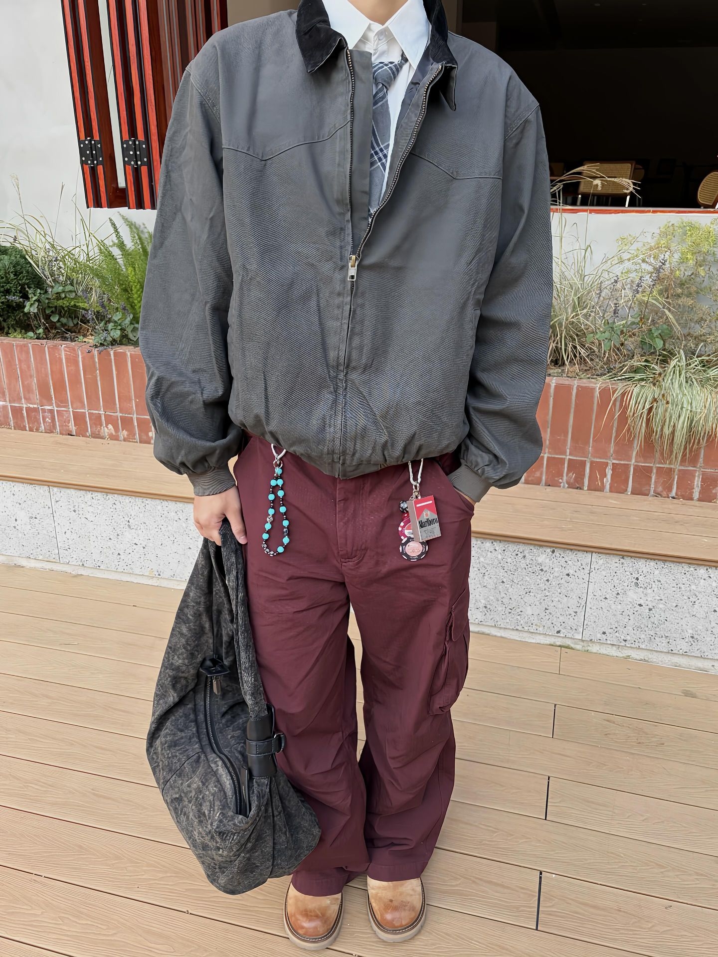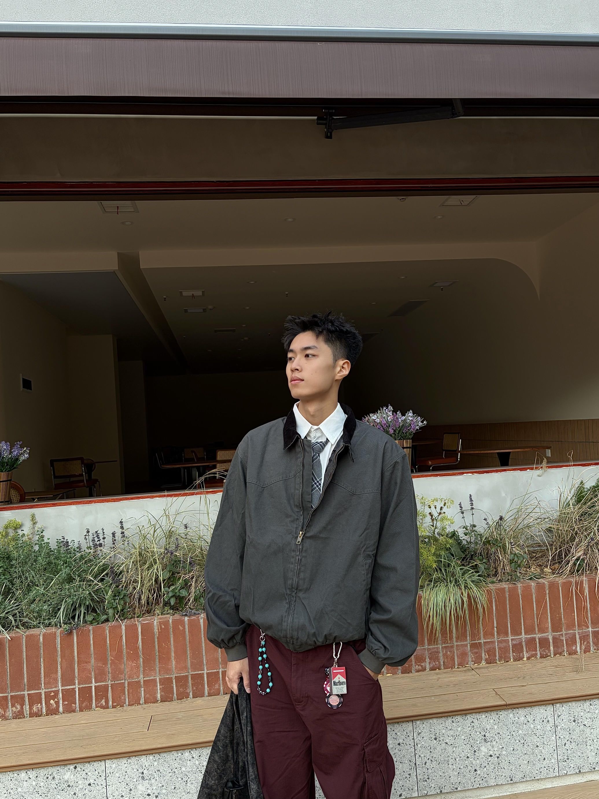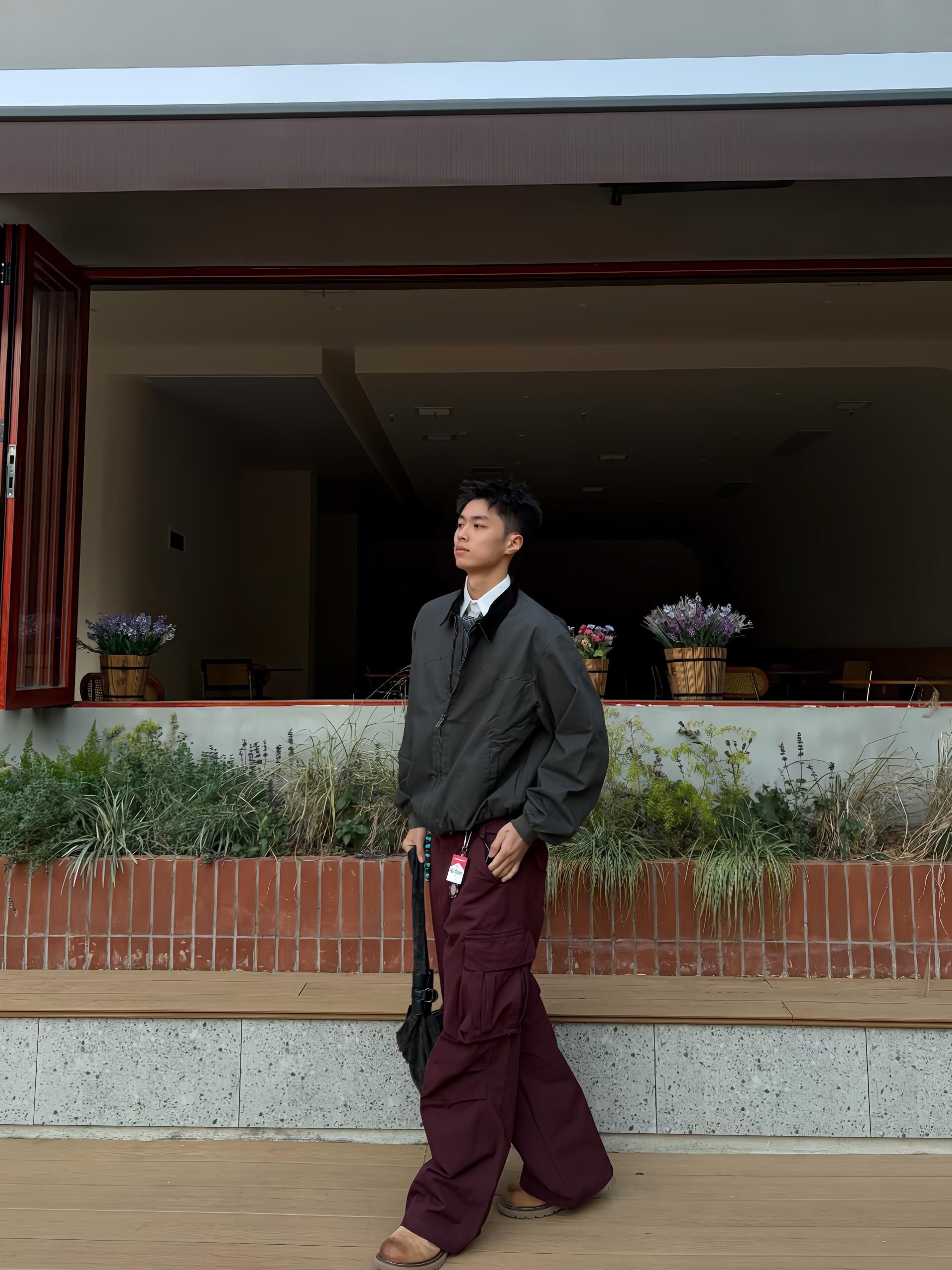 今天搭配一件很有质感的灰色夹克 里面用领带做修饰 再加上一条紫红色伞兵裤 街头感又不缺优雅 这套穿搭你get到了吗