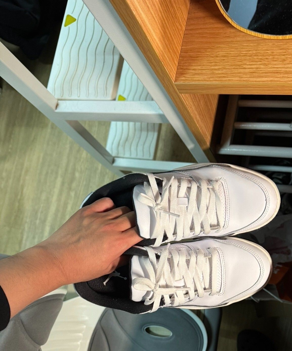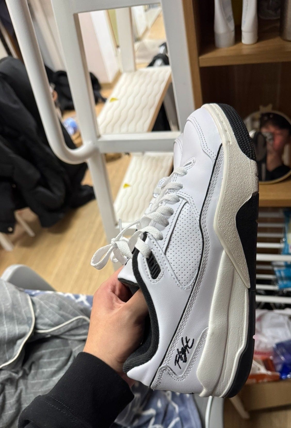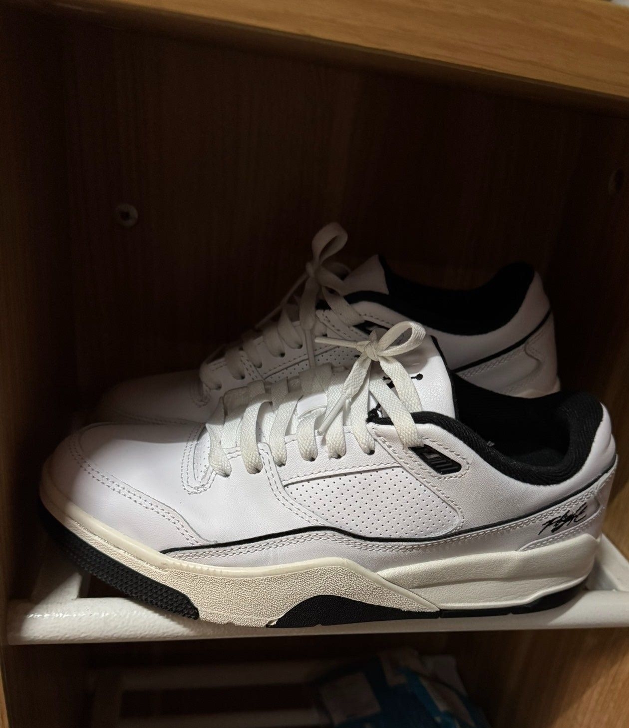 Jordan FLIGHT COURT 白黑色 鞋身为皮革材质,皮革柔软弯折不卡脚,白色鞋面,百搭不耐脏,但皮革鞋面易打理,,内衬填充饱满,网布材质,布料顺滑,不起球。 中底为泡棉材质,脚感较软,走路跑步不会拖沓,休闲和运动融合的风格,适应多种场合,更好搭配衣服。橡胶大底防滑耐磨性不错。 尺码标准,鞋舌不挤压脚面,正常选择就可以。