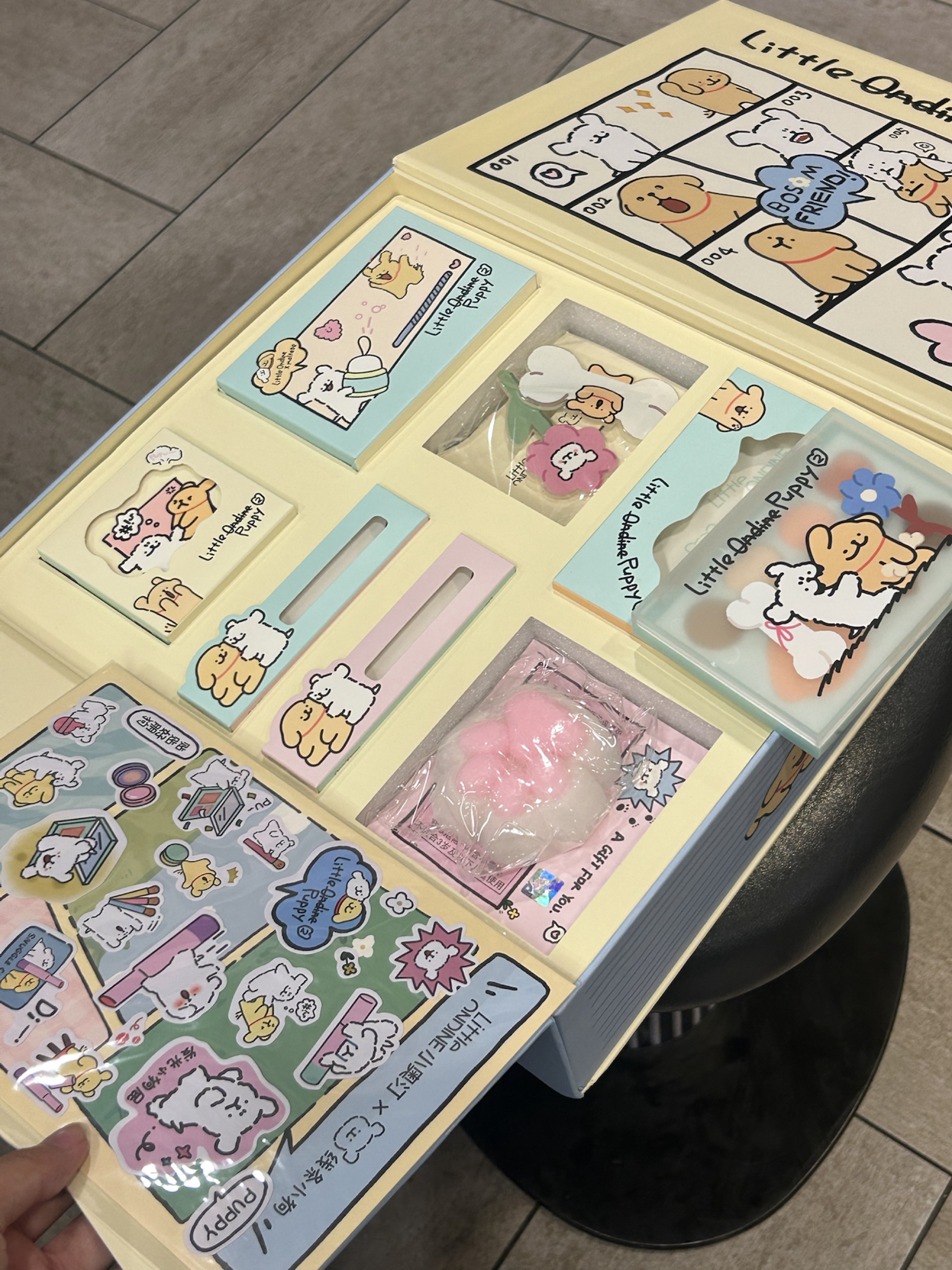 不是我说 小奥汀线条小狗联名礼盒尊滴吼吼看 连包装盒满满都是可爱的线条小狗 对于这种可爱又实用的彩妆礼盒我是真的无法抵抗 里面有多用盘+唇蜜+高光盘 还有小狗水杯 发夹 捏捏乐和贴纸 摸鱼时间我就喜欢捏那个捏捏 好解压 多用盘跟高光膏对新手挺友好的 简单实用 唇蜜色系偏日常 早八我出门化伪素颜喜欢涂它 我觉得这套性价比蛮高的 自留或者送女生都合适!