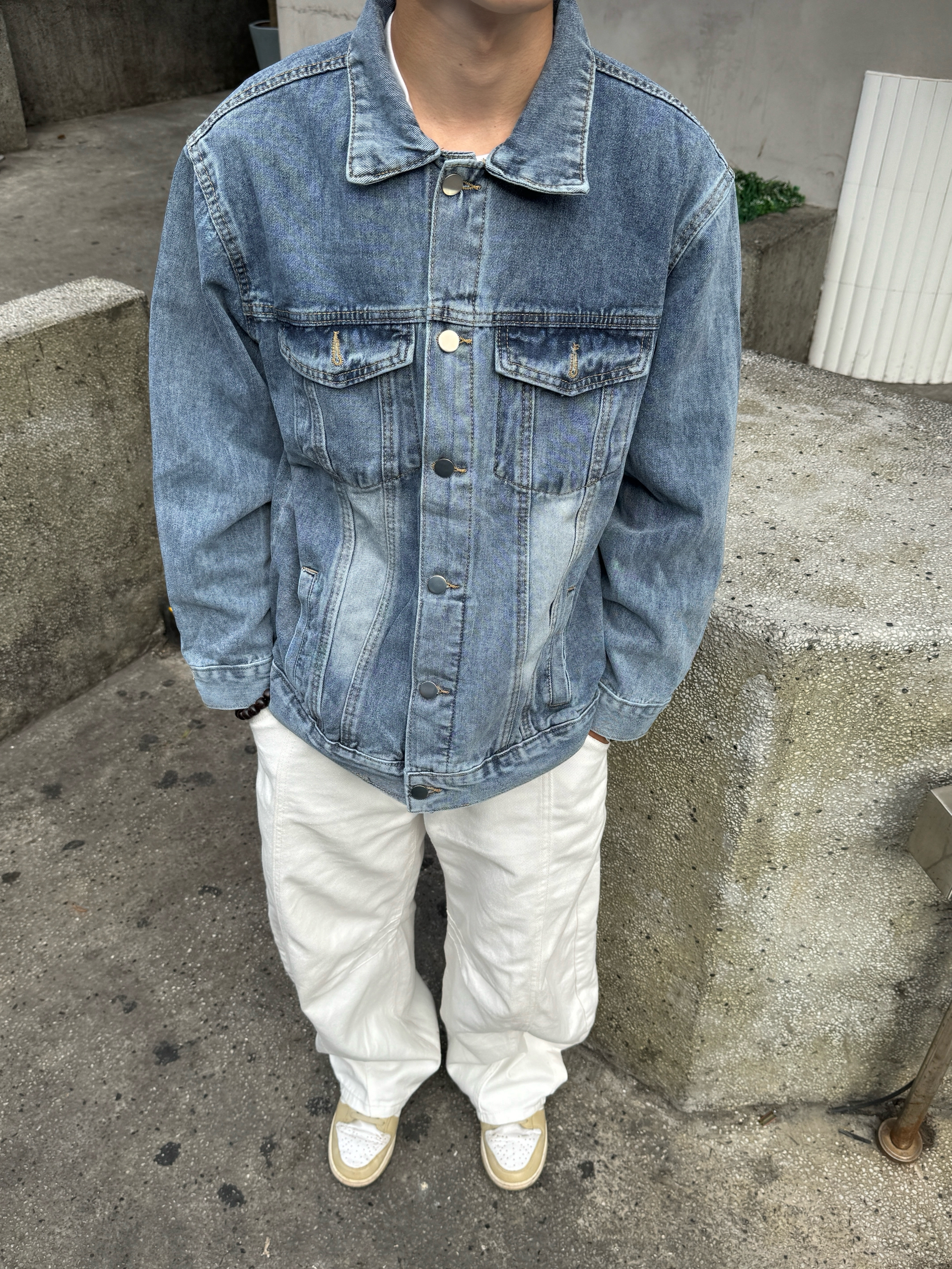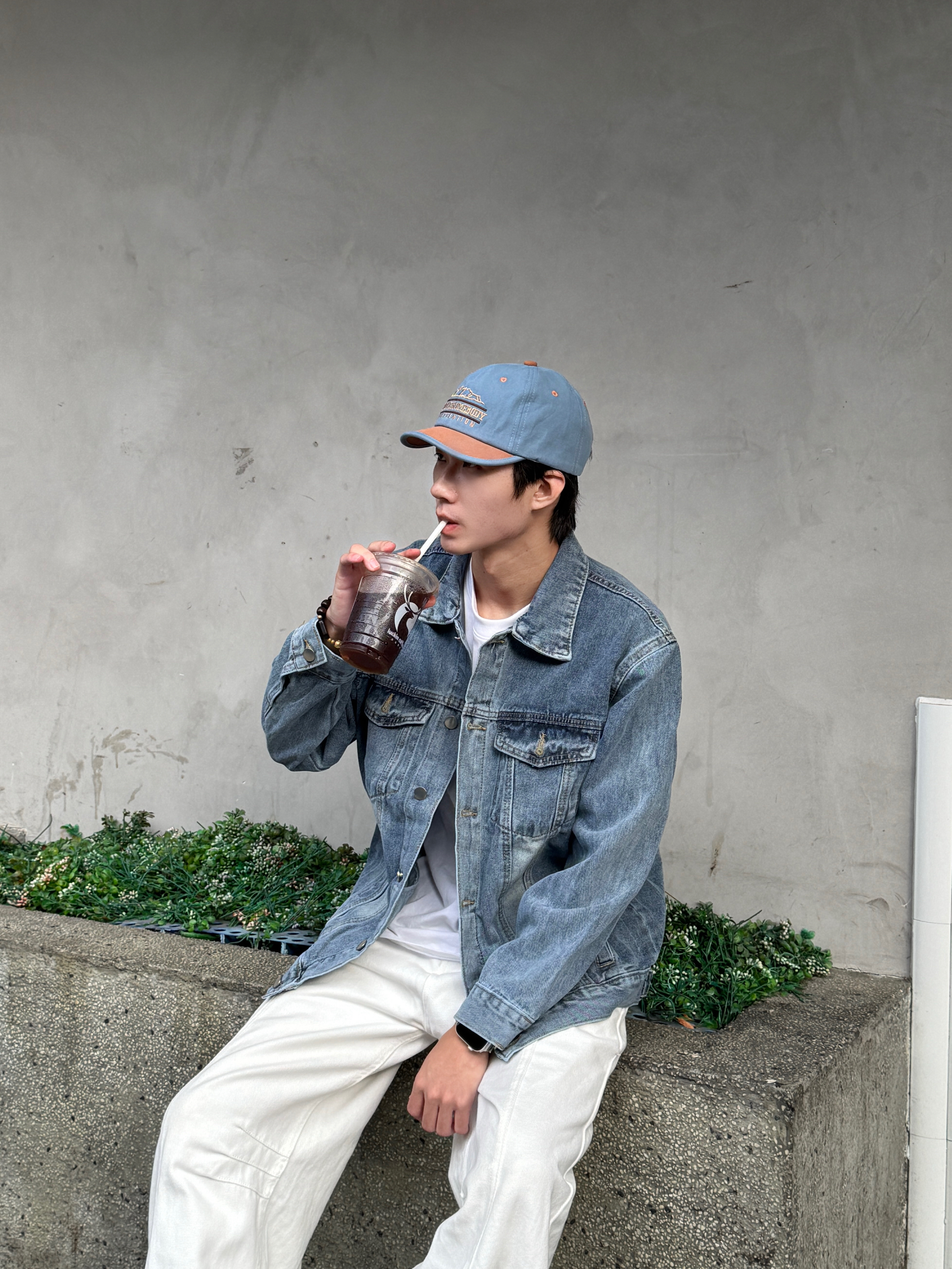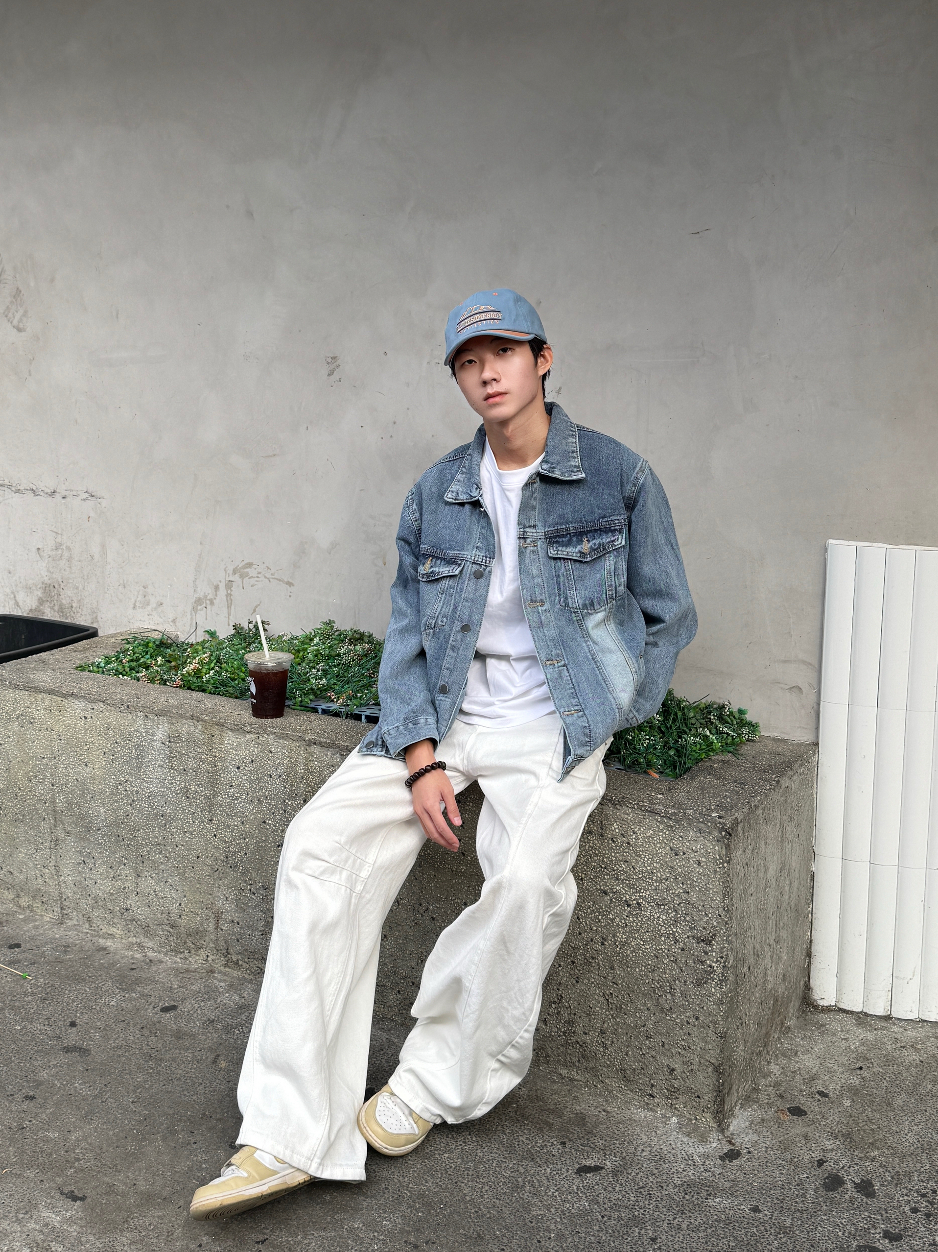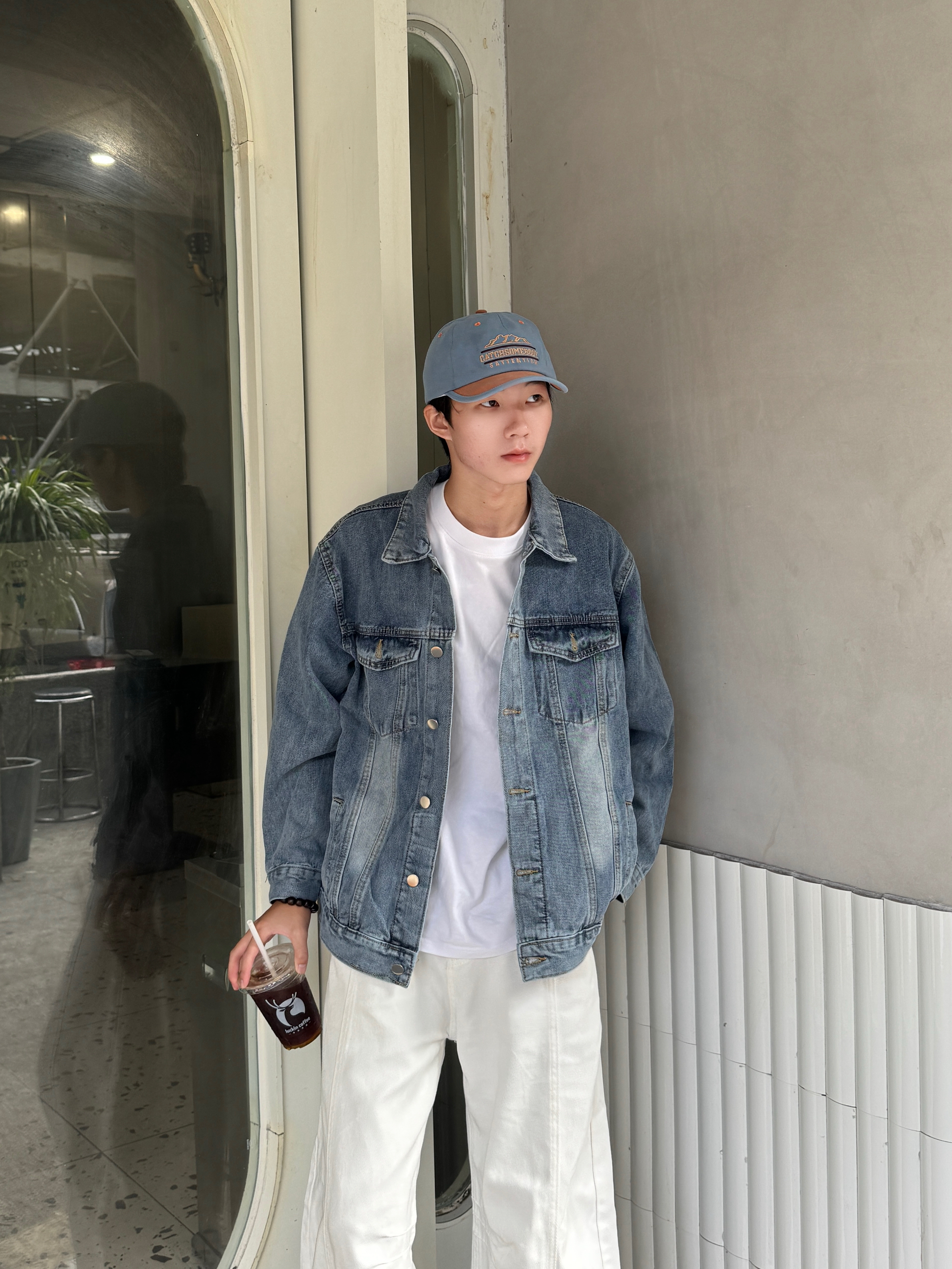 今日份清爽盐系穿搭 全身以蓝白为主色调 这件蓝色水洗牛仔外套质感超棒 做旧翻领加工装口袋设计复古又硬朗🧩 内搭基础白T恤 下身是超特别的白色弯刀牛仔裤 剪裁超显腿长 同色系蓝帽子呼应整体 一身干净又时髦 少年感扑面而来~✨