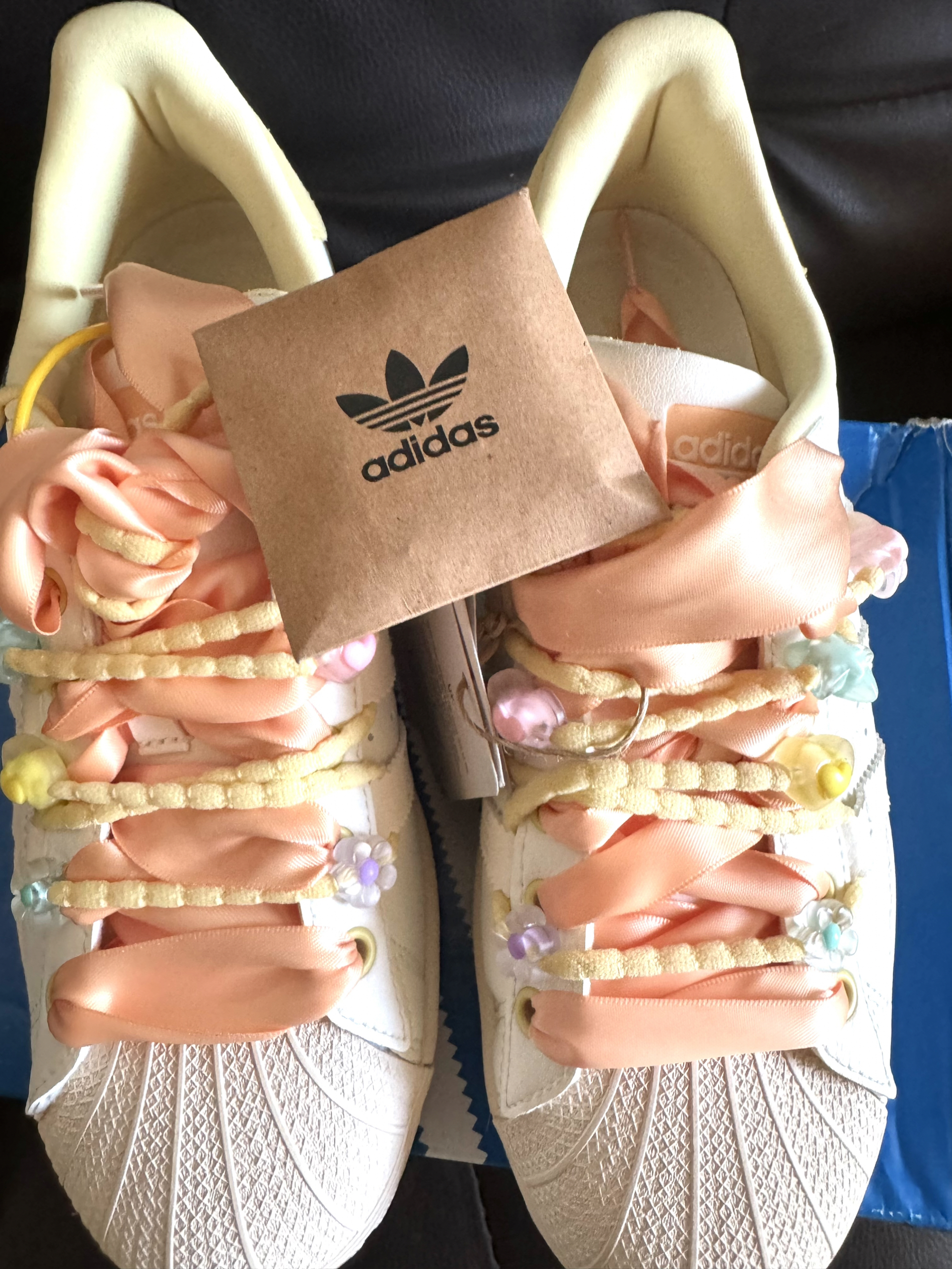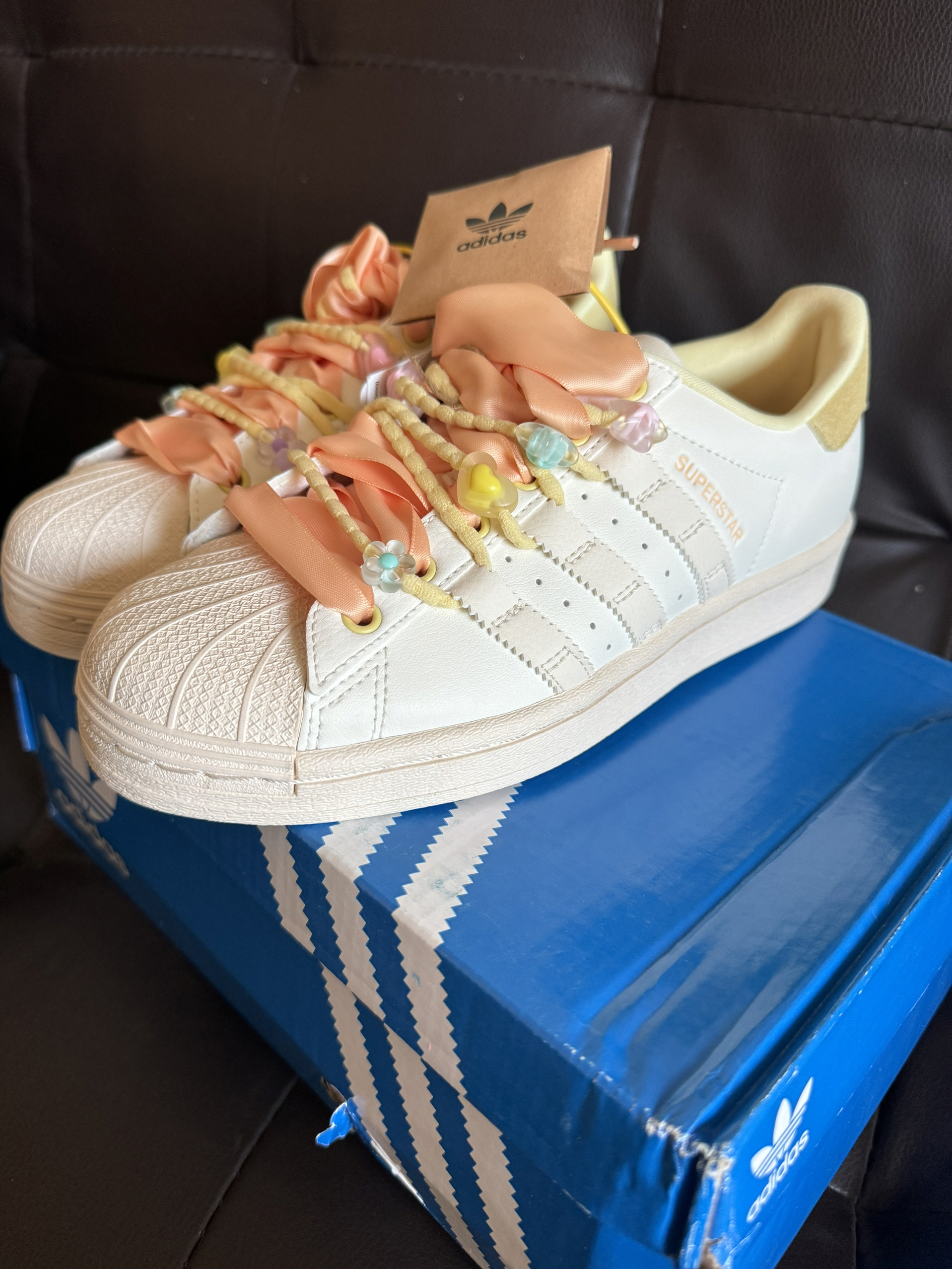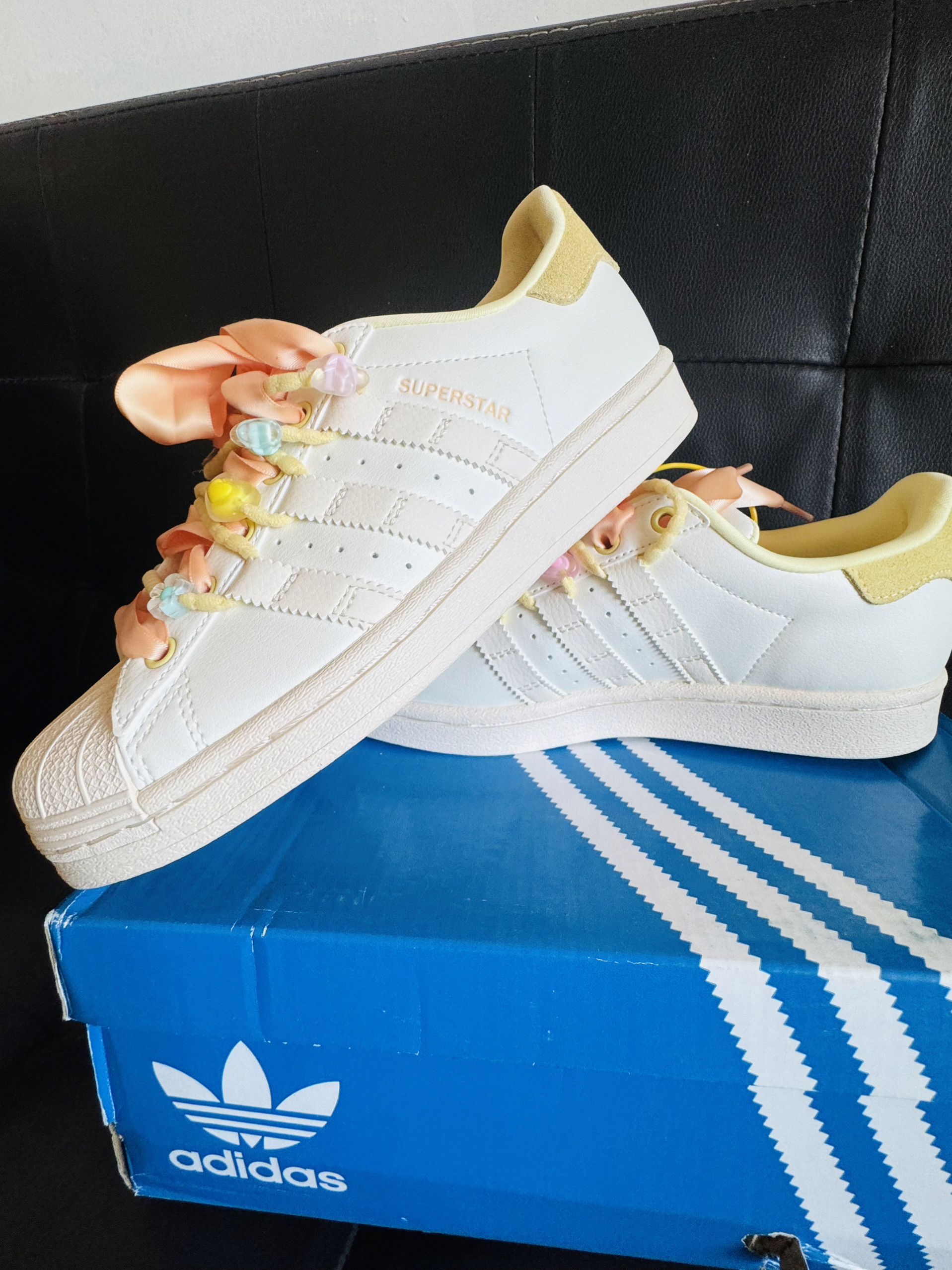 宝子们!新人第一次挖到这么戳少女心的鞋!这双阿迪Superstar真的是把“温柔甜妹”焊在鞋上了! • 颜值暴击:奶fufu的米白色鞋身+奶油黄鞋尾,鞋带直接换成了柔雾粉缎带+马卡龙小花/星星装饰,连鞋盒里都带着阿迪的小卡片,拆开快递那一刻直接被可爱晕✨ • 经典款+小心机:贝壳头本来就是百搭王,这双加了缎带和小装饰后,甜而不腻,配裙子/牛仔裤都能直接封神,走路都自带温柔滤镜~ ...
