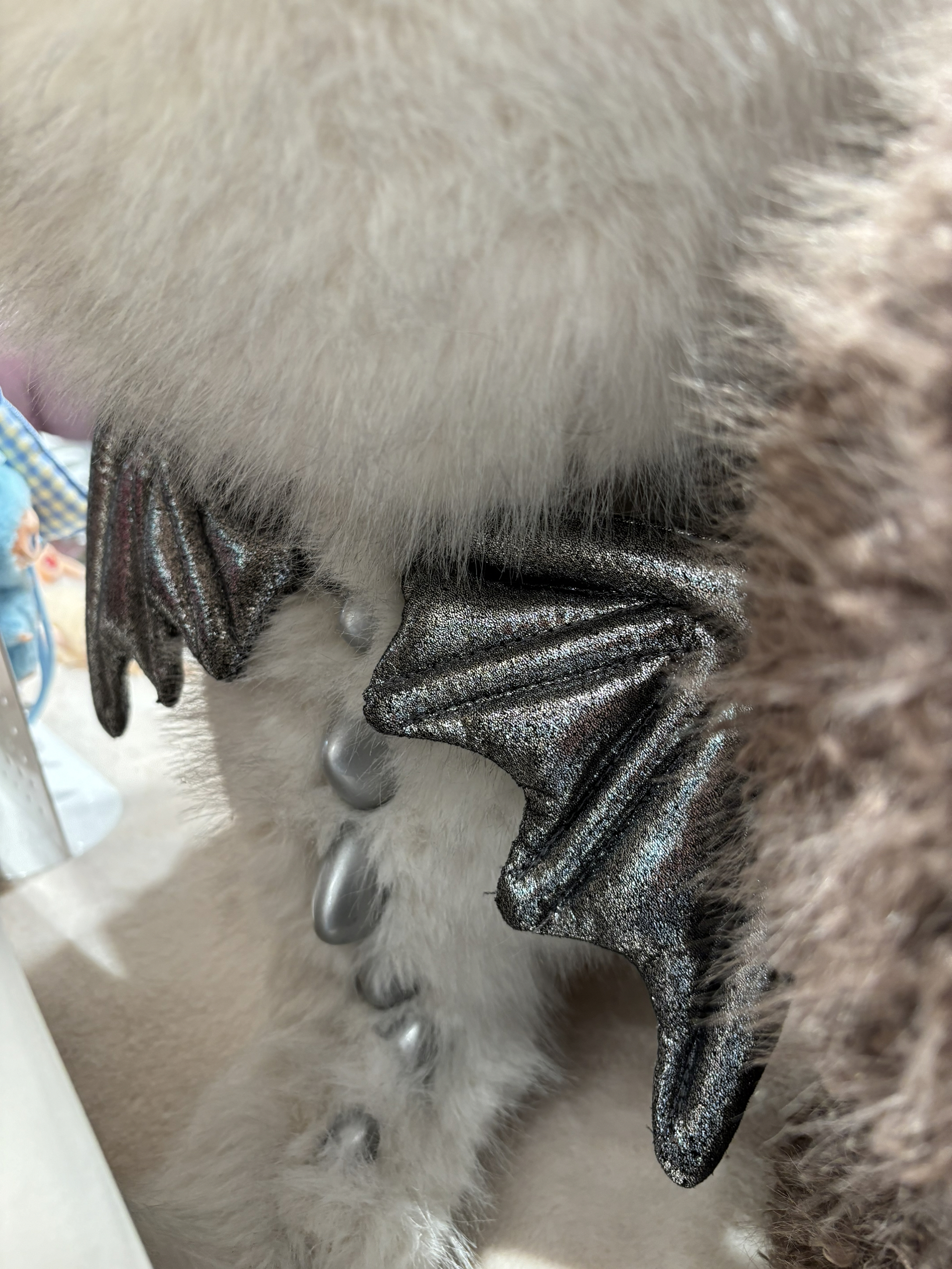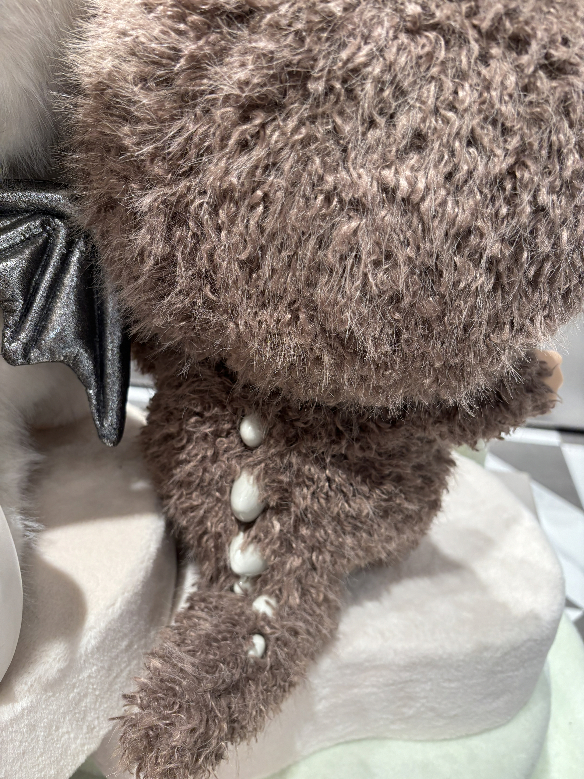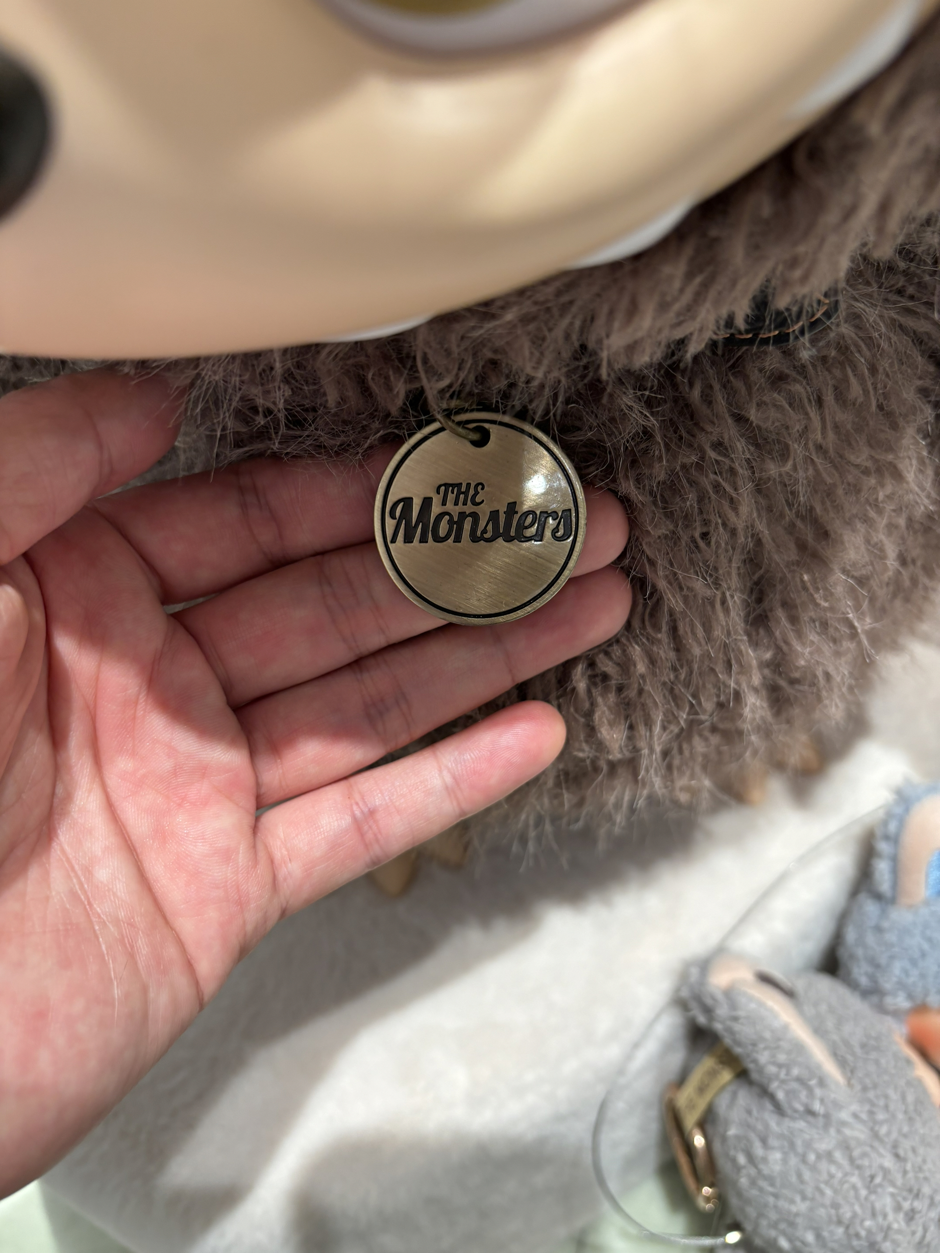 造型:以原始部落首领为主题,58cm超大尺寸,棕色毛发搭配金色星星眼,自带皮质项圈和名牌,身后有超大尾巴,手部为伸手pick造型。 材质:采用搪胶材质,内部填充防震材料,关节处内置软骨,可自由调整姿势。