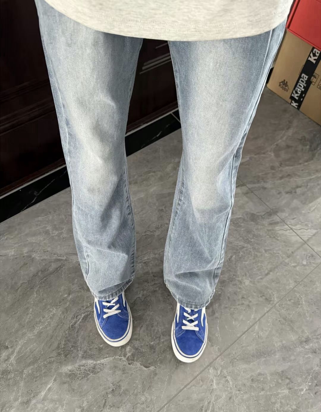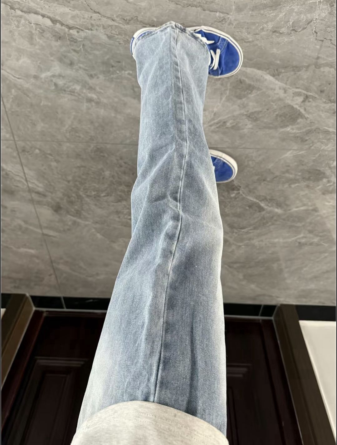 浅蓝微喇神裤!Cleanfit战神驾到 这条浅蓝色水洗牛仔裤简直是美式高街的天花板!一 上身那种清爽又时髦的cleanfit vibe直接拉满,修身效 果绝绝子补水洗浅蓝调得太高级了!带着自然的磨白和落色效果,比深色更清爽有少年感。微喇裤型才是真正的显瘦黑科技!从膝盖处开始微微扩张,完美隐藏小腿肌肉,视觉上拉长腿部线条~直筒设计对腿型包容度极 高,什么O型腿X型腿都能给你修饰得明明白白 面料是带点...