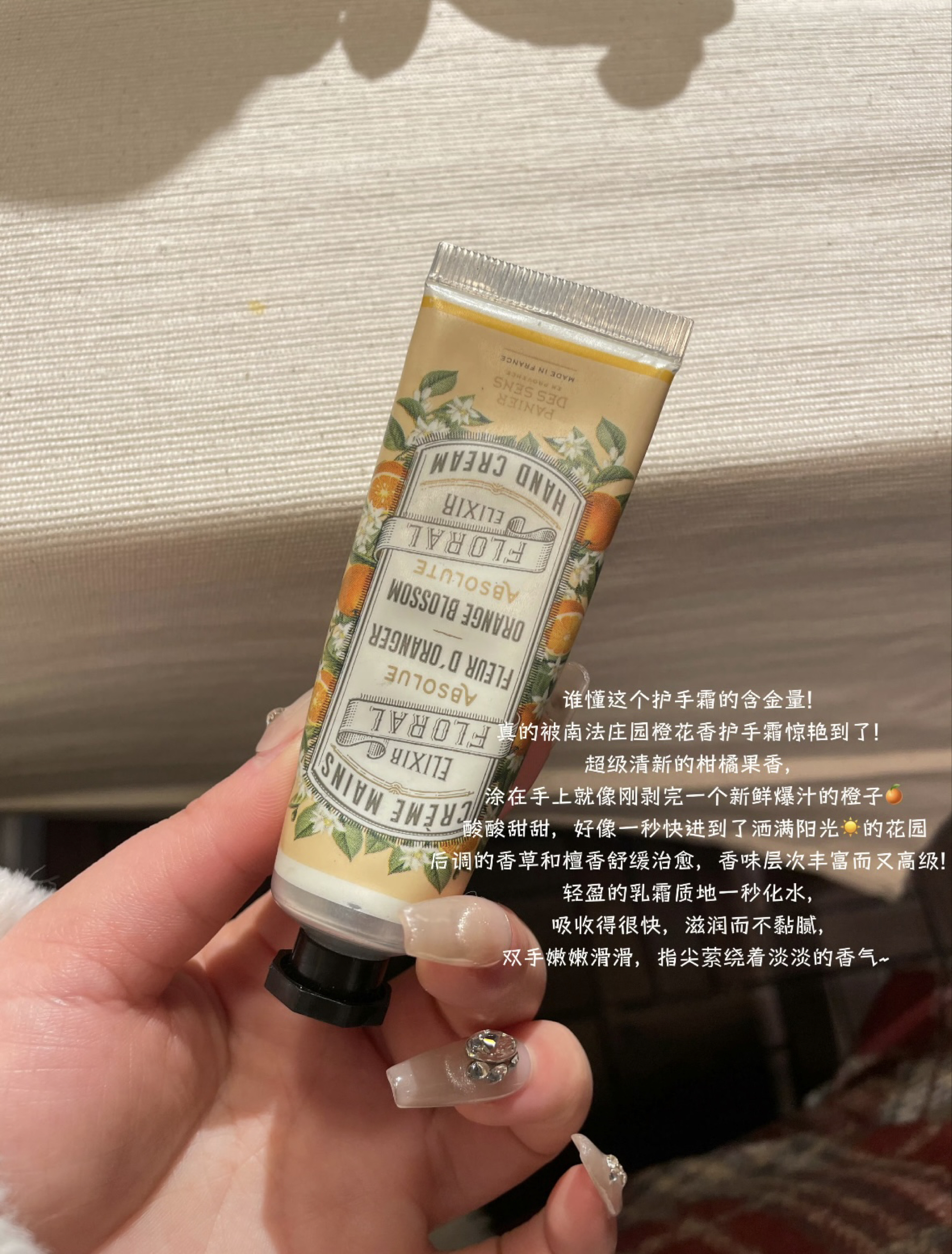 南法庄园橙花香护手霜的柑橘果香超清新,乳霜质地一抹化水,滋润不黏腻还带着高级香气;奥普蜂蜜唇油20块钱就能拿下,睡前当唇膜用,死皮都能轻松抚平;brookesia气垫是干敏皮天菜,80%水分精华上脸服帖又保湿,持妆还不暗沉;珀莱雅红宝石水乳霜旅行装更是出行必备,胜肽组合补胶原超给力,小小支揣包里超方便,每一样都踩在我的心巴上~