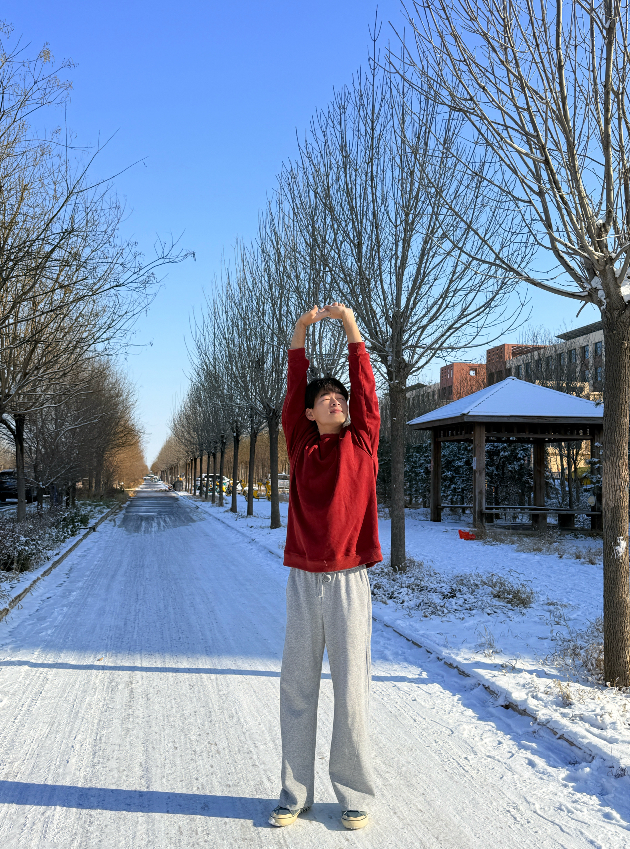 红色卫衣配雪景也太搭了吧❄️随手拍的ootd,灰色裤子也是懒人的福音,卫衣和裤子的材质都是纯棉的,鞋子我选的是蓝色板鞋,宽松款的搭配穿起来超舒服慵懒感很足,缺点就是天气很冷的话要外穿羽绒服或者棉服。你们喜欢这样的风格吗?身高|体重: 🧍♂️ 穿搭风格:慵懒风 👔 上衣:红色卫衣 👖 下装:灰色宽松裤 👟 鞋子:万斯 🎒配饰: